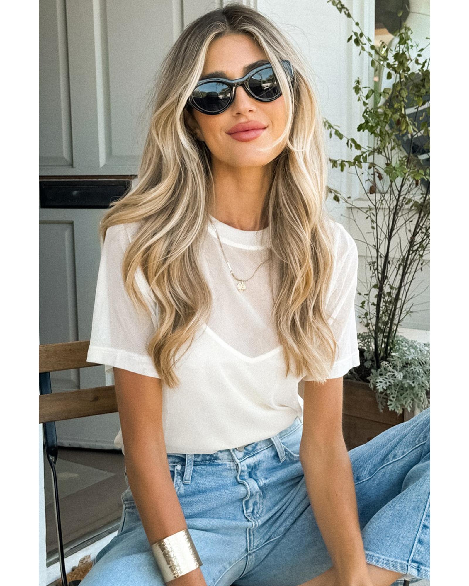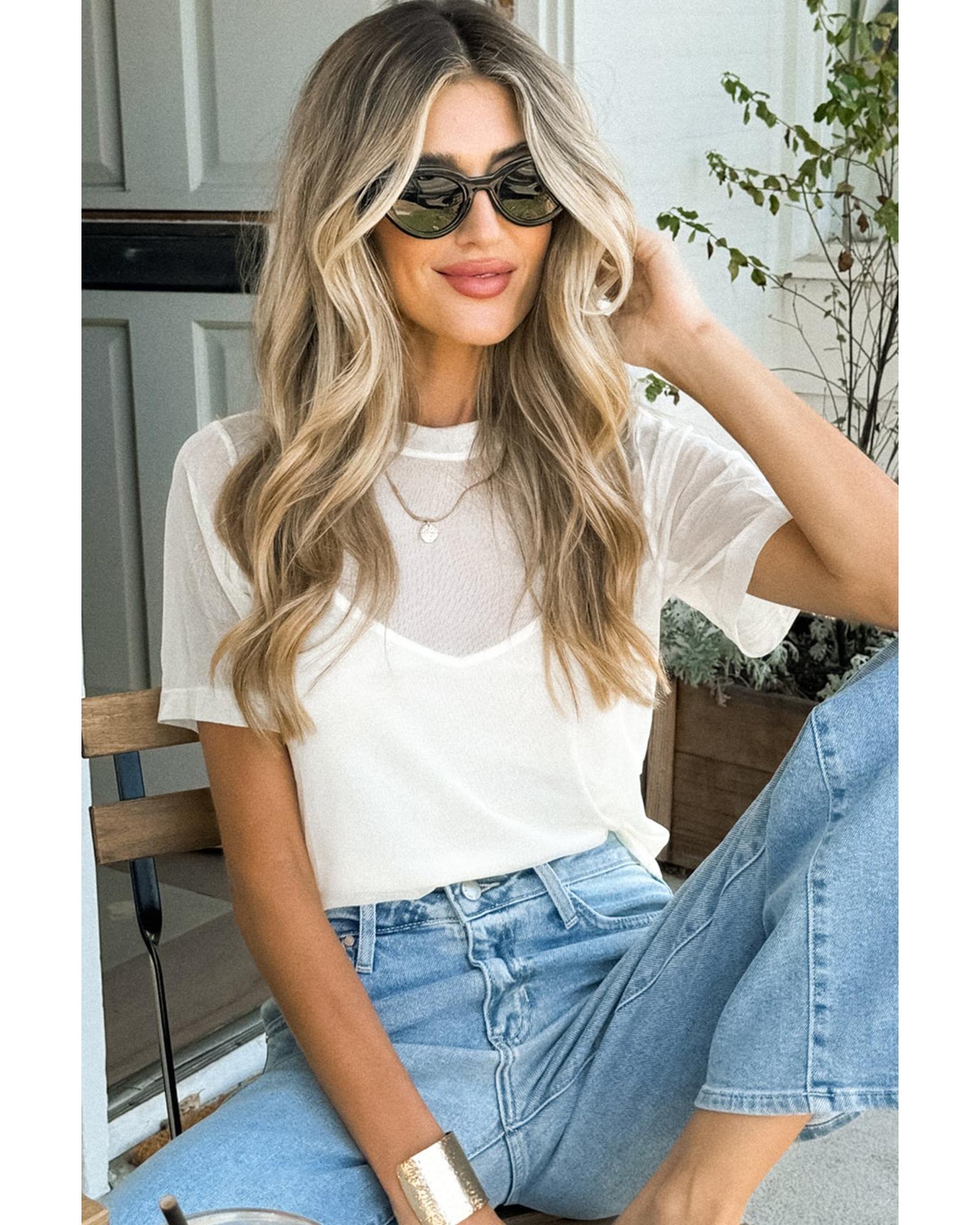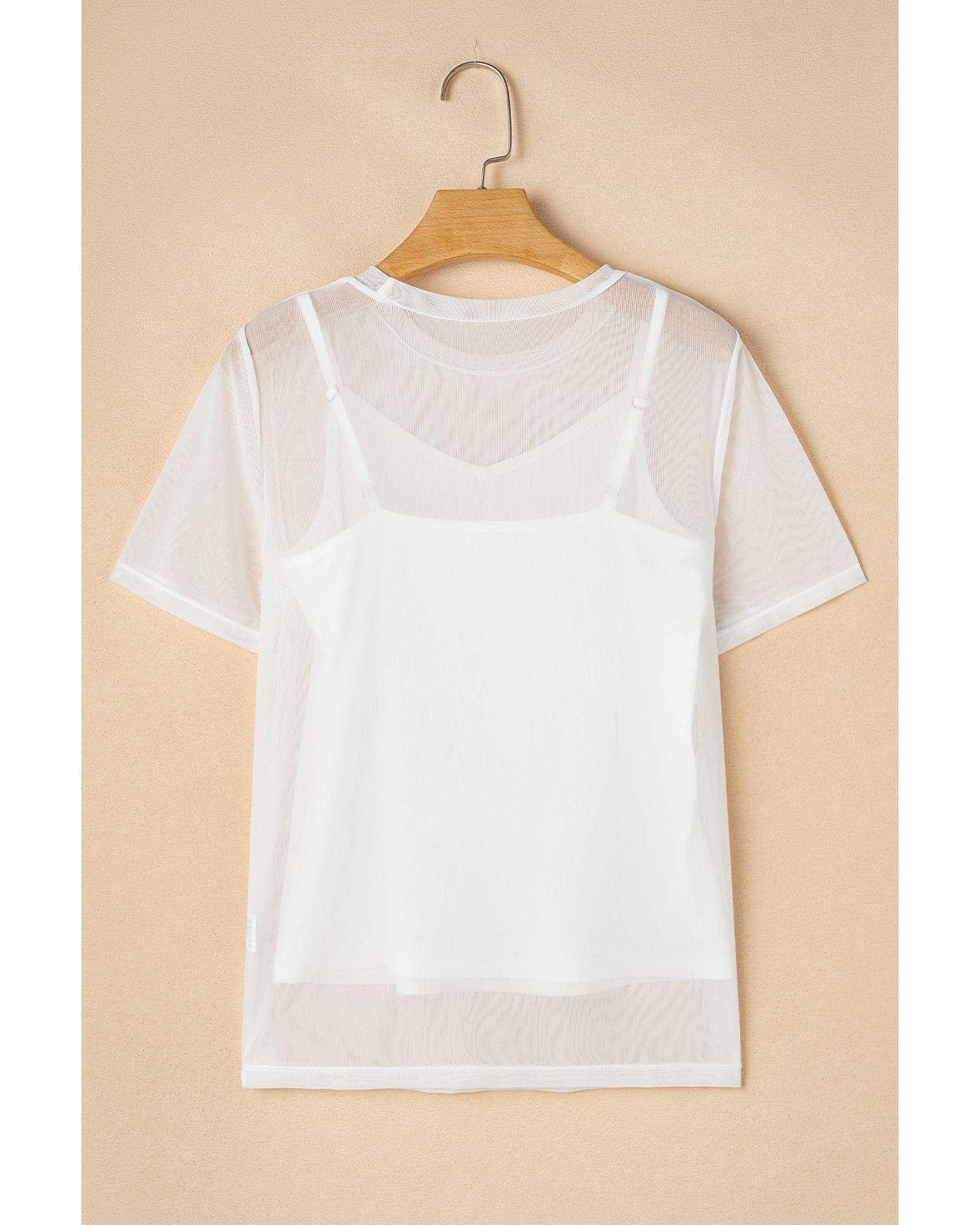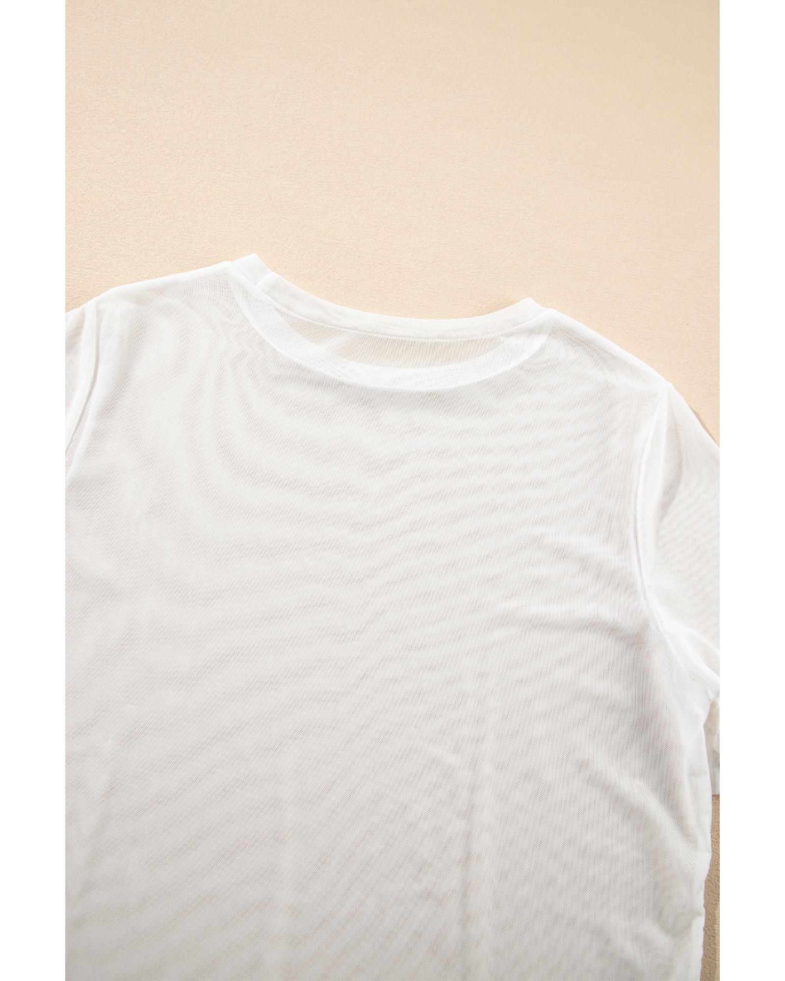 This white solid color short sleeve top features a sheer mesh patchwork design, combining a trendy fitted look with versatile styling options. It is crafted for comfort and style, making it suitable for various occasions.