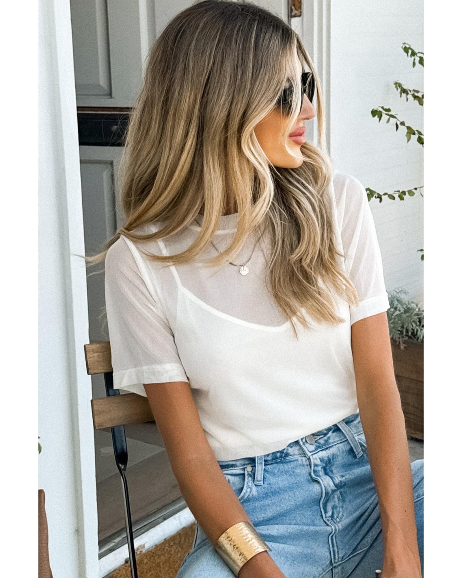 White Solid Color Sheer Mesh Patchwork Short Sleeve Top – XL