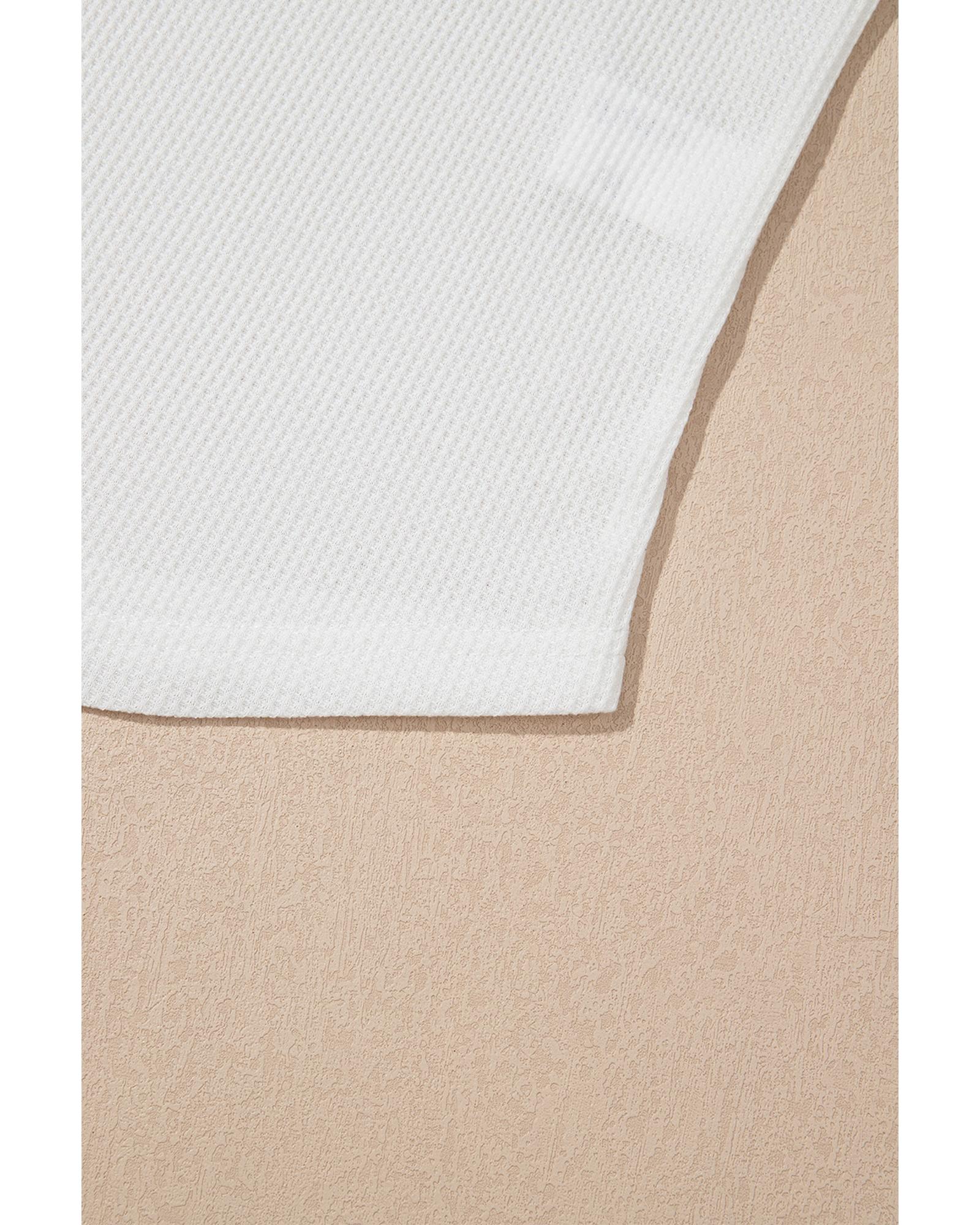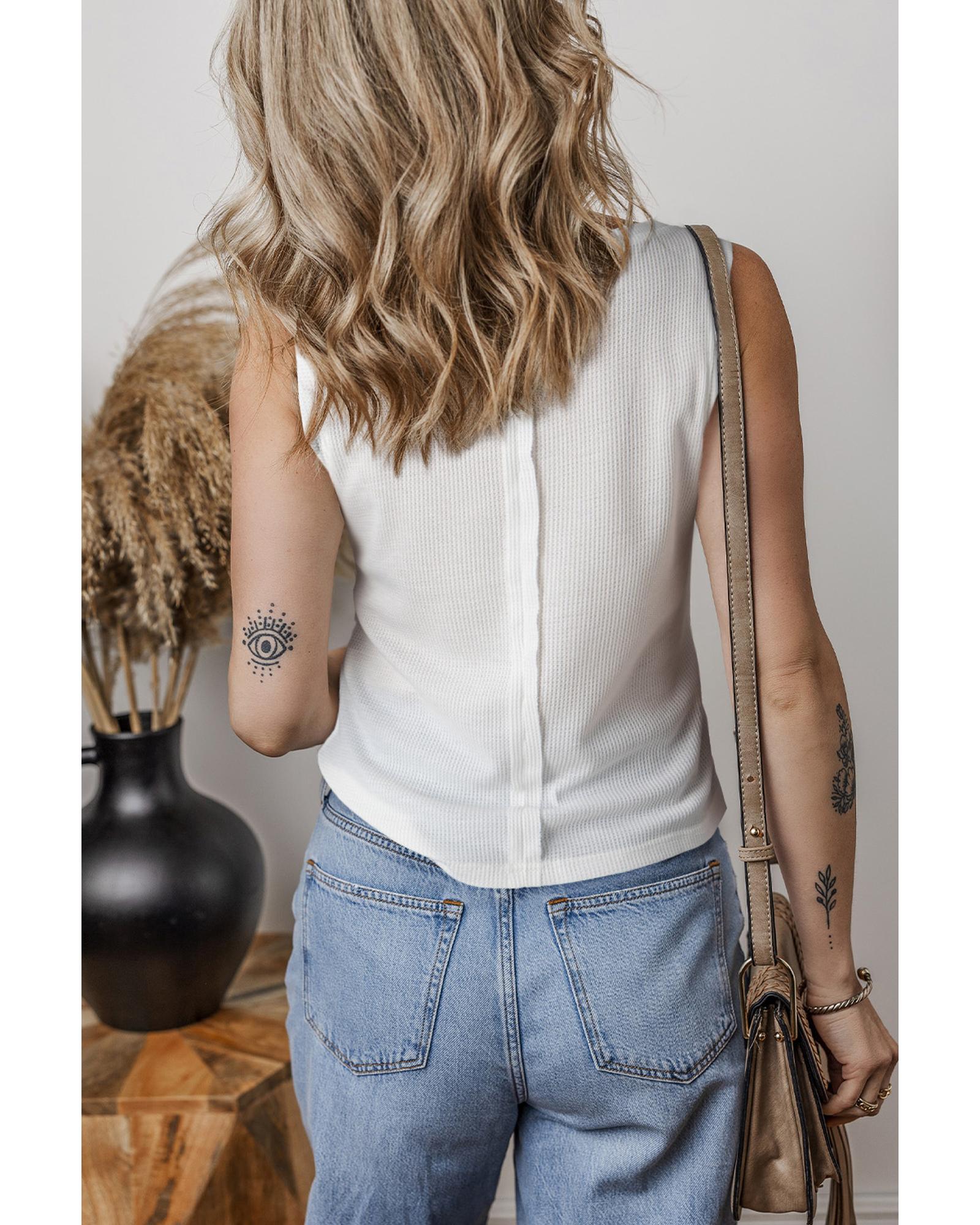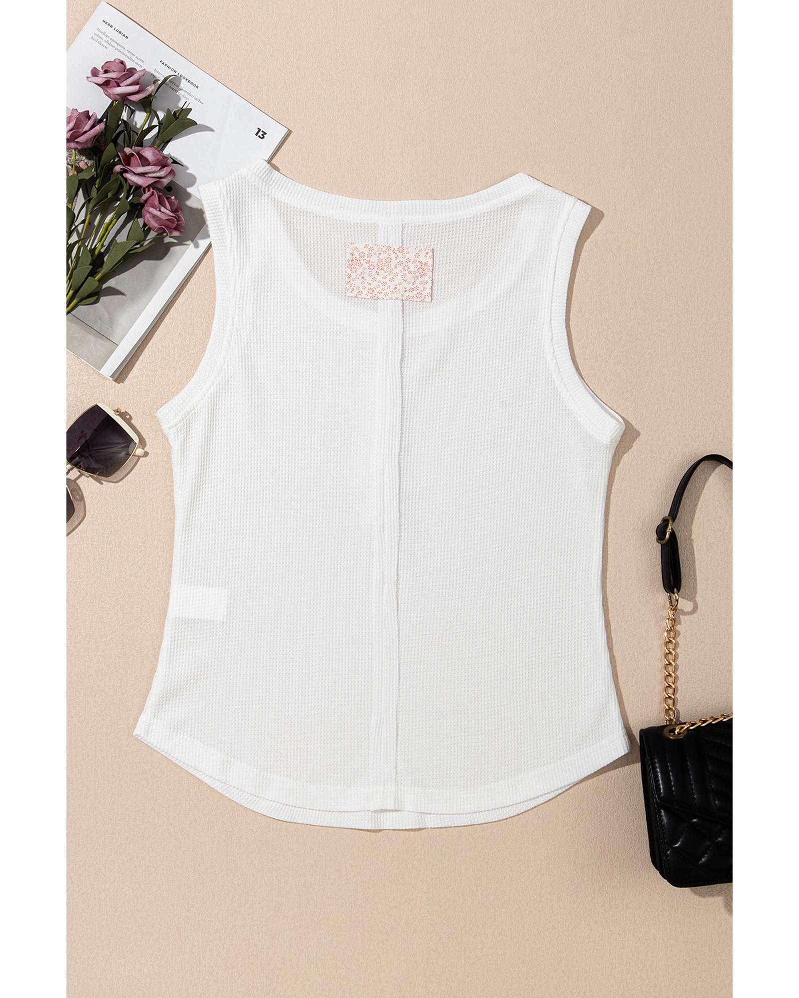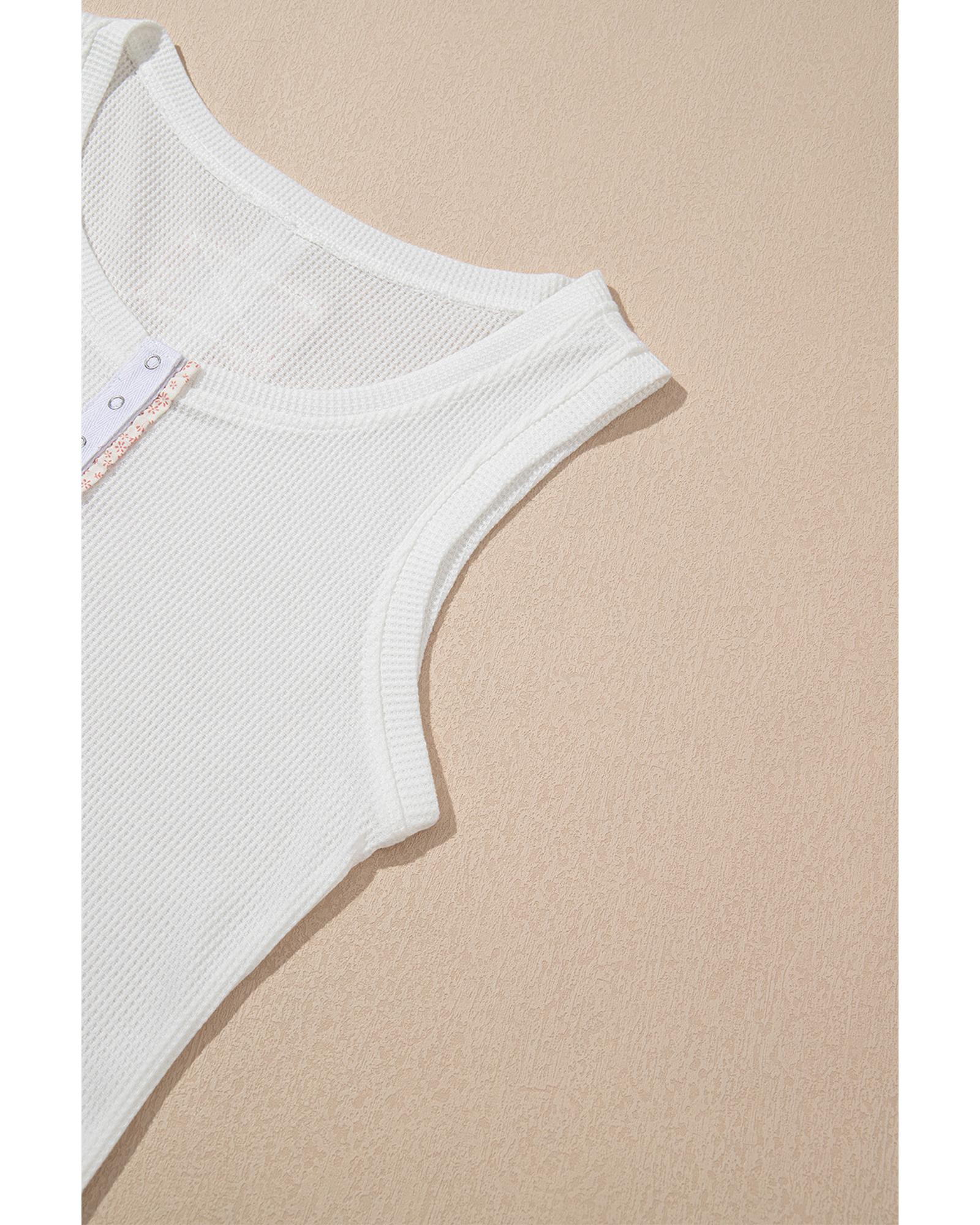 This white solid color waffle knit tank top features a sleeveless design and a half-button front, offering a combination of comfort and style. Its soft texture and versatile appearance make it suitable for various casual outfits.