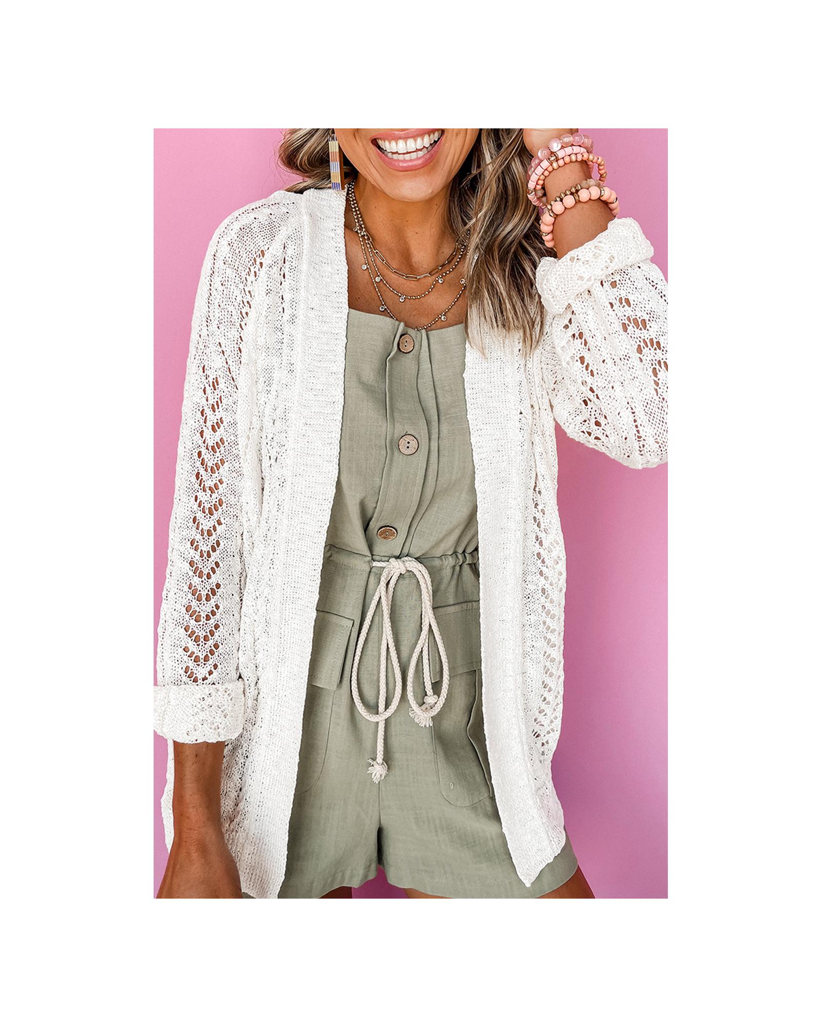 This white solid open-knit cardigan offers a trendy and stylish layering option with a sheer, hollow-out silhouette. Designed for a fitted look, it combines comfort and fashion, making it suitable for various casual or semi-formal outfits.