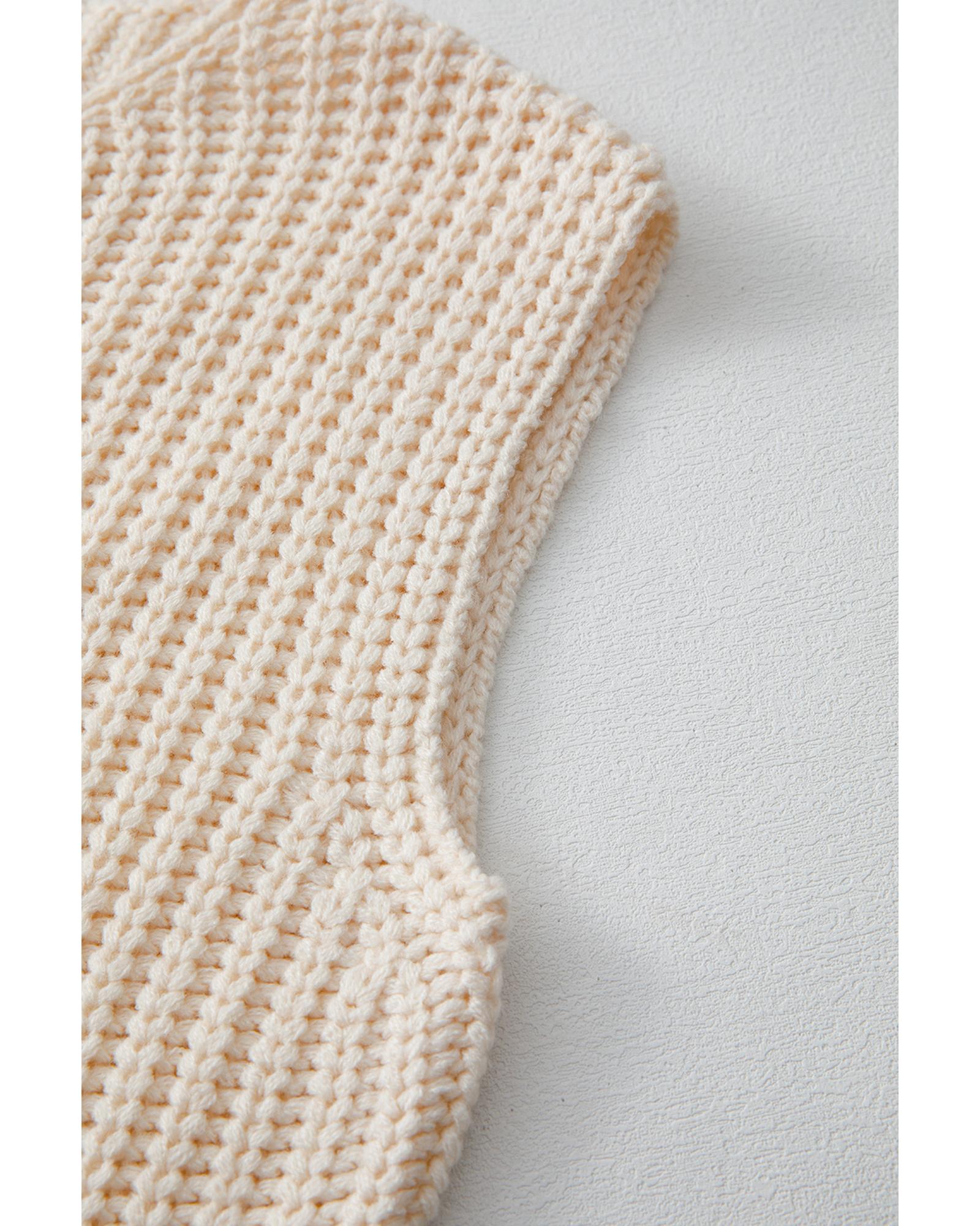 This white textured knit sweater vest features a classic design with a buttoned front closure and sleeveless style, making it ideal for layering. It includes practical side pockets and is crafted from 100% acrylic material, offering both style and functionality.