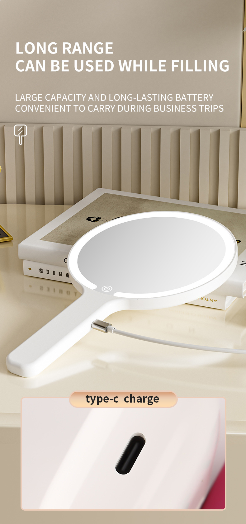This portable handheld LED makeup mirror is designed for on-the-go touch-ups and flawless makeup application. It features adjustable LED lighting with three color modes, high-definition clarity, and a lightweight ergonomic design, making it a convenient beauty tool for travel and daily use.