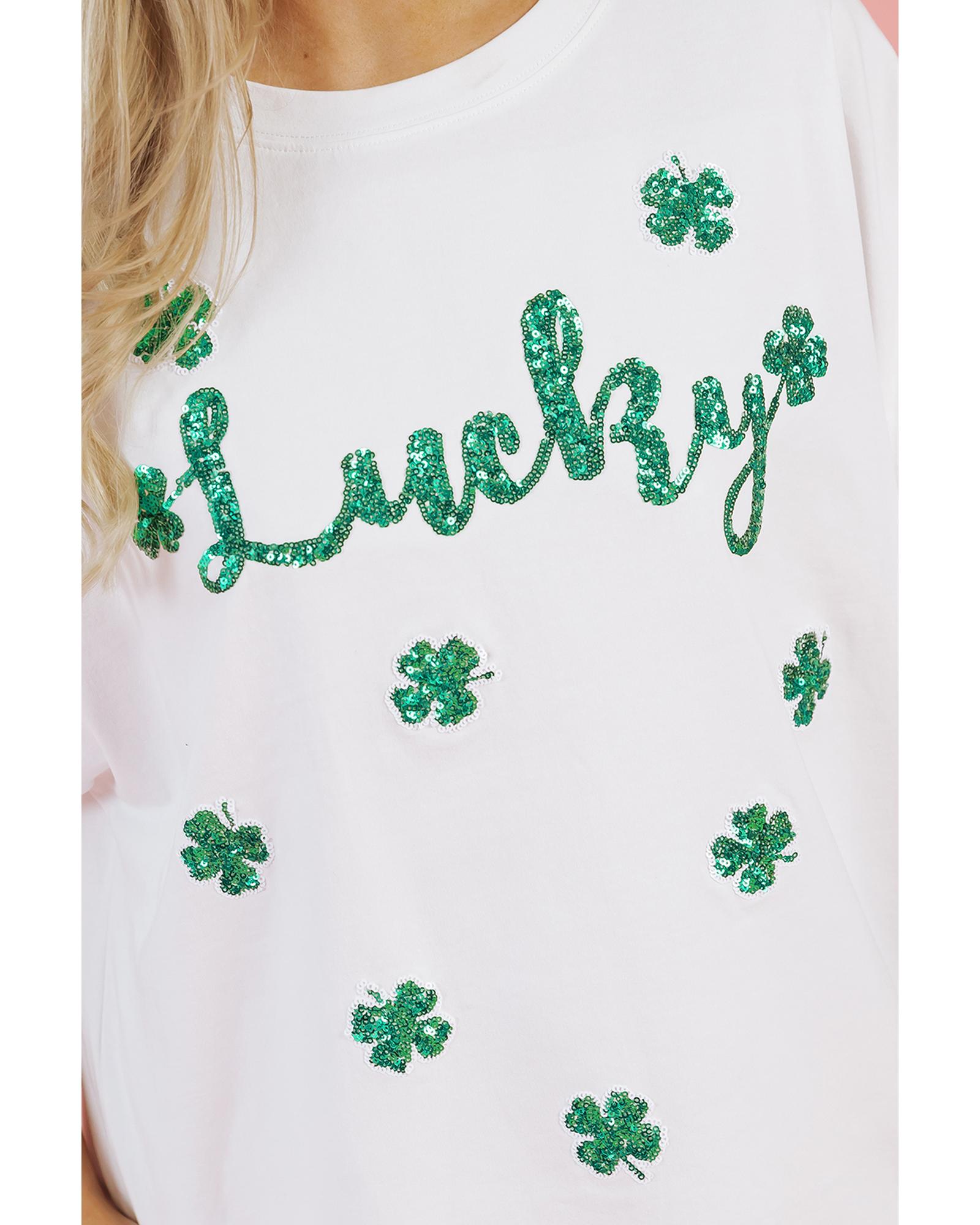 White St Patrick Lucky Clover Sequin Graphic T Shirt – M