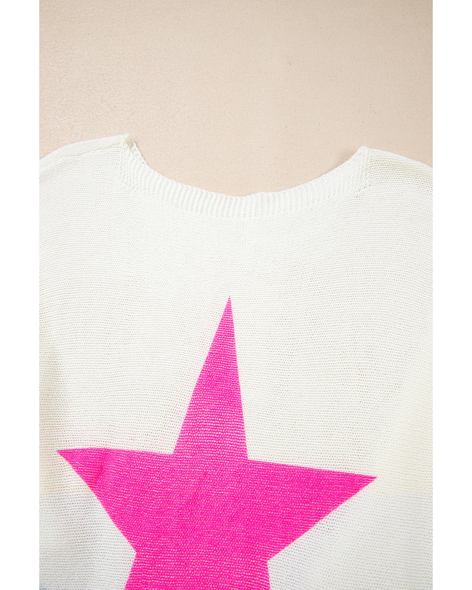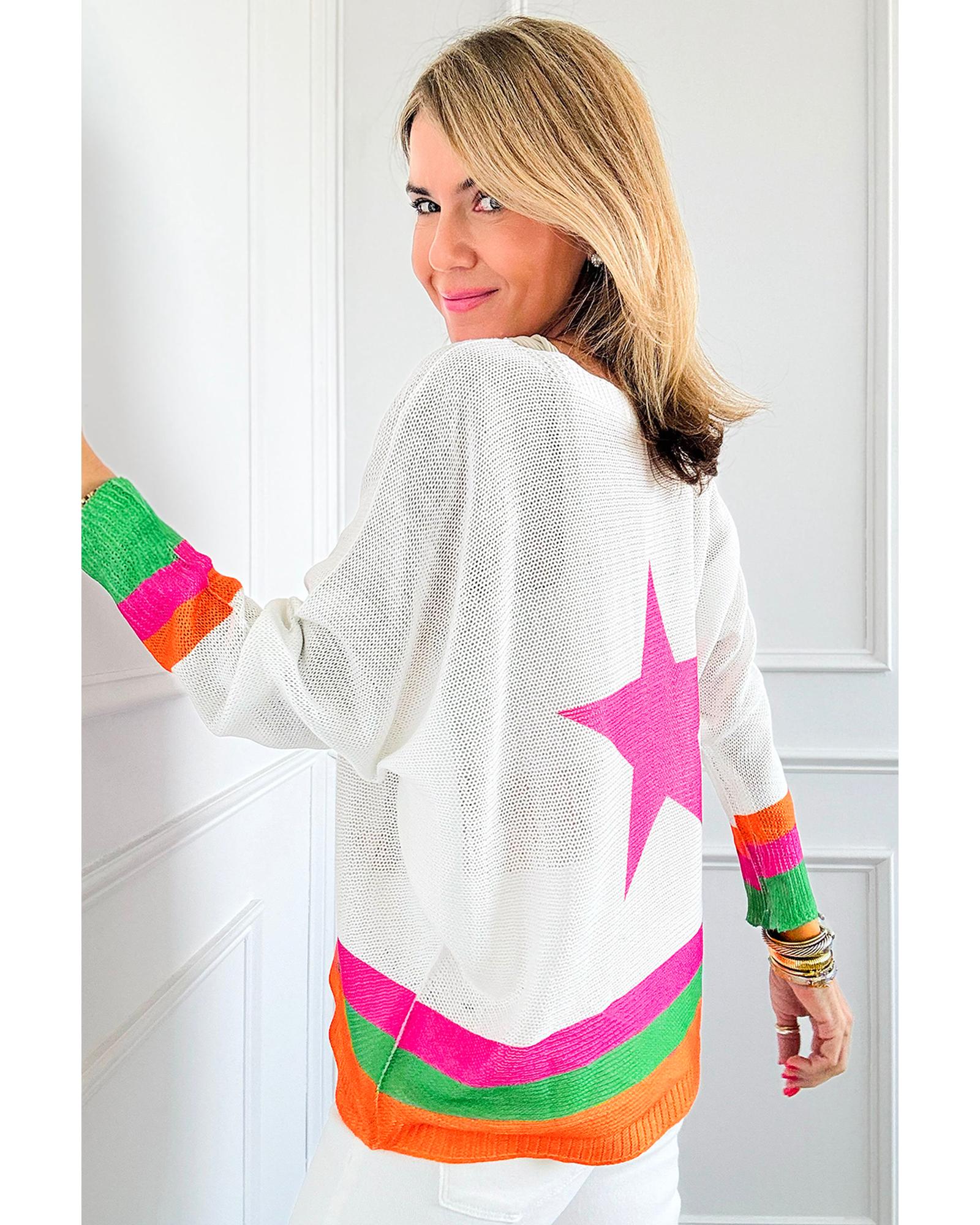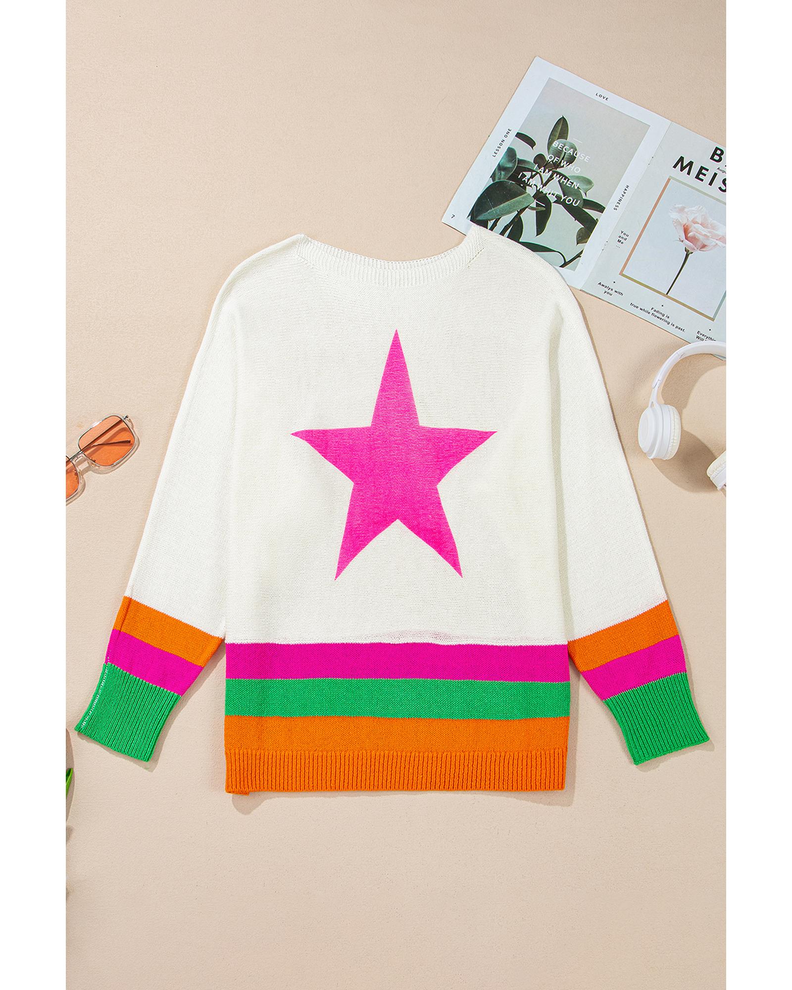 This sweater features a stylish white star pattern combined with a colorblock striped edge design, creating a trendy and eye-catching look. The drop shoulder style offers a relaxed fit, making it comfortable for everyday wear. Crafted from soft and cozy knitted fabric, it provides both style and comfort.