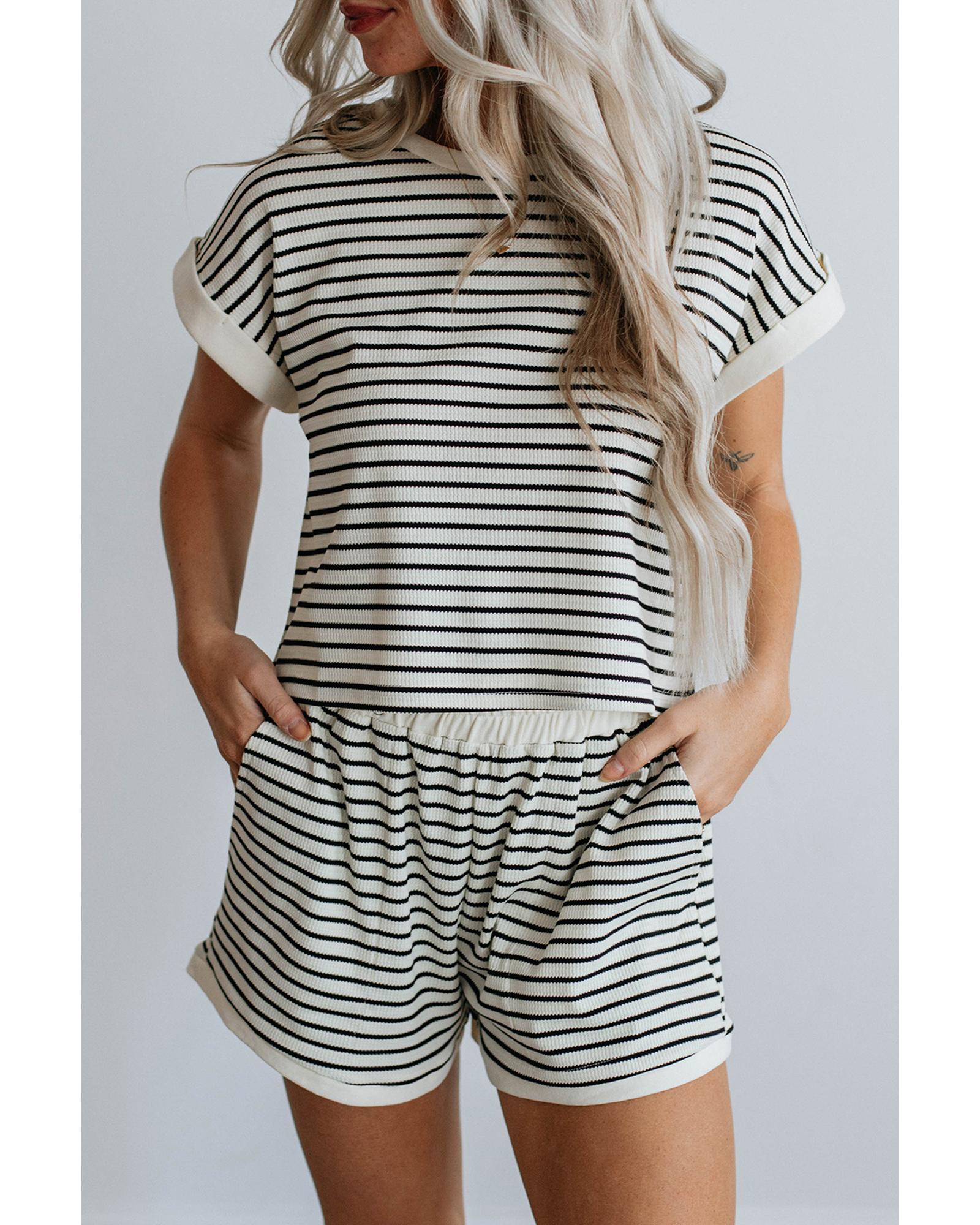This White Stripe Contrast Edge Tee and Shorts Set offers a stylish and comfortable casual look. Designed with a trendy fitted silhouette, it combines classic black and white stripes with a relaxed fit, making it suitable for various activities such as lounging, exercise, or beach outings. The set features high elasticity for a comfortable fit and versatile knit texture.