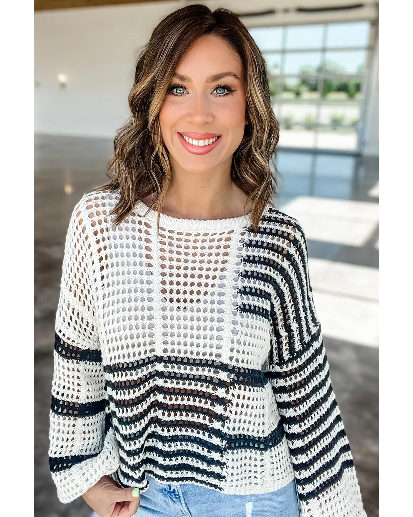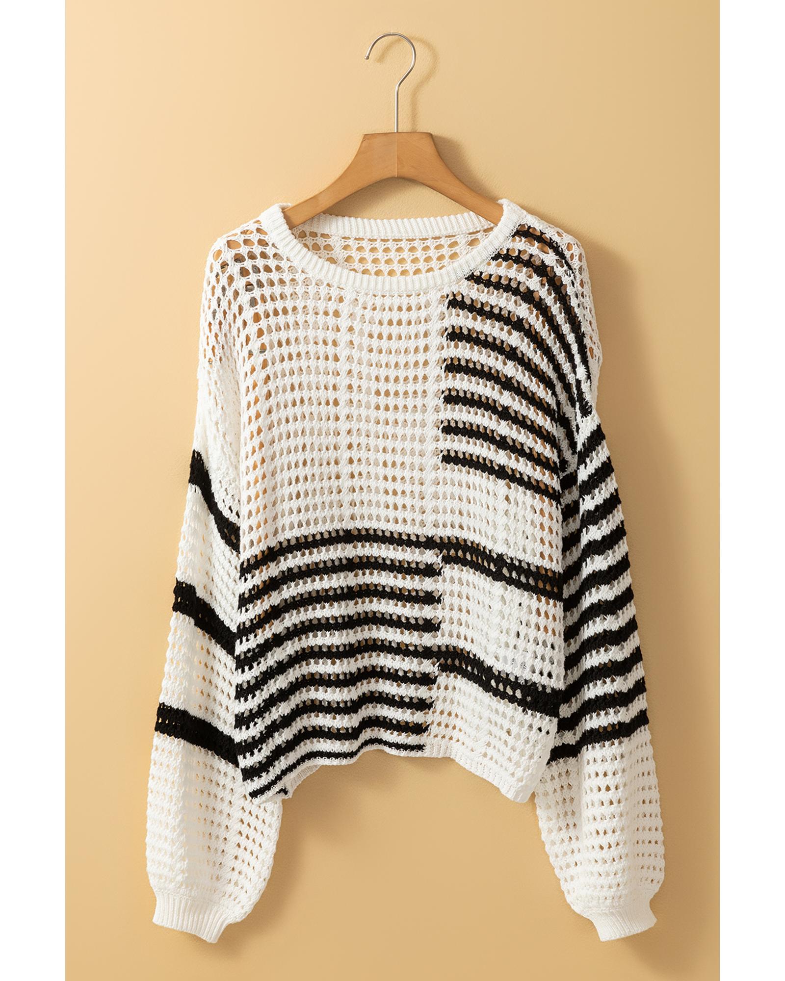 This sweater features a classic and romantic knitted design with a stylish contrast striped pattern that creates a color block effect. The hollow-out silhouette and relaxed fit add a touch of casual elegance, making it suitable for early fall and winter wear.
