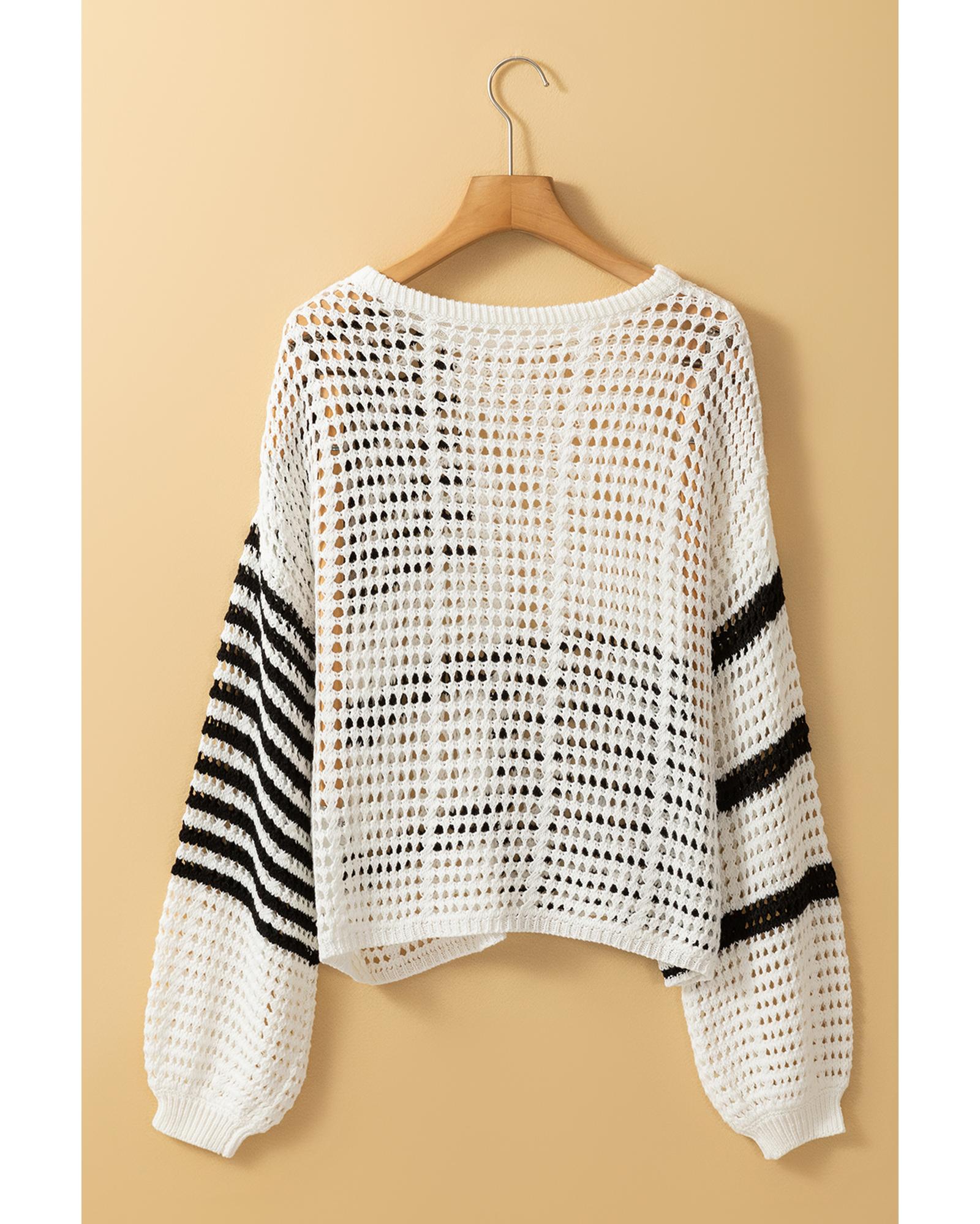 White Stripe Contrast Striped Crochet Puff Sleeve Sweater – L
