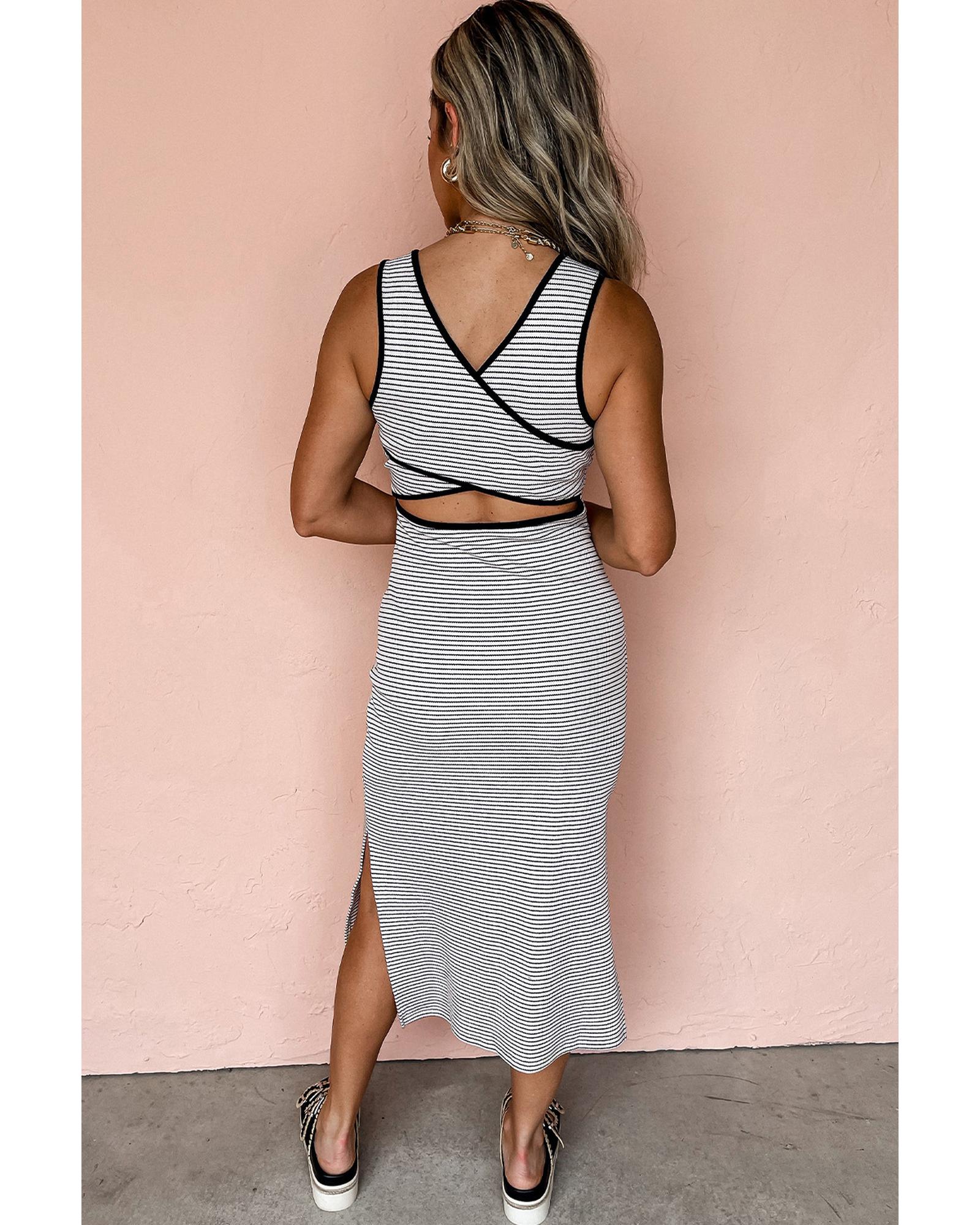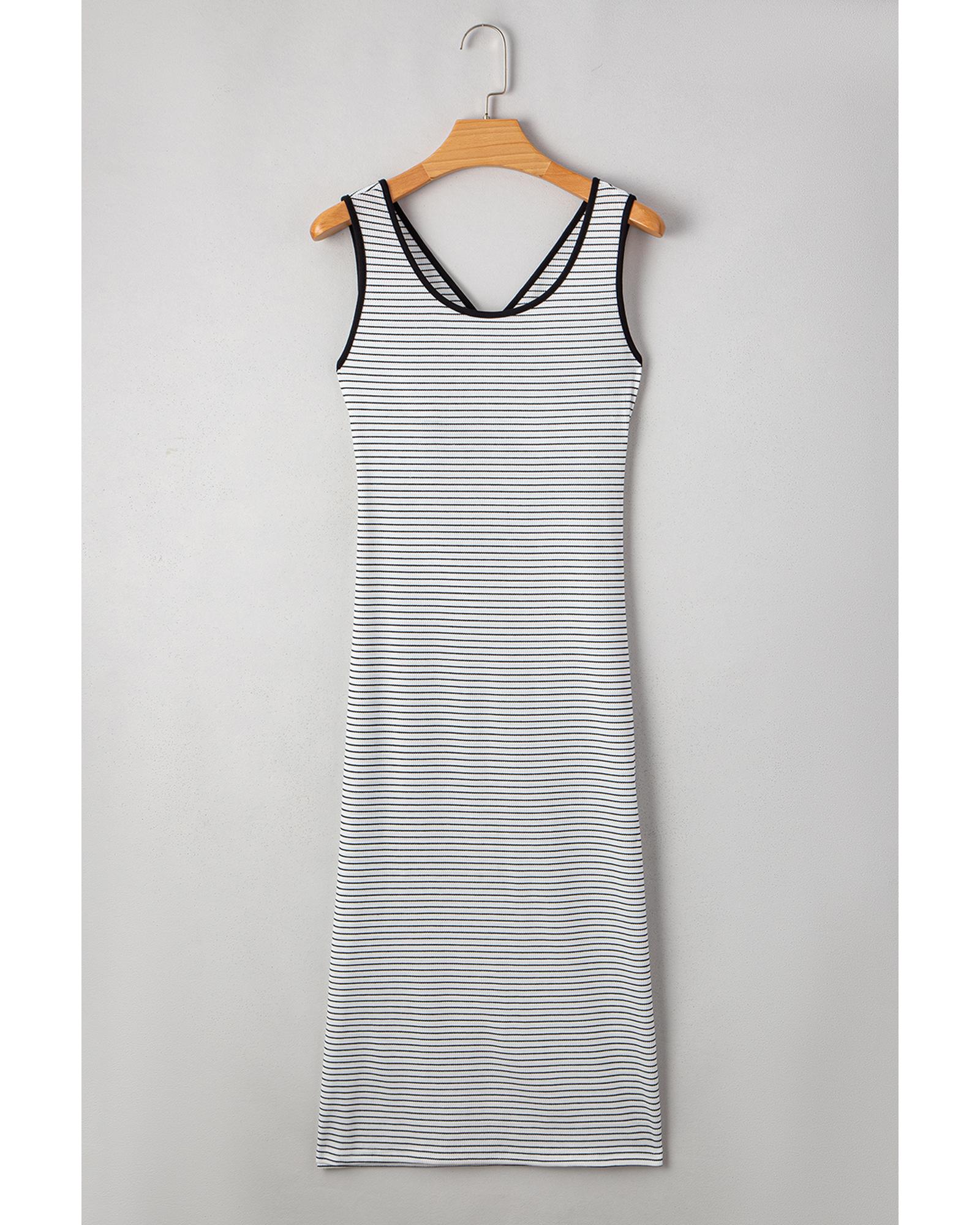 This sleeveless midi dress features a stylish striped pattern with criss-cross back design and side slits, offering a trendy and fitted silhouette. It is ideal for warm summer days and provides ease of movement with its sleeveless style.