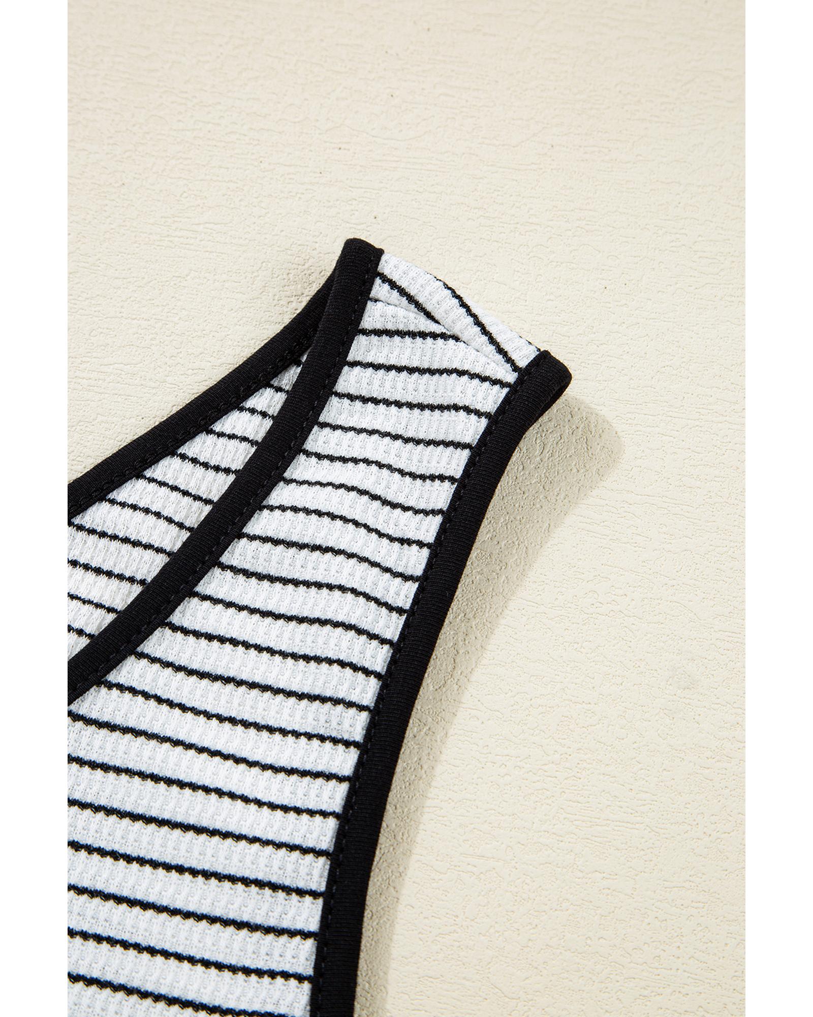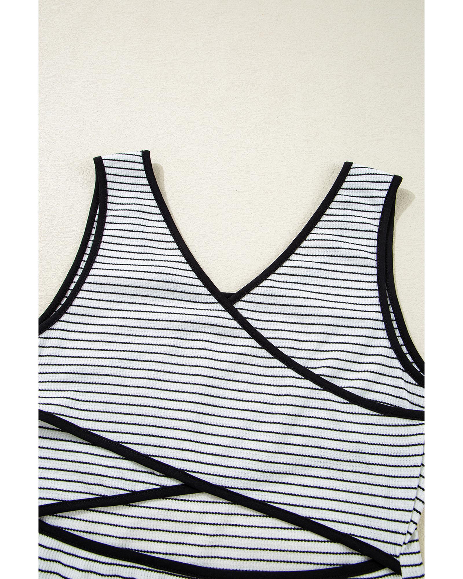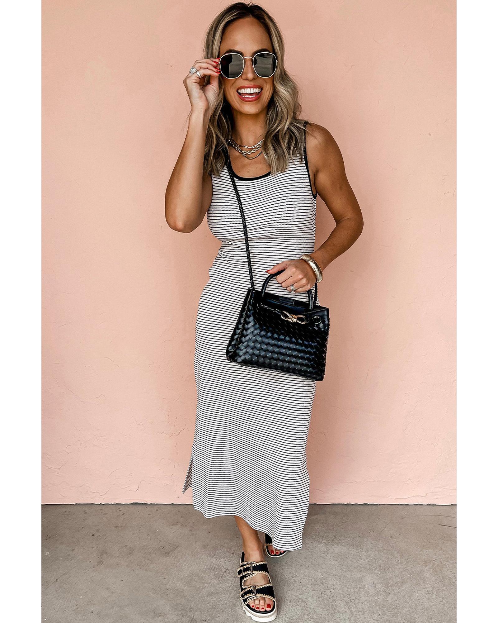 This sleeveless midi dress features a slim fit design with stylish criss-cross side slits and a classic striped pattern. It is perfect for warm summer days, offering both comfort and a trendy appearance.