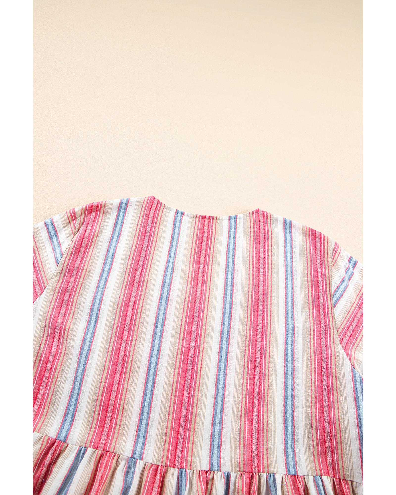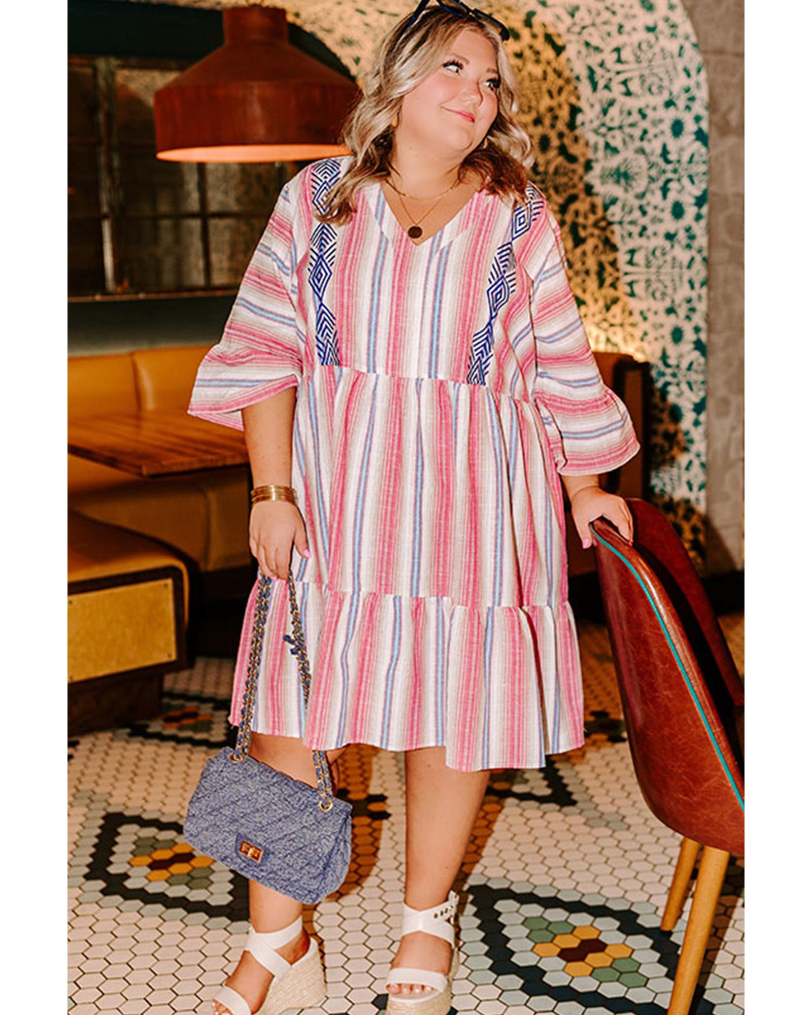 White Stripe Plus Size Embroidered Detail Flared 3/4 Sleeve V Neck Dress – 2X