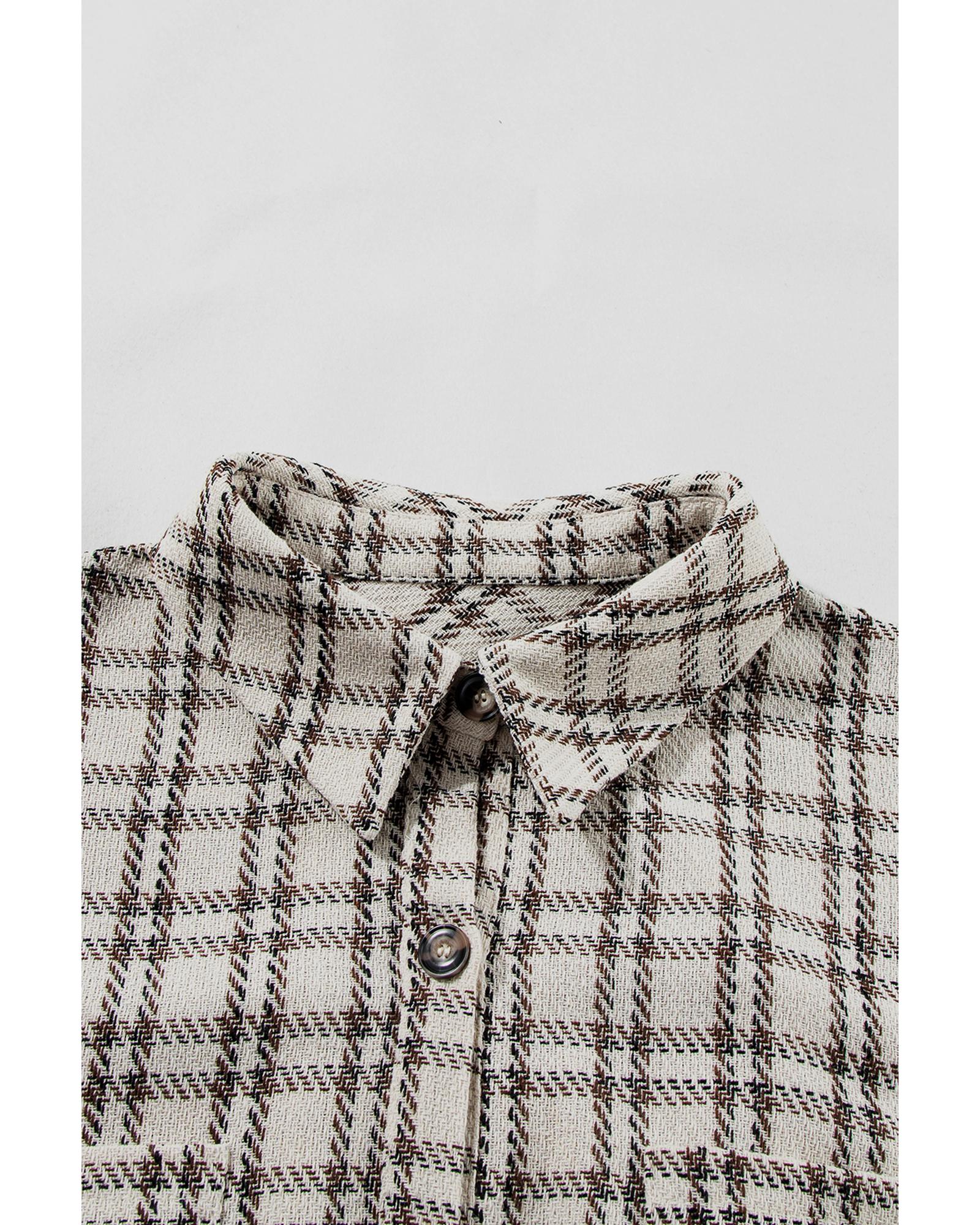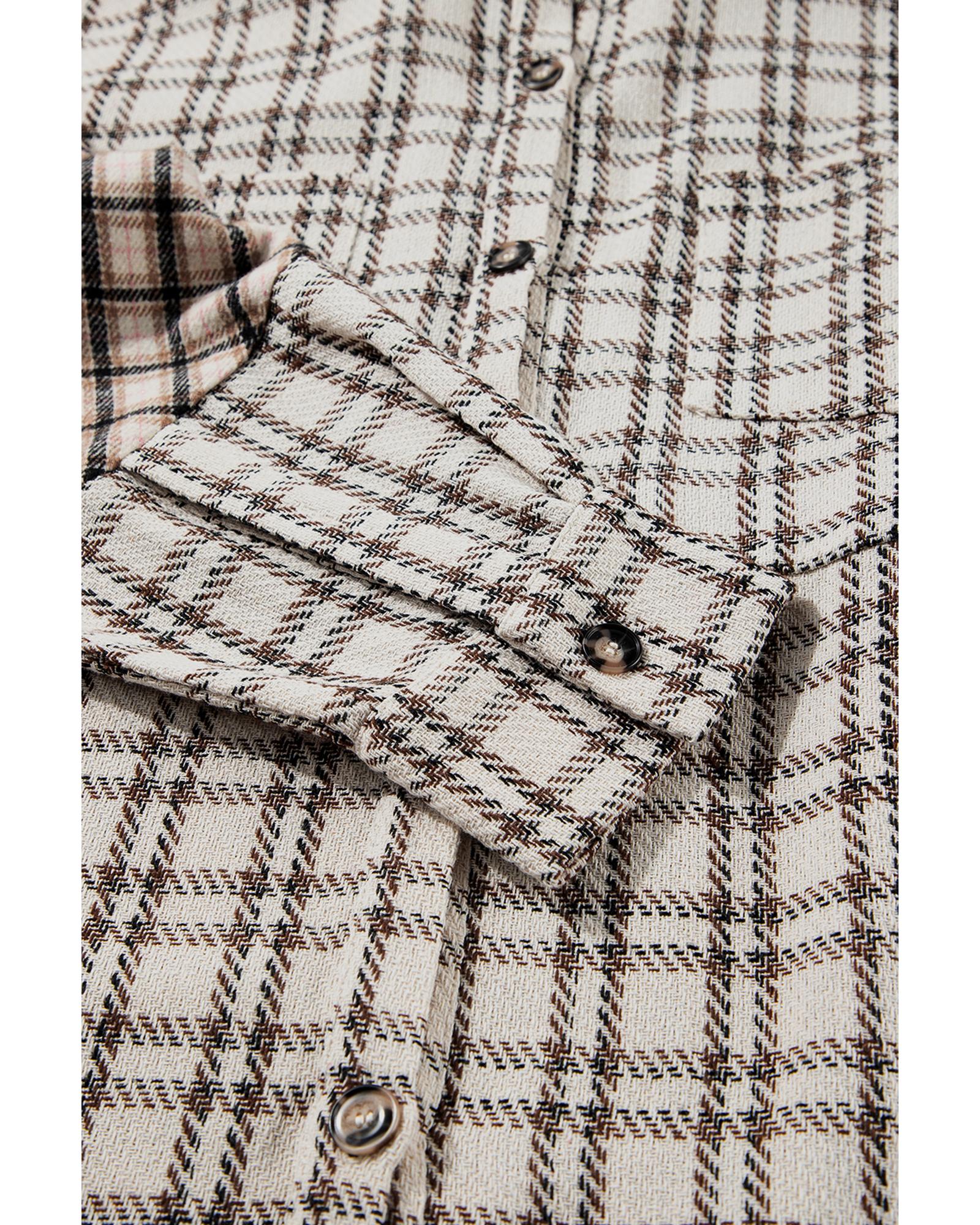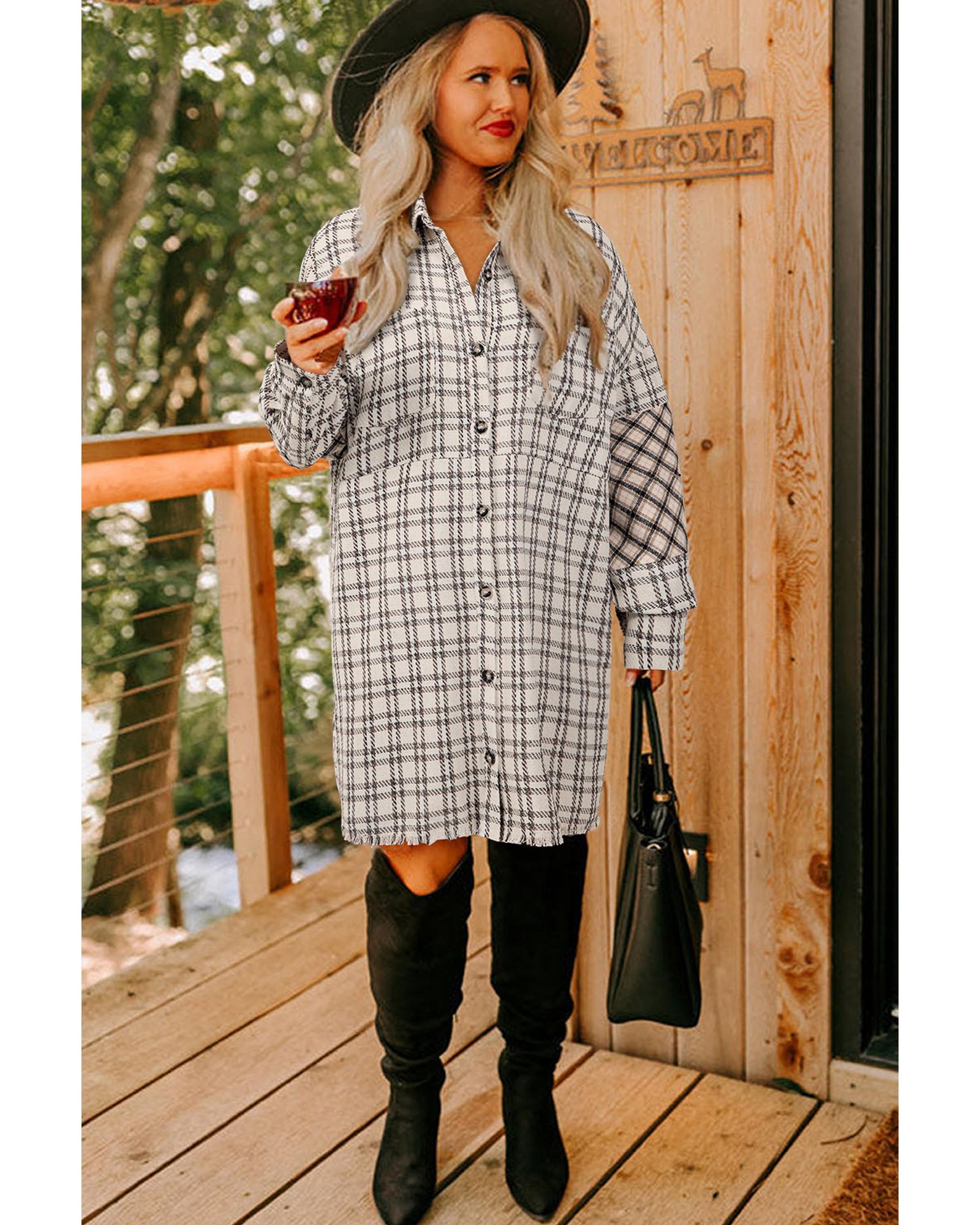 This plaid buttoned tunic shirt dress features a stylish design with a trendy raw hem finish and a comfortable, loose fit. Its versatile style makes it suitable for both casual and chic occasions, offering a flattering silhouette with a flowy tunic shape.