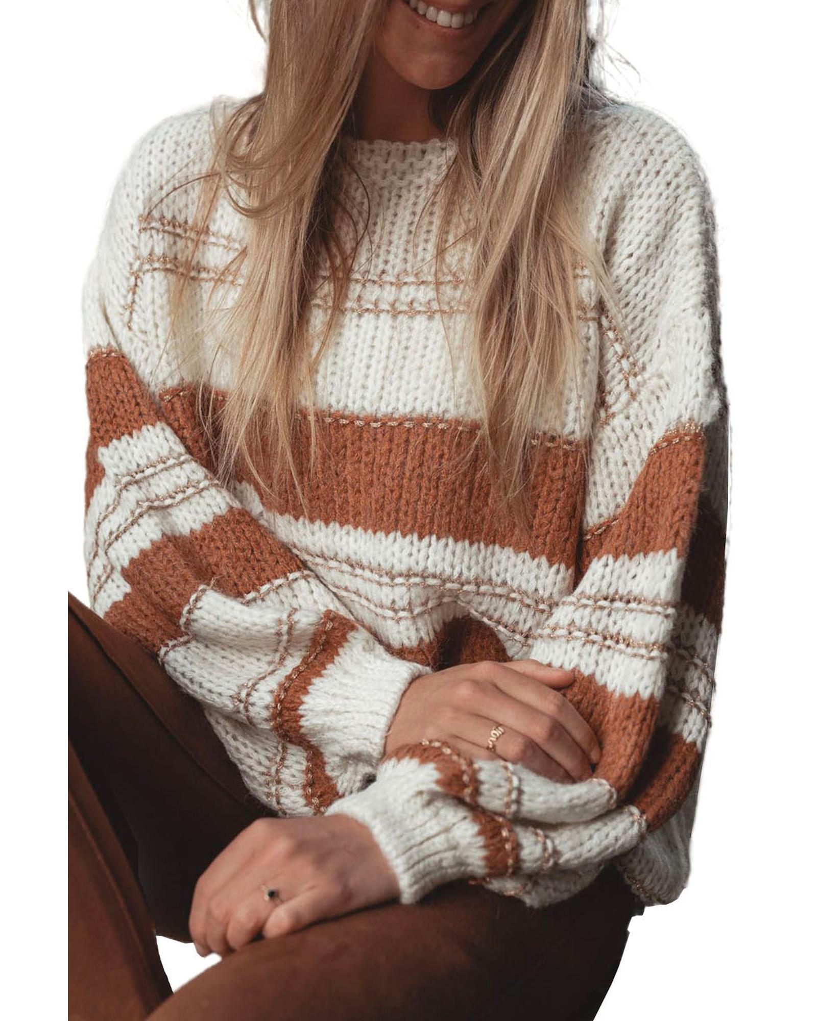 This casual sweater features a stylish white striped knit design with puff sleeves, offering a trendy and comfortable fit. Its versatile style makes it suitable for everyday wear and easy to coordinate with various outfits.