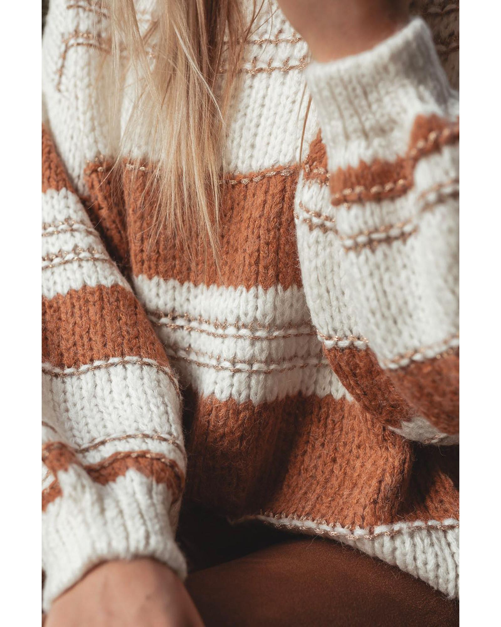 This casual sweater features a stylish white striped knit design with puff sleeves, offering a trendy and comfortable fit. Its versatile style makes it suitable for everyday wear and easy to coordinate with various outfits. The sweater is crafted from high-quality acrylic material, providing good elasticity and comfort.