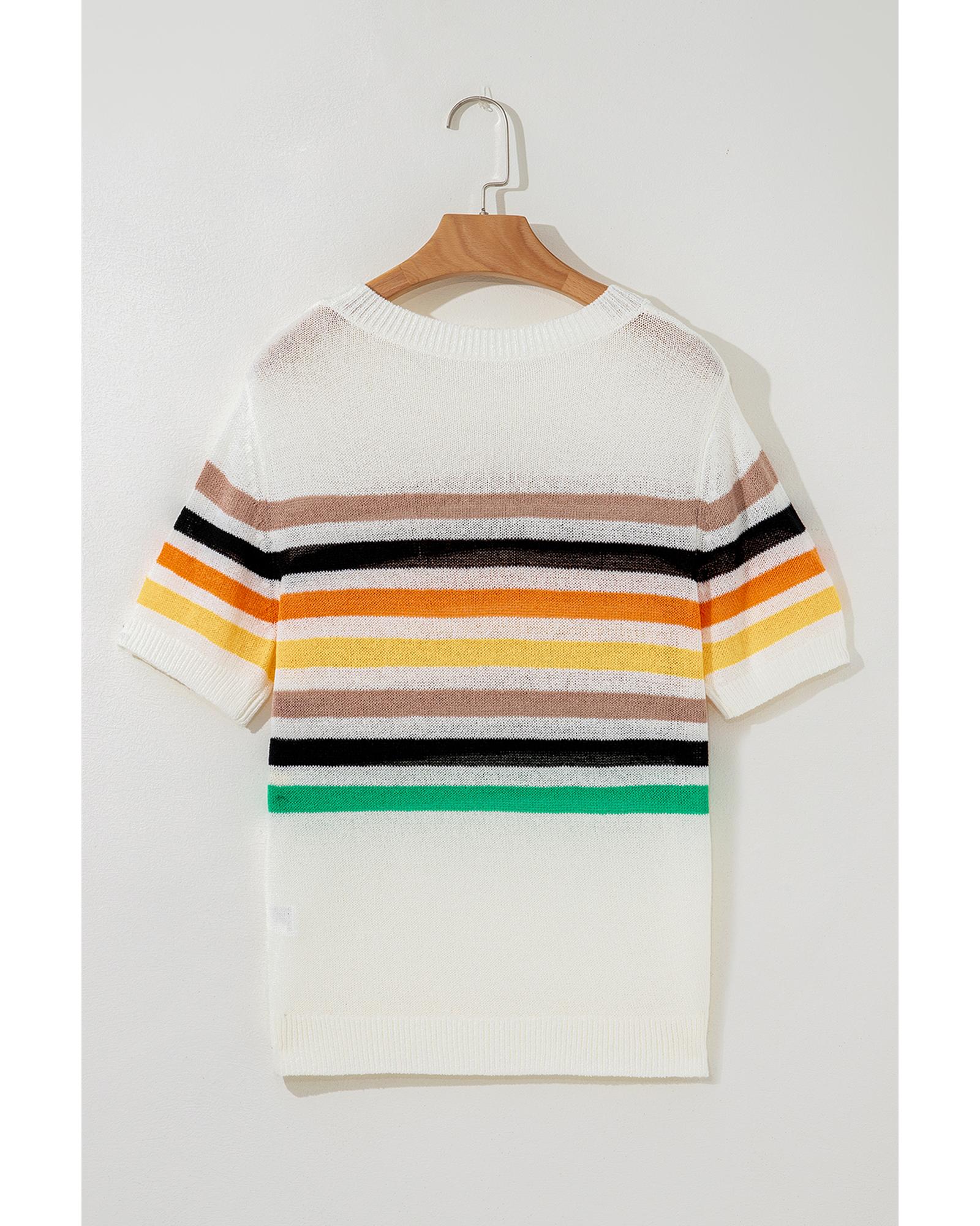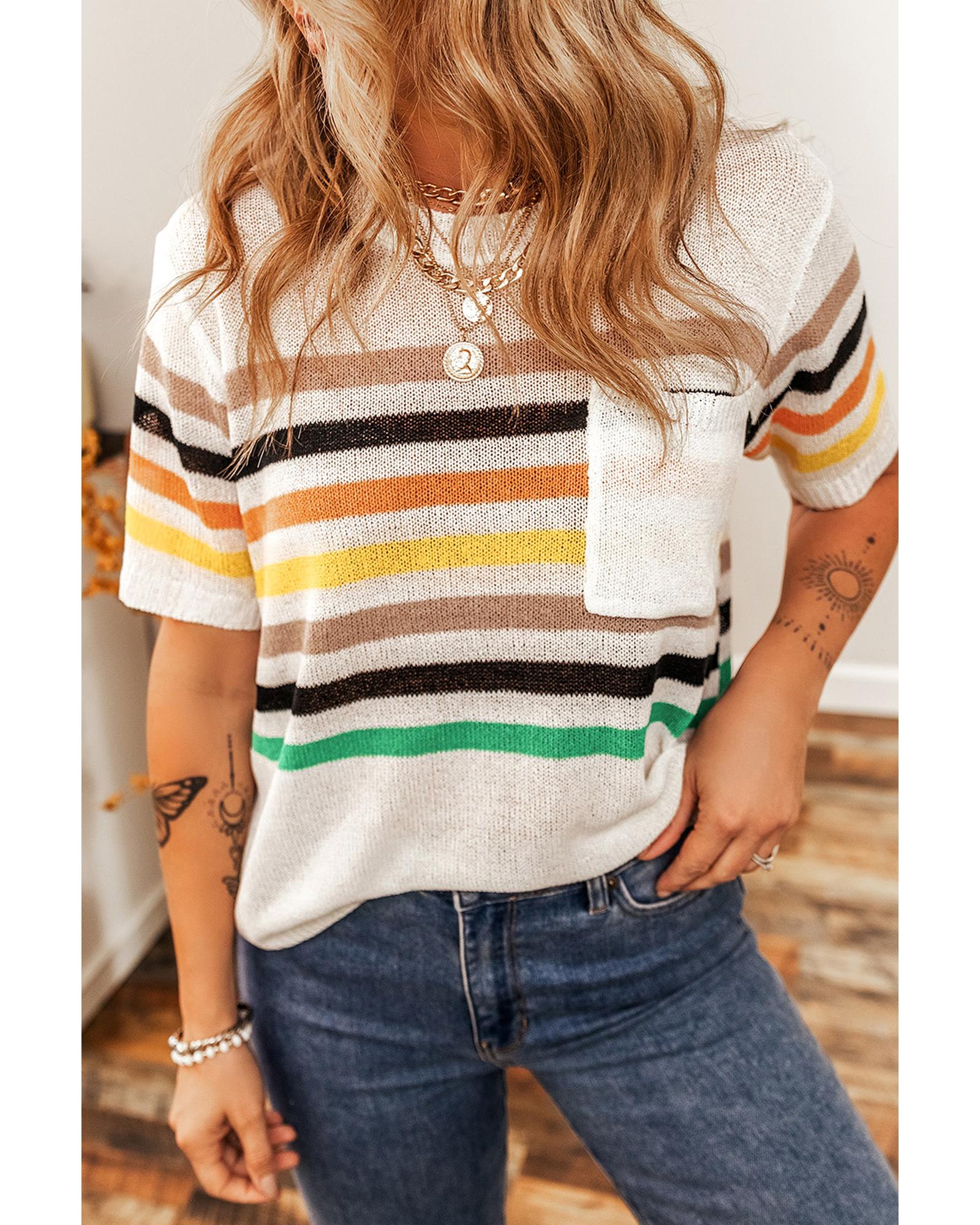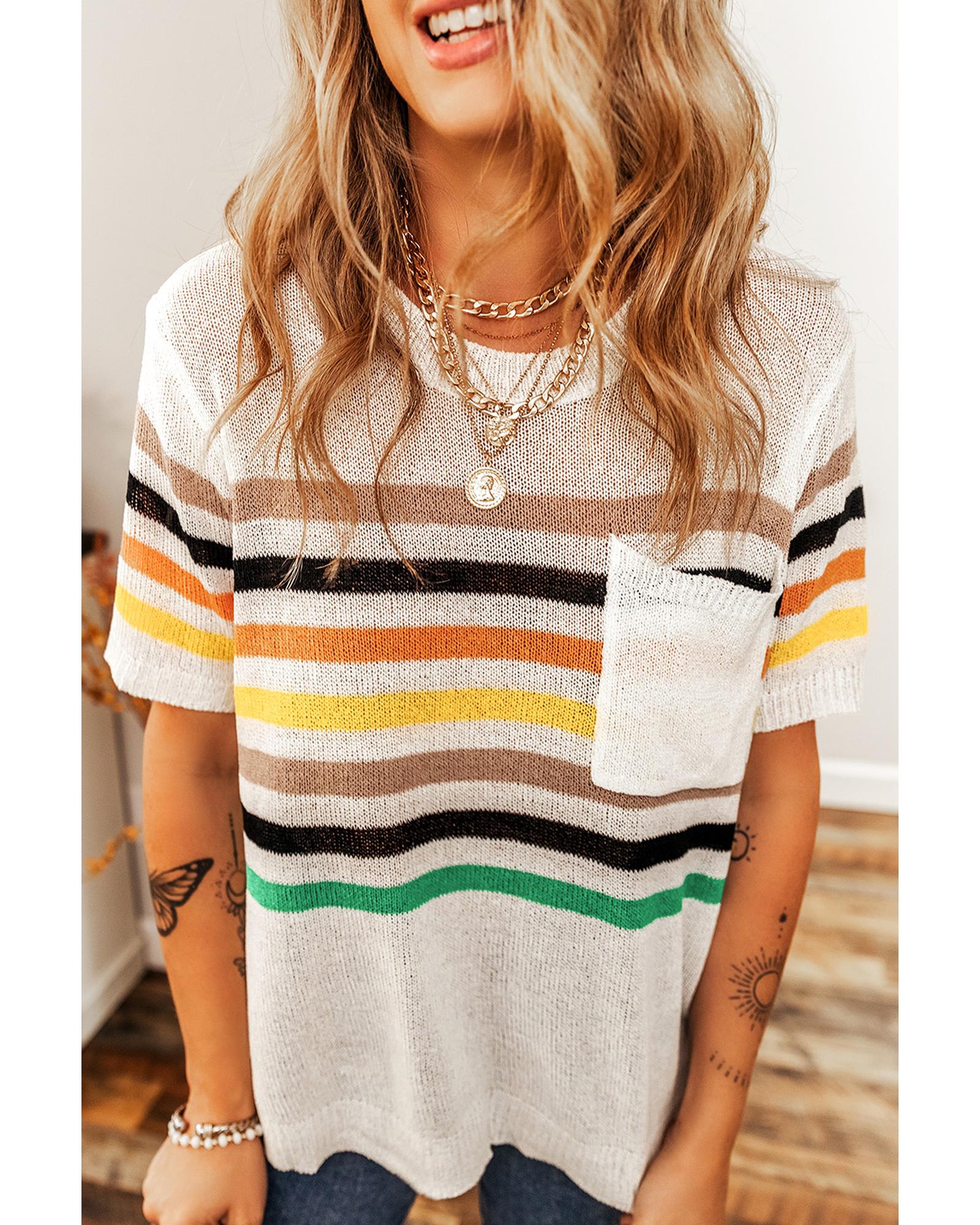 This knitted T-shirt features a casual and comfortable design with a multicolor striped pattern. It is designed with a loose fit for ease of movement and a relaxed style, making it suitable for everyday wear. The shirt includes a round neckline, short sleeves, and a patched pocket for added detail. Crafted from soft and breathable fabric, it offers comfort throughout the day.