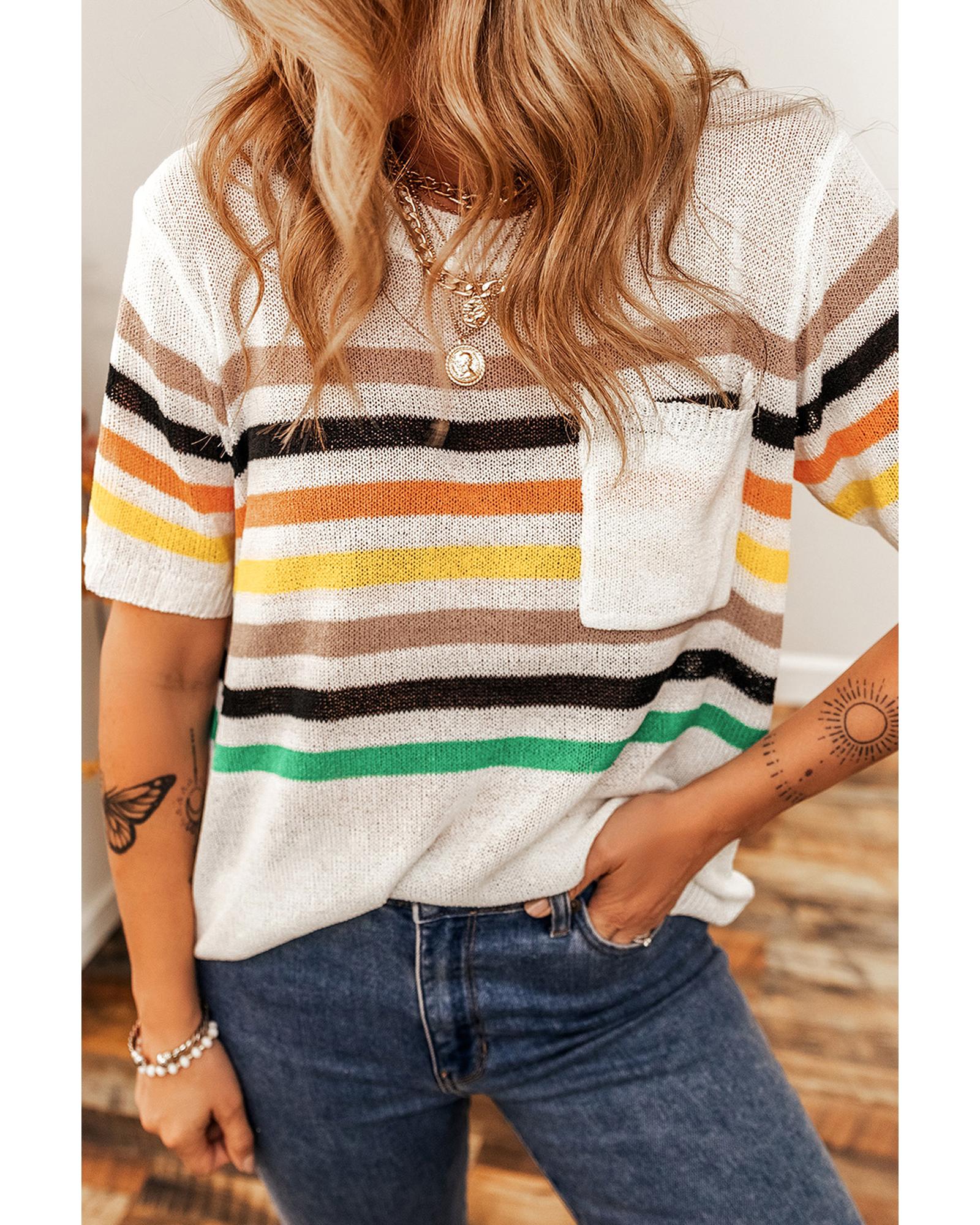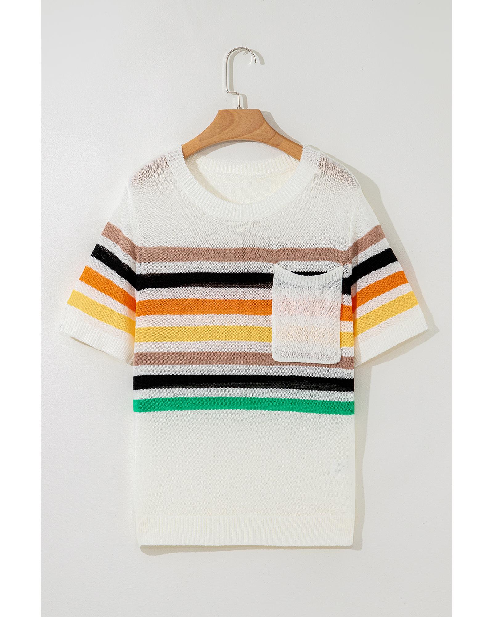 This knitted T-shirt features a relaxed fit design with a stylish multicolor striped pattern. It is crafted for comfort with soft, breathable fabric and includes practical details such as a patched pocket and a round neckline. Suitable for casual wear, this shirt combines comfort and style effortlessly.