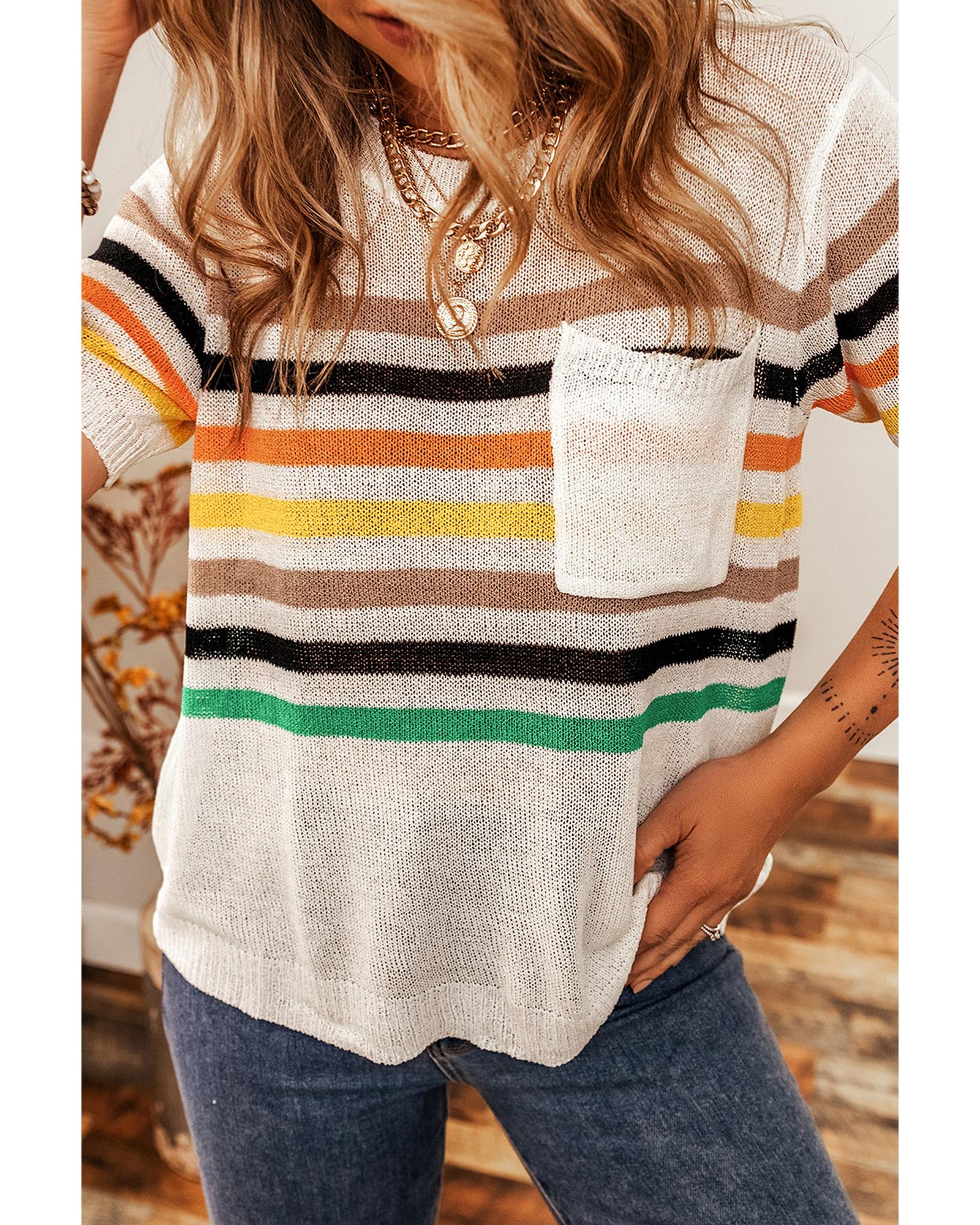 This knitted T-shirt features a relaxed fit design with a stylish multicolor striped pattern. It is crafted for comfort with soft, breathable fabric and includes practical details such as a patched pocket and a round neckline. Suitable for casual wear, this shirt combines comfort and style effortlessly.
