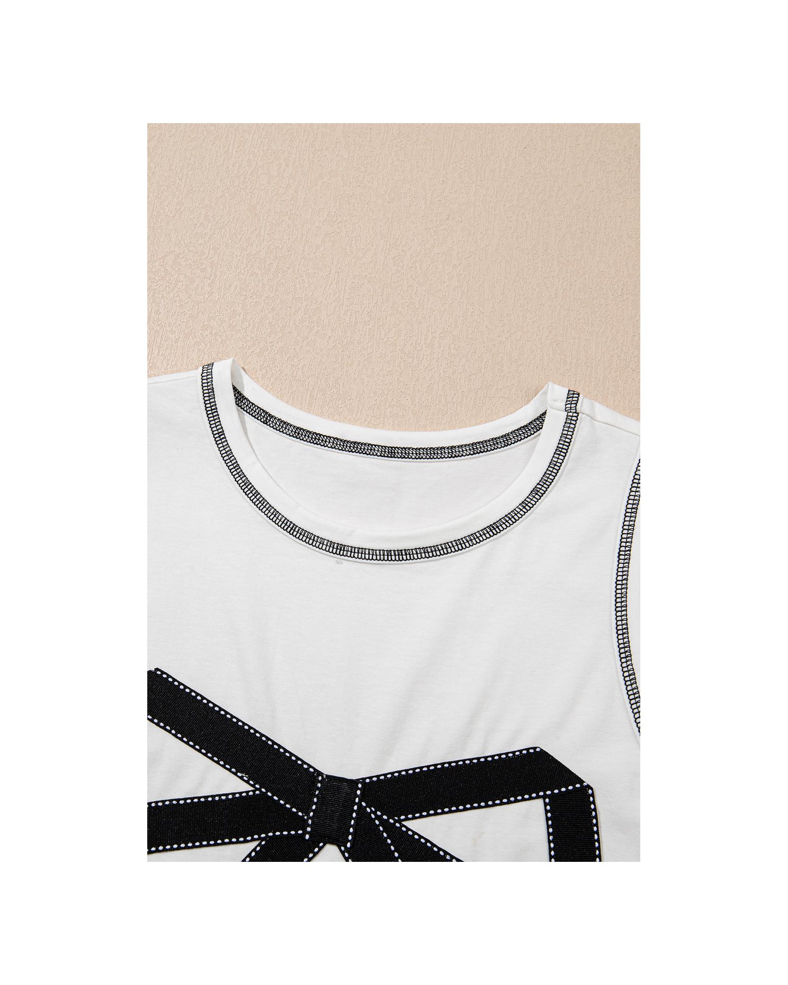 This sleeveless top features a charming bow pattern on the front and is accented with elegant stitching trim, adding a touch of sophistication to your wardrobe. Its classic crew neck design makes it versatile for various occasions, while the sleeveless cut ensures comfort and breathability during warm days.