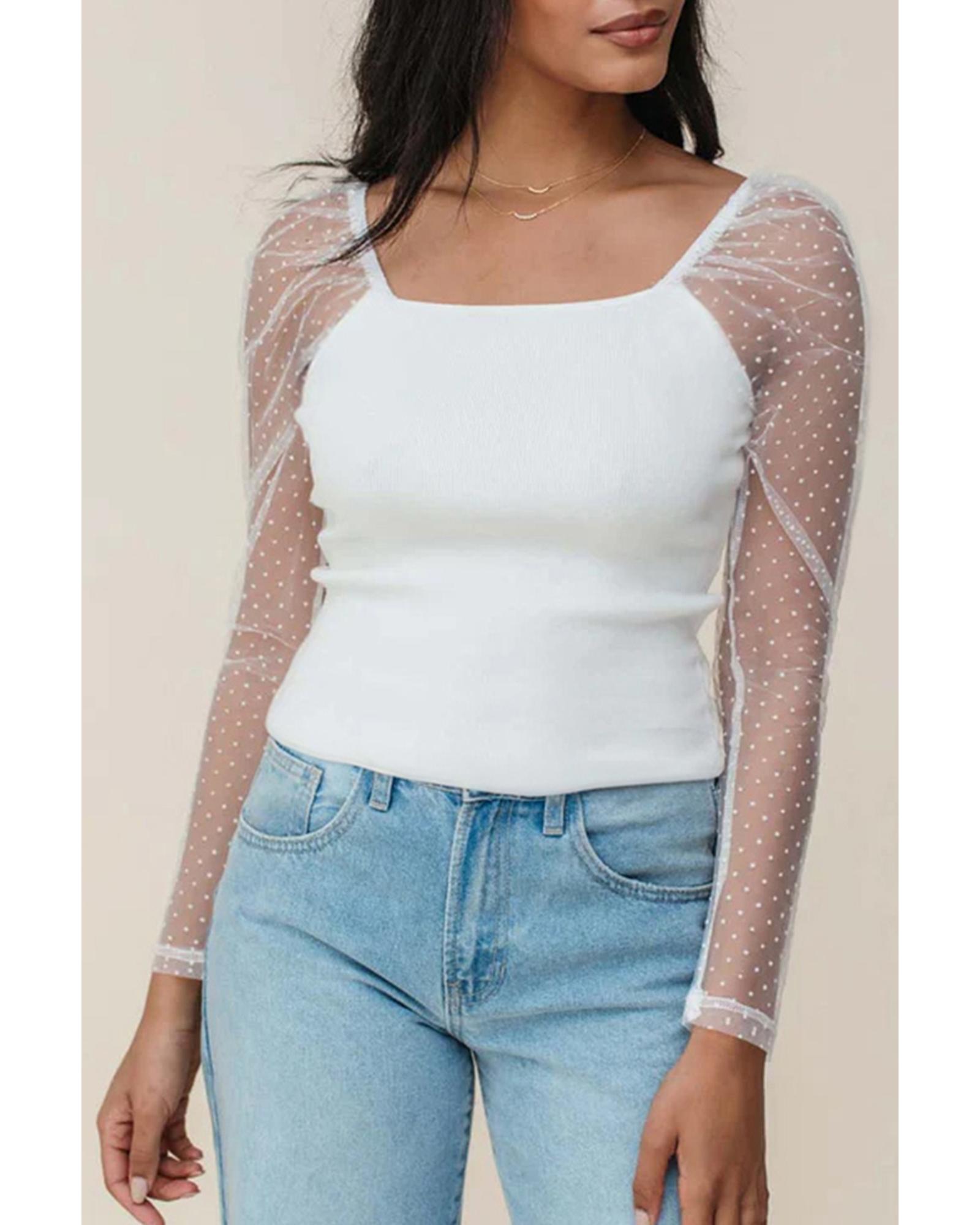 This long sleeve top features a stylish combination of knit and mesh patchwork, creating a chic and modern silhouette. The elegant square neckline adds a sophisticated touch, while the Swiss dot sheer mesh sleeves provide a romantic and delicate detail. Made with a stretchy knit fabric, it offers a comfortable and flattering fit suitable for various occasions.
