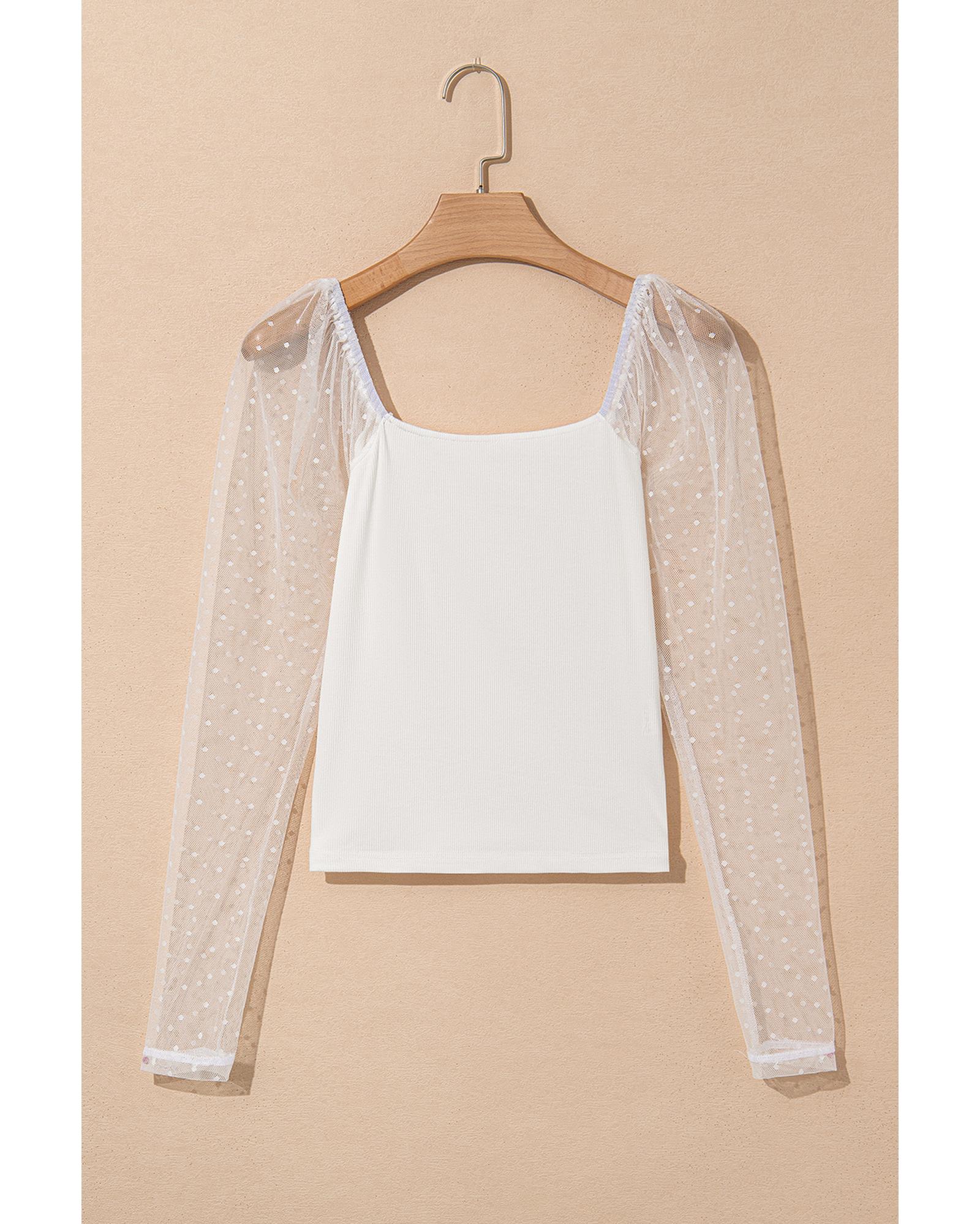 White Swiss Dot Mesh Long Sleeve Square Neck Slim Top – M