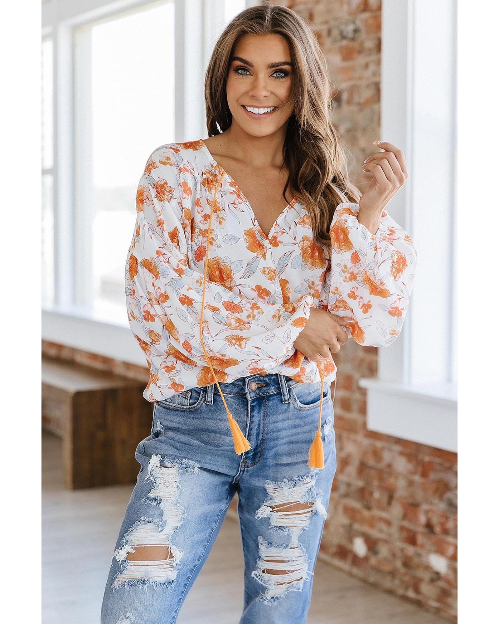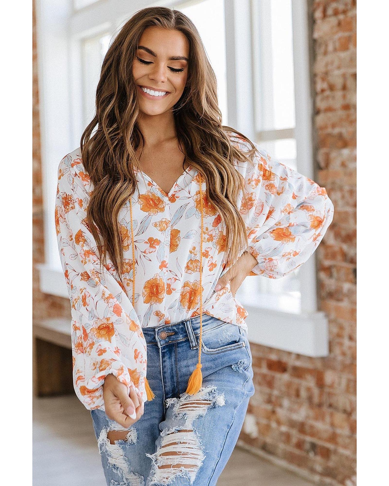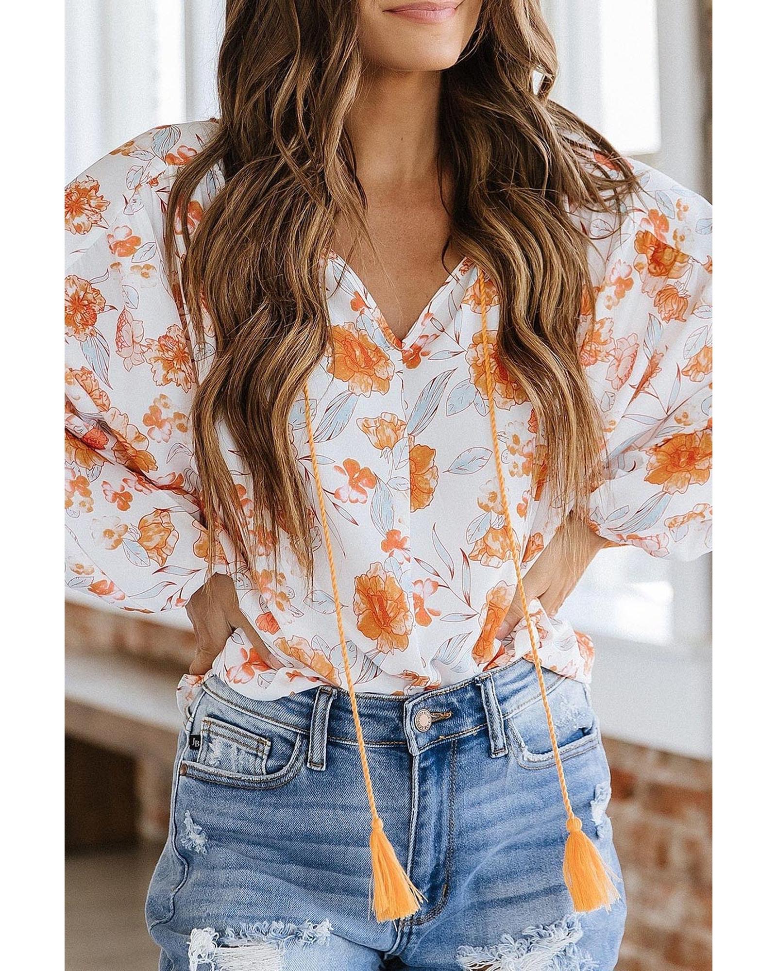 White Tassel Tie V Neck Bubble Sleeve Floral Blouse – L