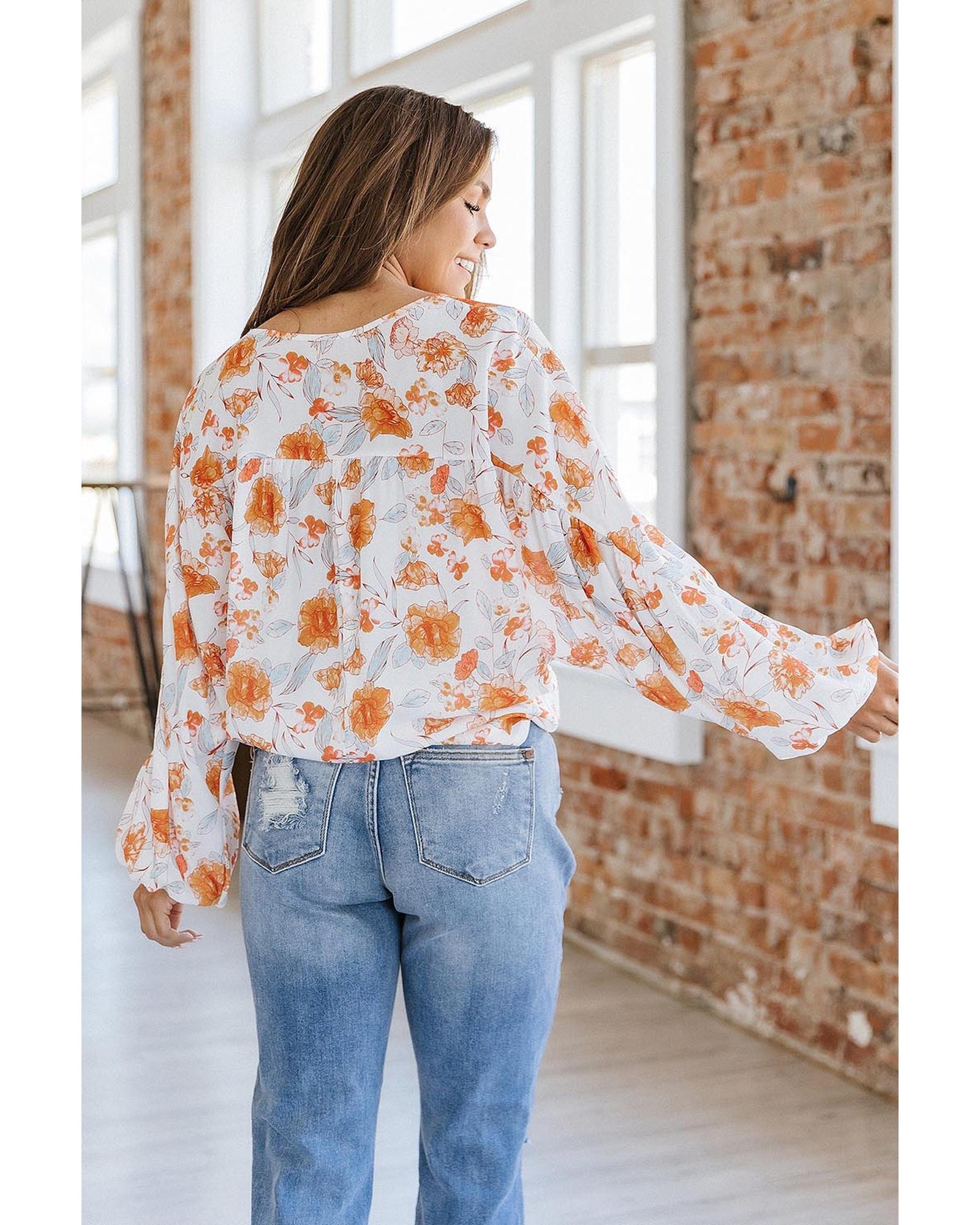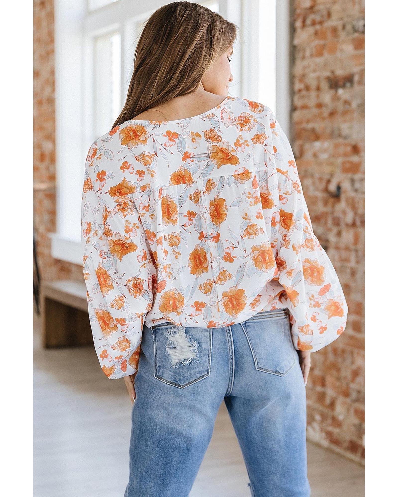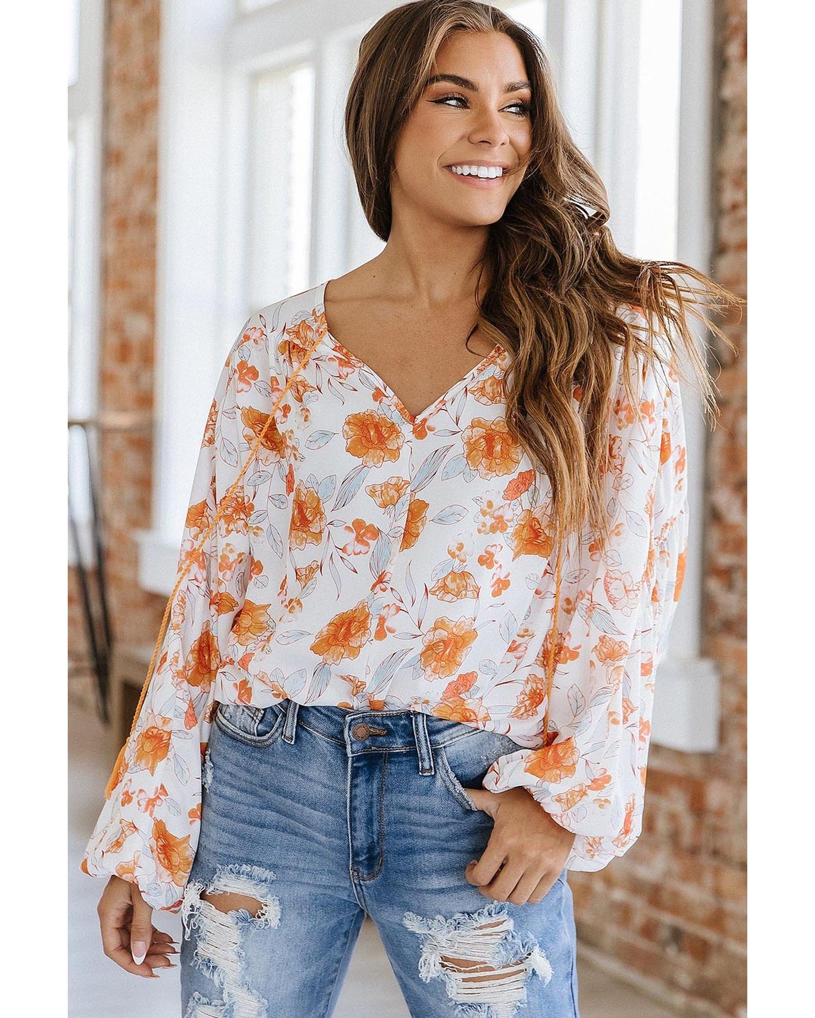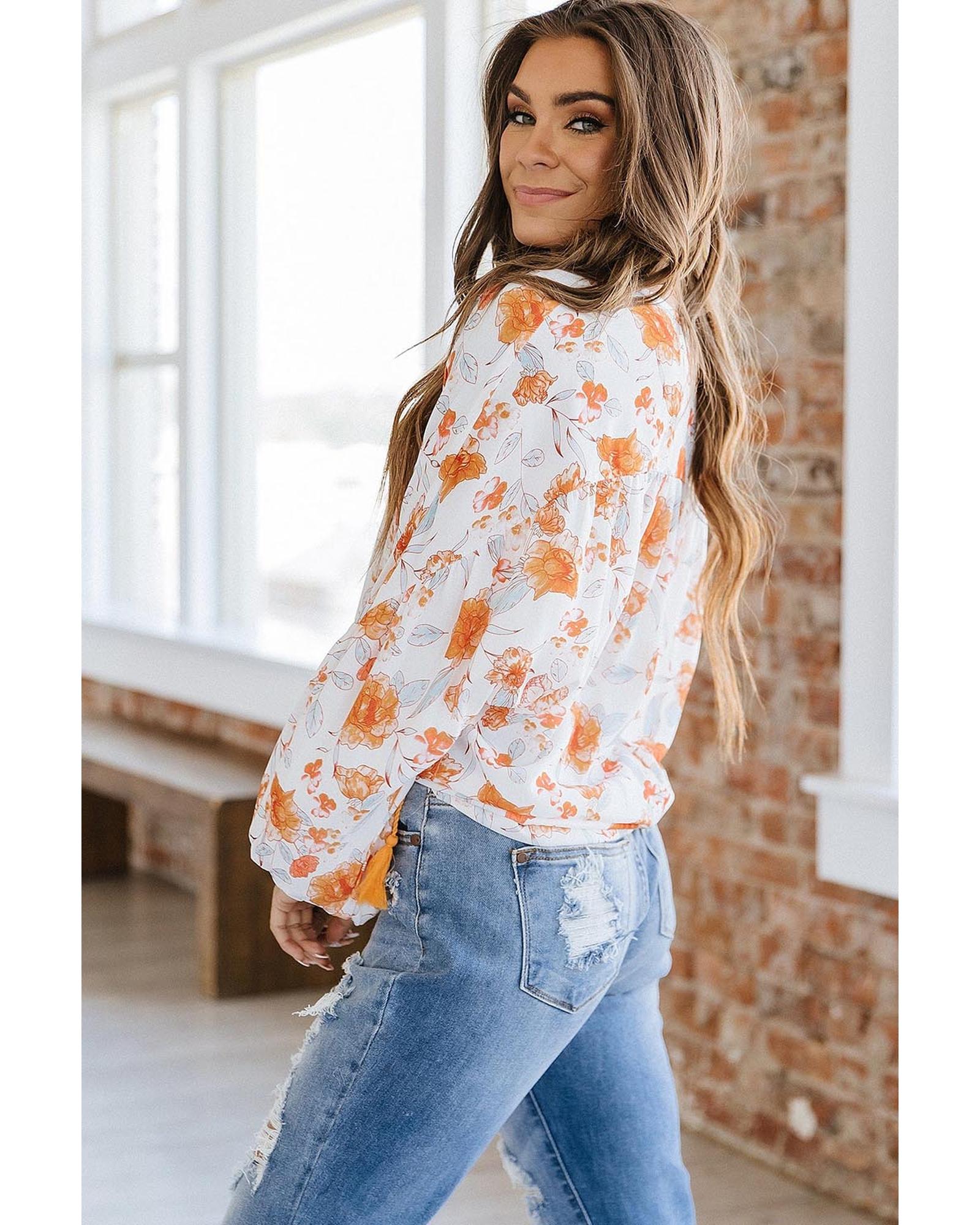 White Tassel Tie V Neck Bubble Sleeve Floral Blouse – L