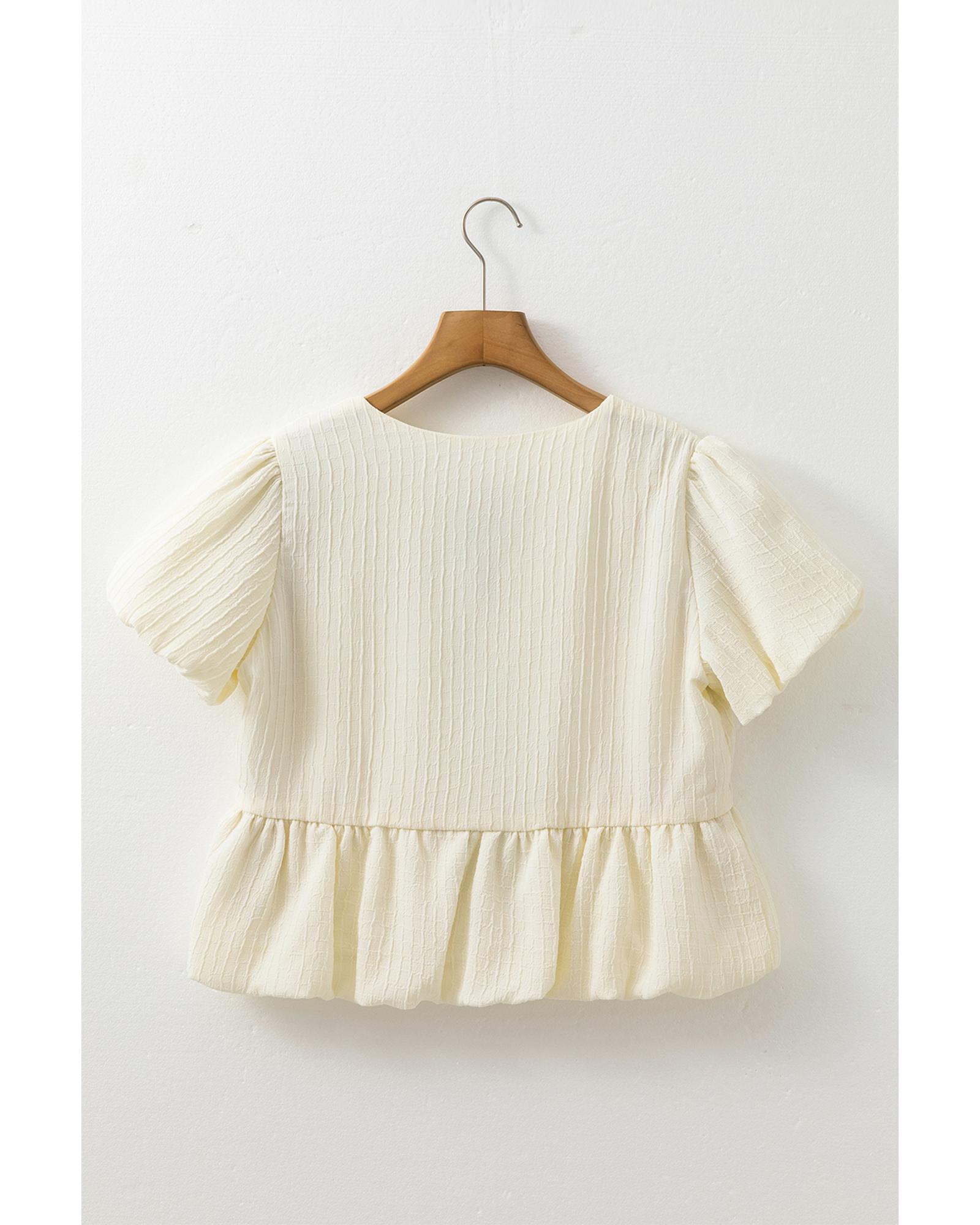 This white textured blouse features a front bow tie detail, a bubble hem, and puff short sleeves, creating a stylish and feminine look. The textured fabric adds dimension and visual interest, making it suitable for various occasions.