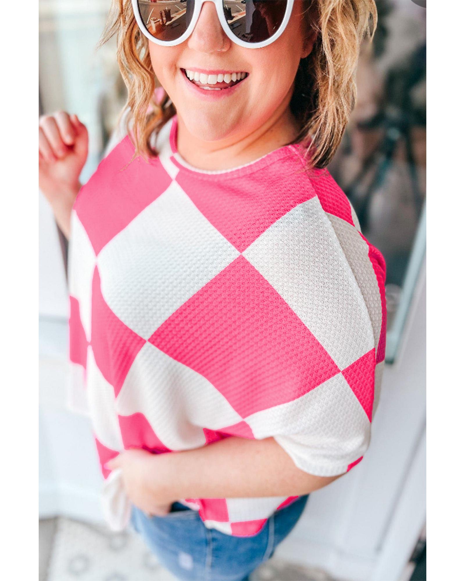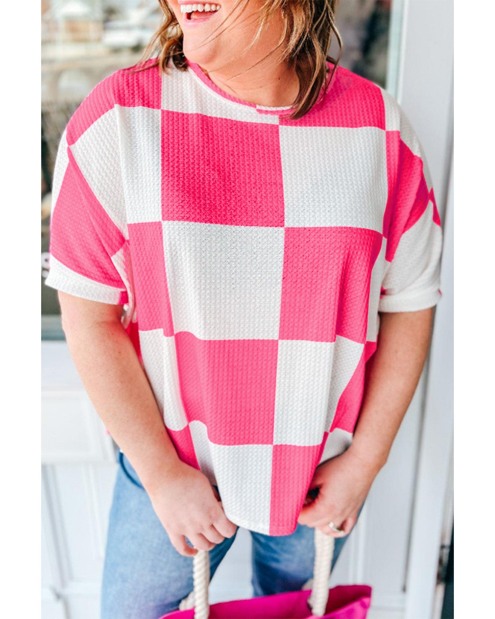 This plus size T-shirt features a textured checkerboard pattern and a classic round neck design, offering a fashionable and comfortable fit. Its versatile style makes it easy to pair with various bottoms, suitable for different body shapes and casual occasions.