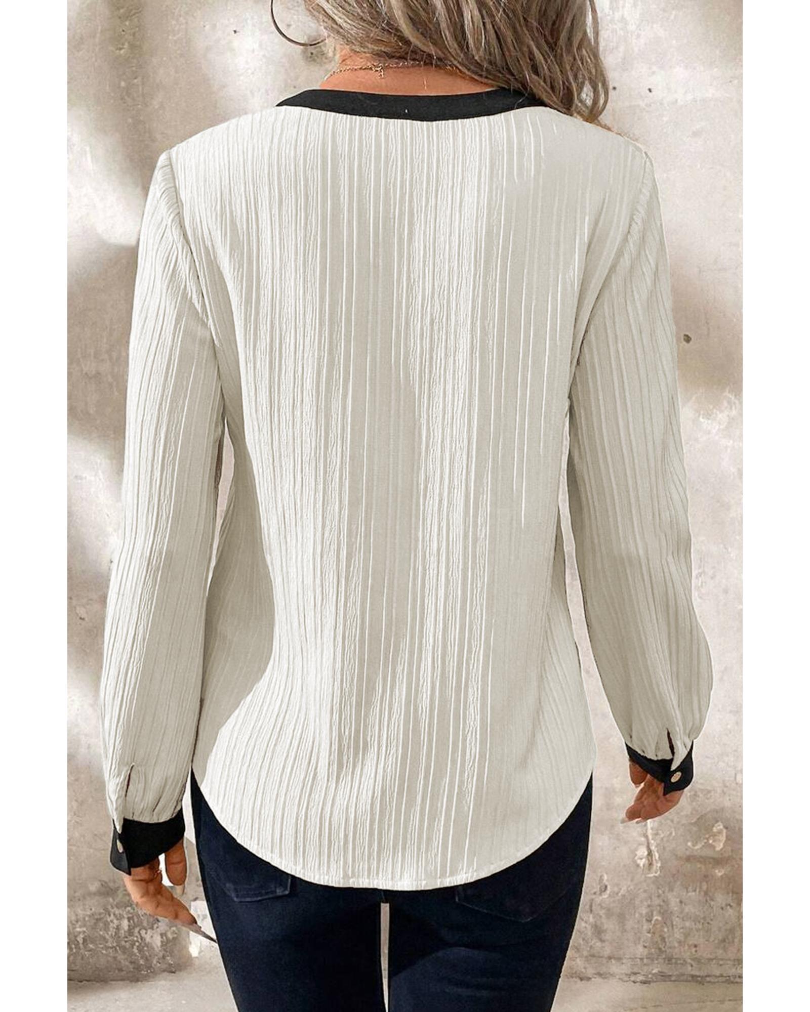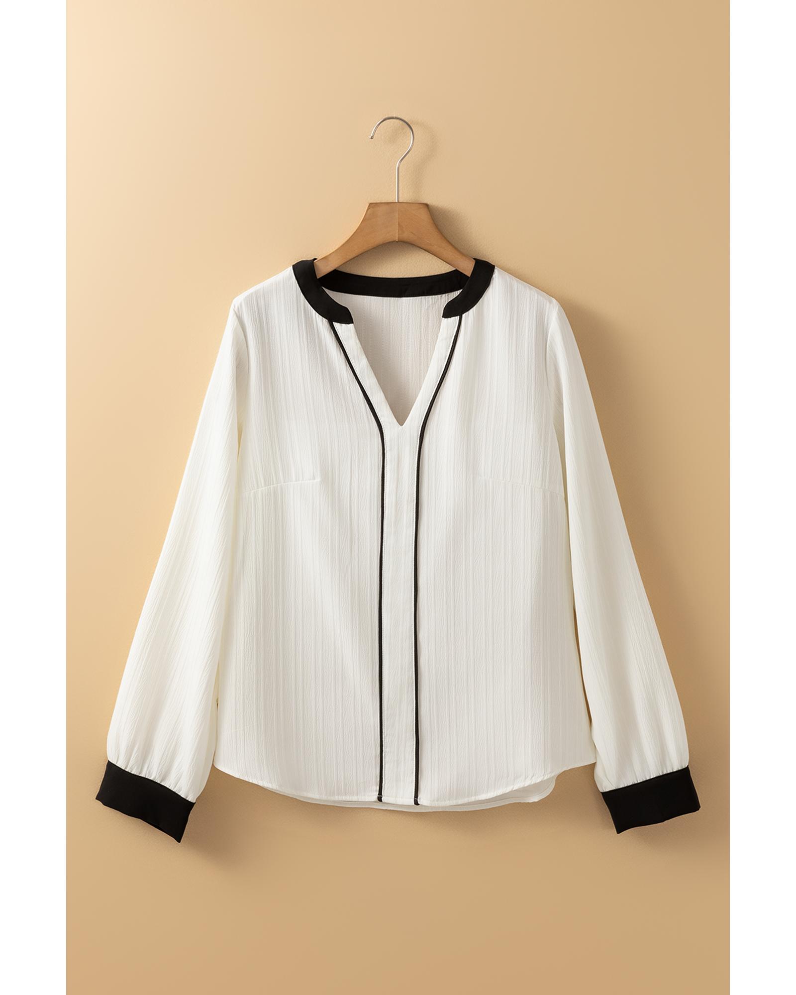 This elegant blouse features a textured fabric with a stylish colorblock design and a flattering V neckline. Its refined fit makes it suitable for both dressy and casual occasions, offering versatile pairing options with skirts, trousers, or jeans.