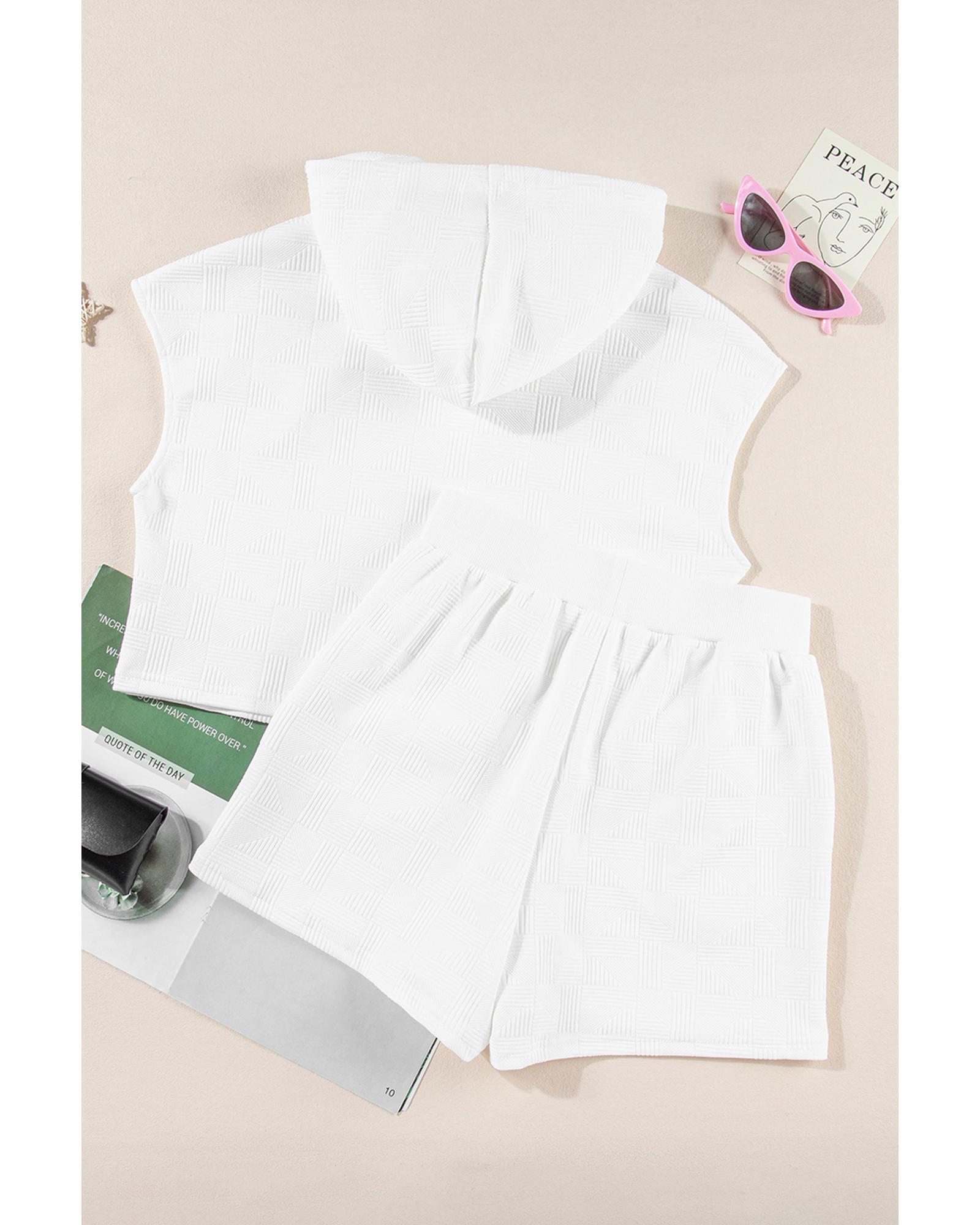 This white textured cropped hoodie and shorts set offers a trendy and casual look with a comfortable loose fit. Designed with high elasticity, it is suitable for various daily occasions, from lounging to outings. The set includes a drawstring hoodie and a pair of shorts, making it a versatile addition to your wardrobe.