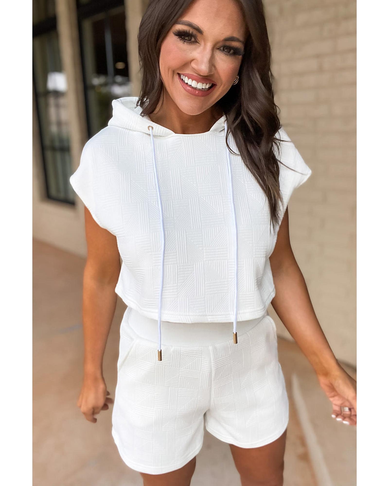 This white textured cropped hoodie and shorts set offers a trendy and casual style suitable for various daily occasions. Designed with a loose cropped fit, it combines comfort and fashion effortlessly, making it ideal for lounging or outings.