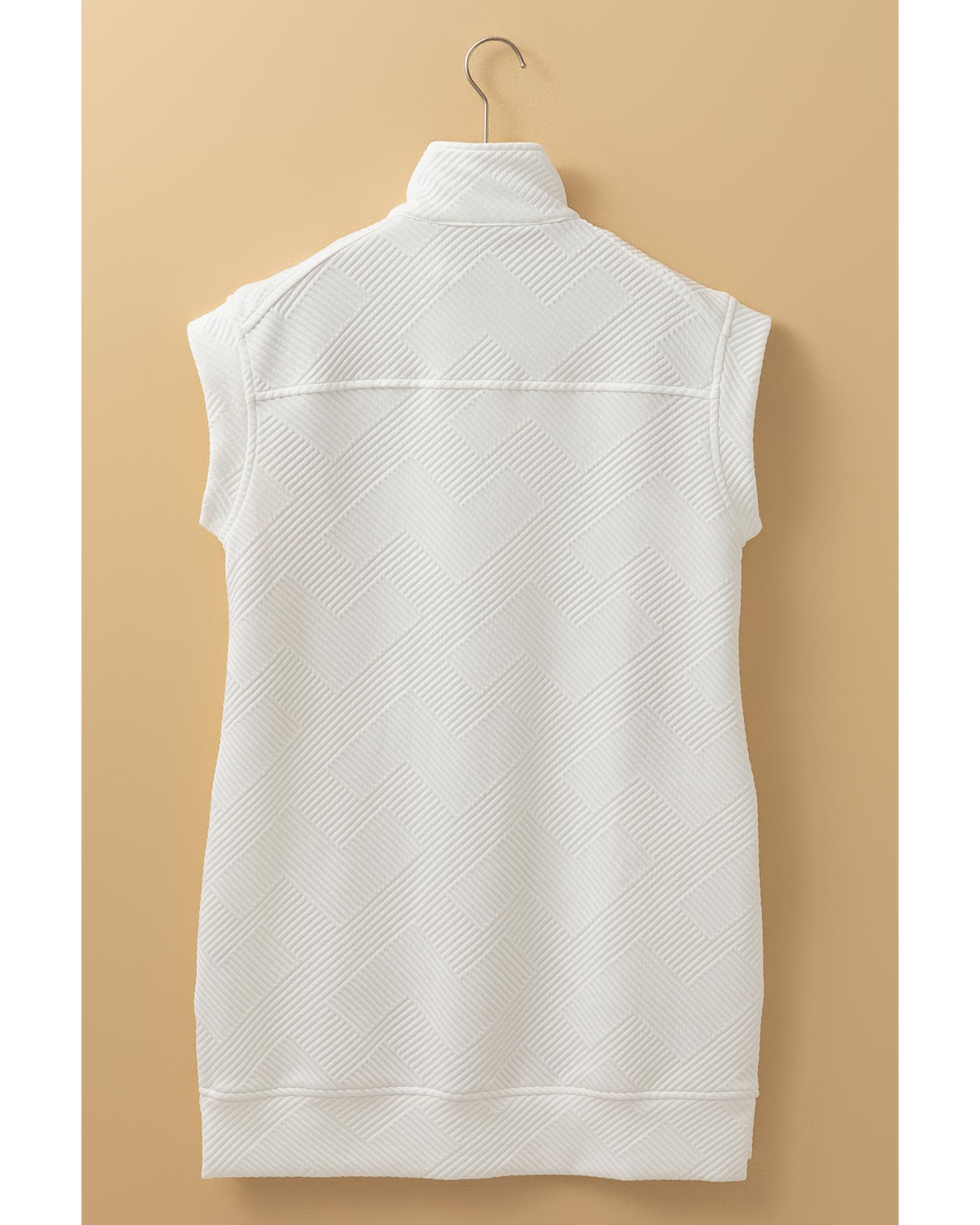 This white textured mini dress features a stylish design with a half zip closure and a collared neckline. Crafted from a cozy and unique textured fabric, it offers both comfort and fashion. The dress is designed with cap sleeves, side pockets, and slits at the hemline to enhance its overall look and functionality.