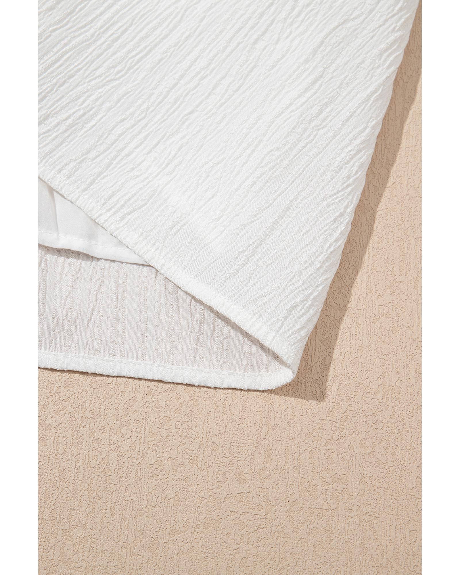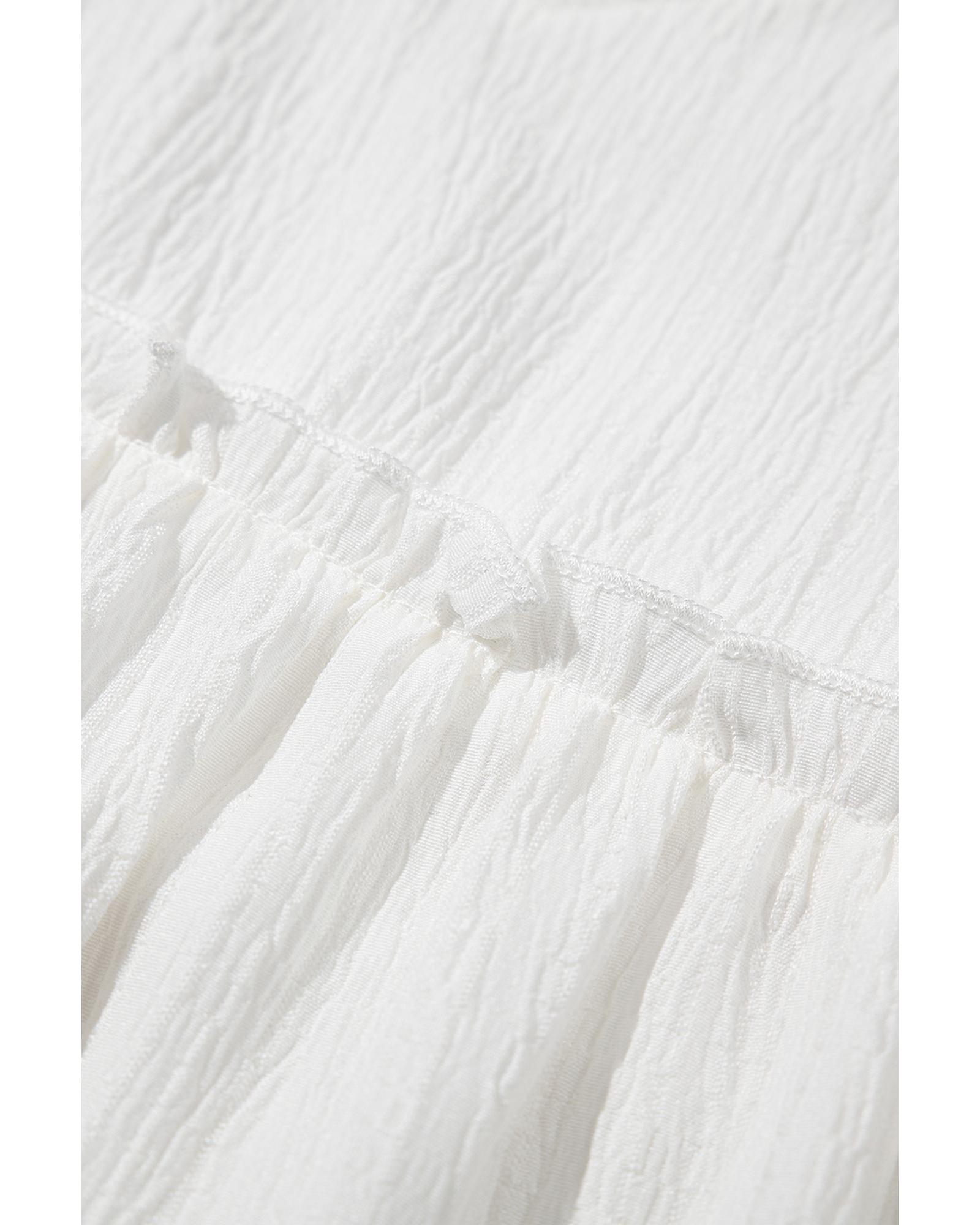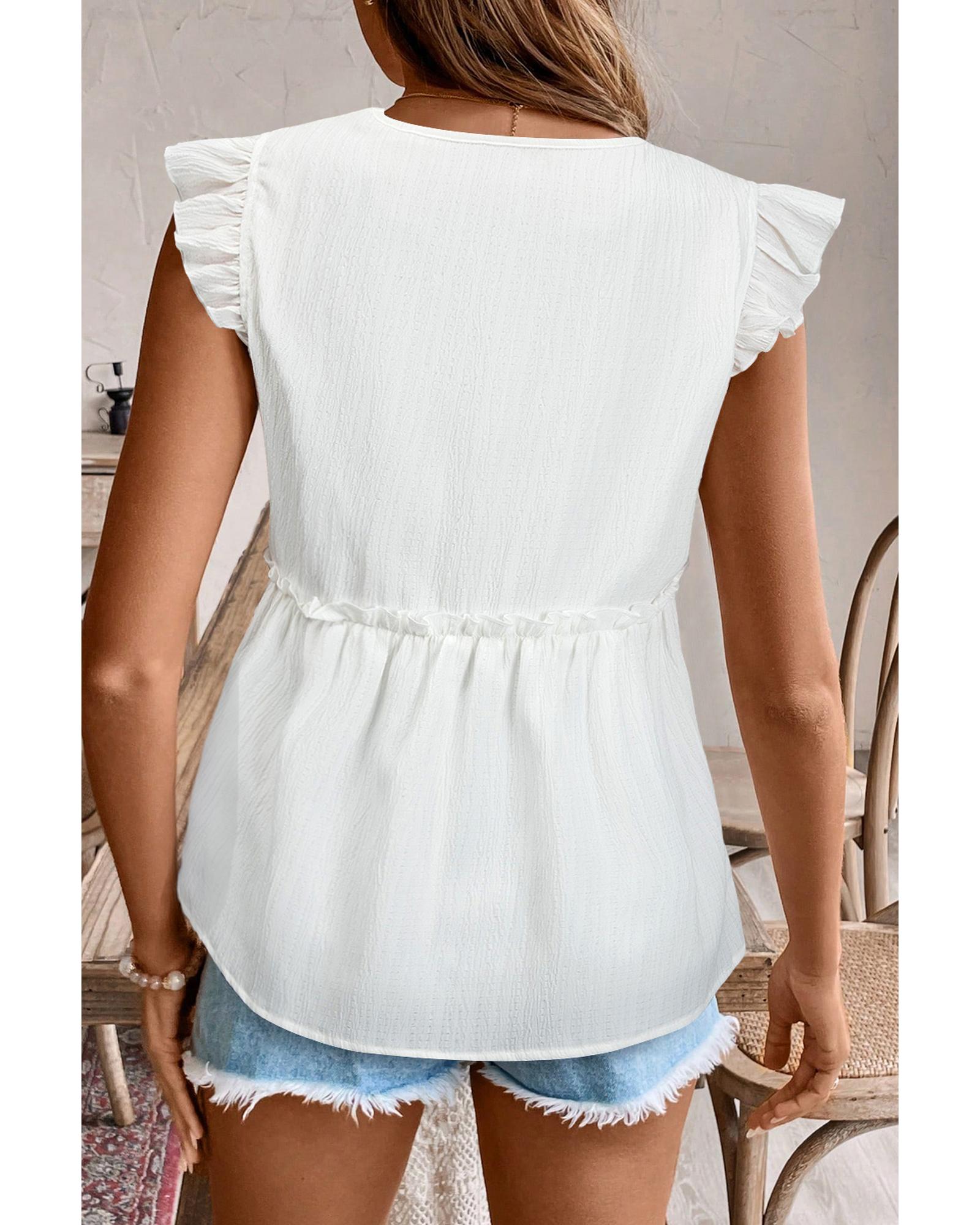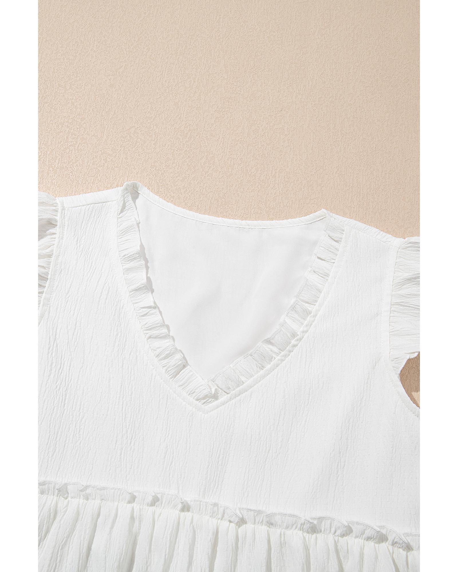 This white textured top features a ruffled trim and a V-neck design, creating a feminine and elegant look. The flutter details add a touch of grace, while the flowy fit ensures a flattering silhouette for various body types. The textured fabric provides a unique tactile and visual appeal.