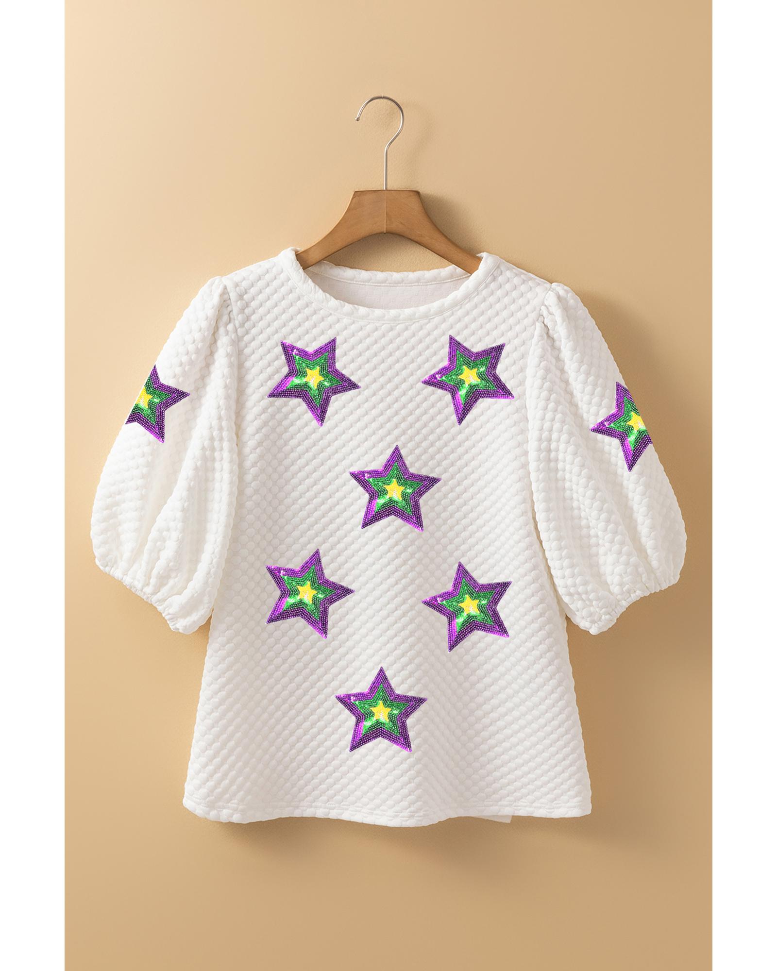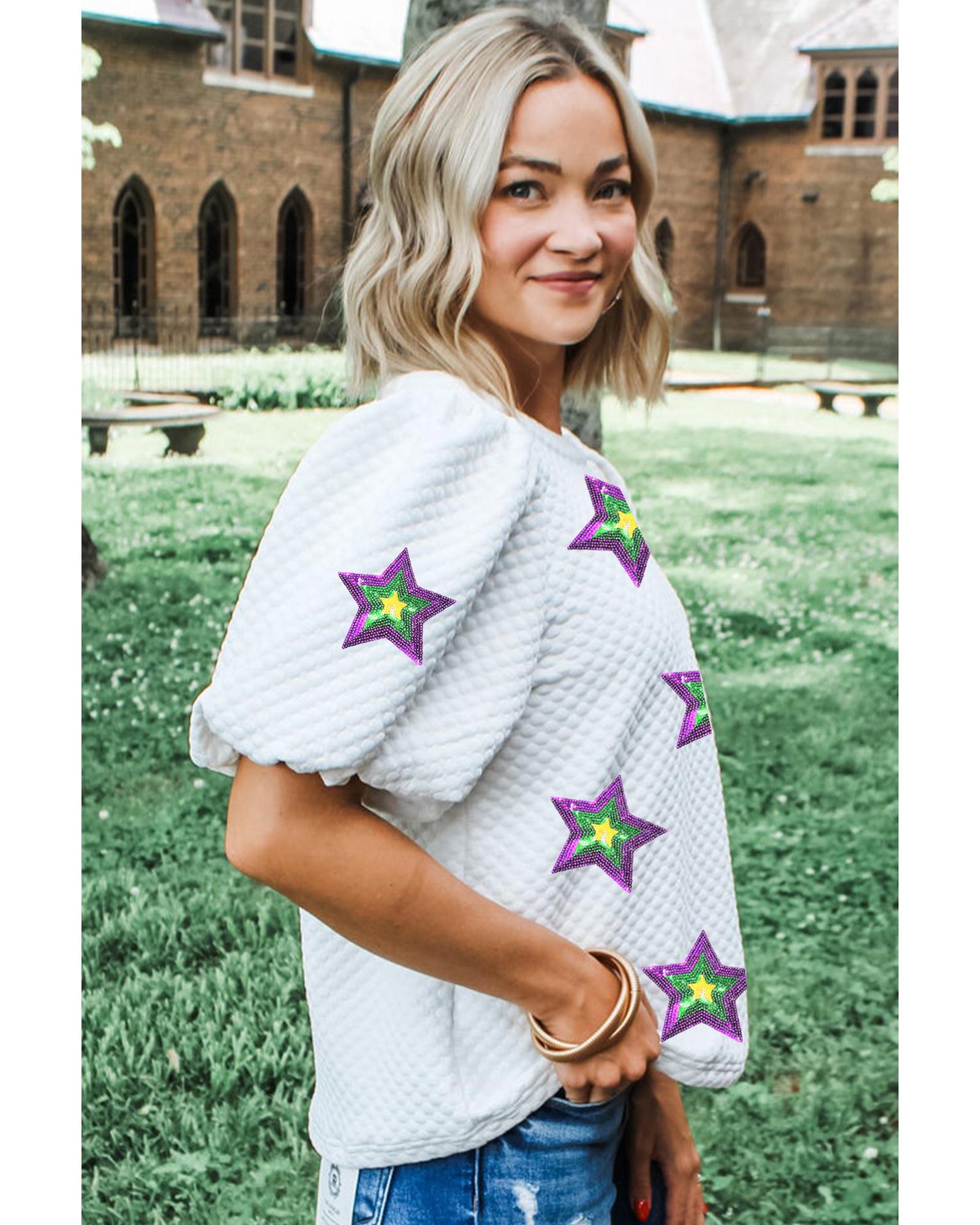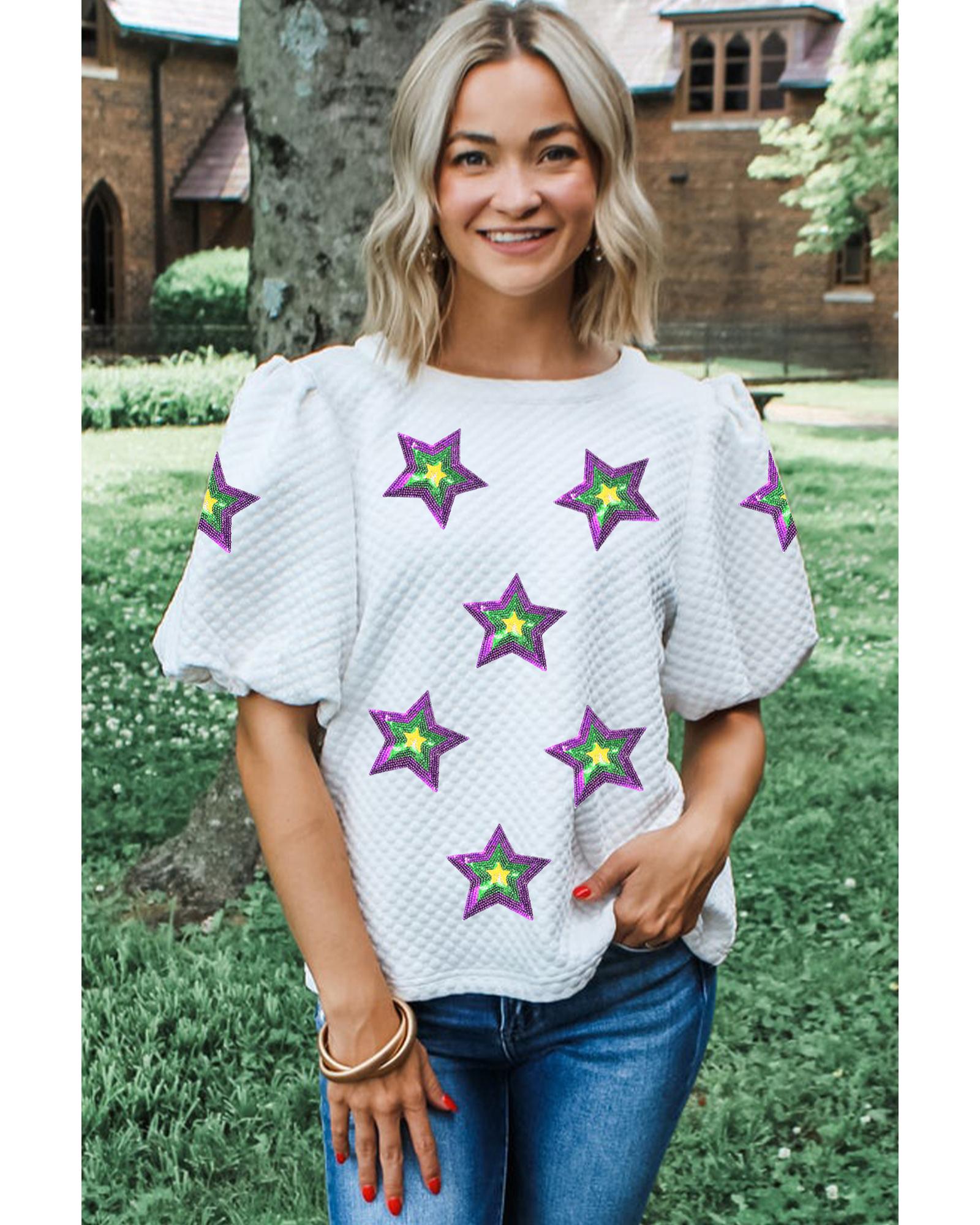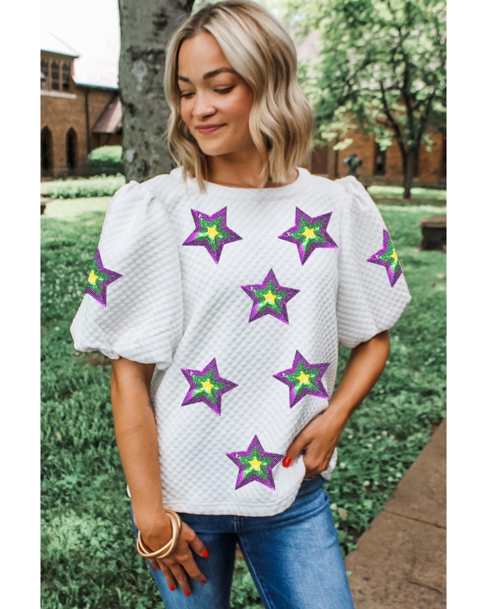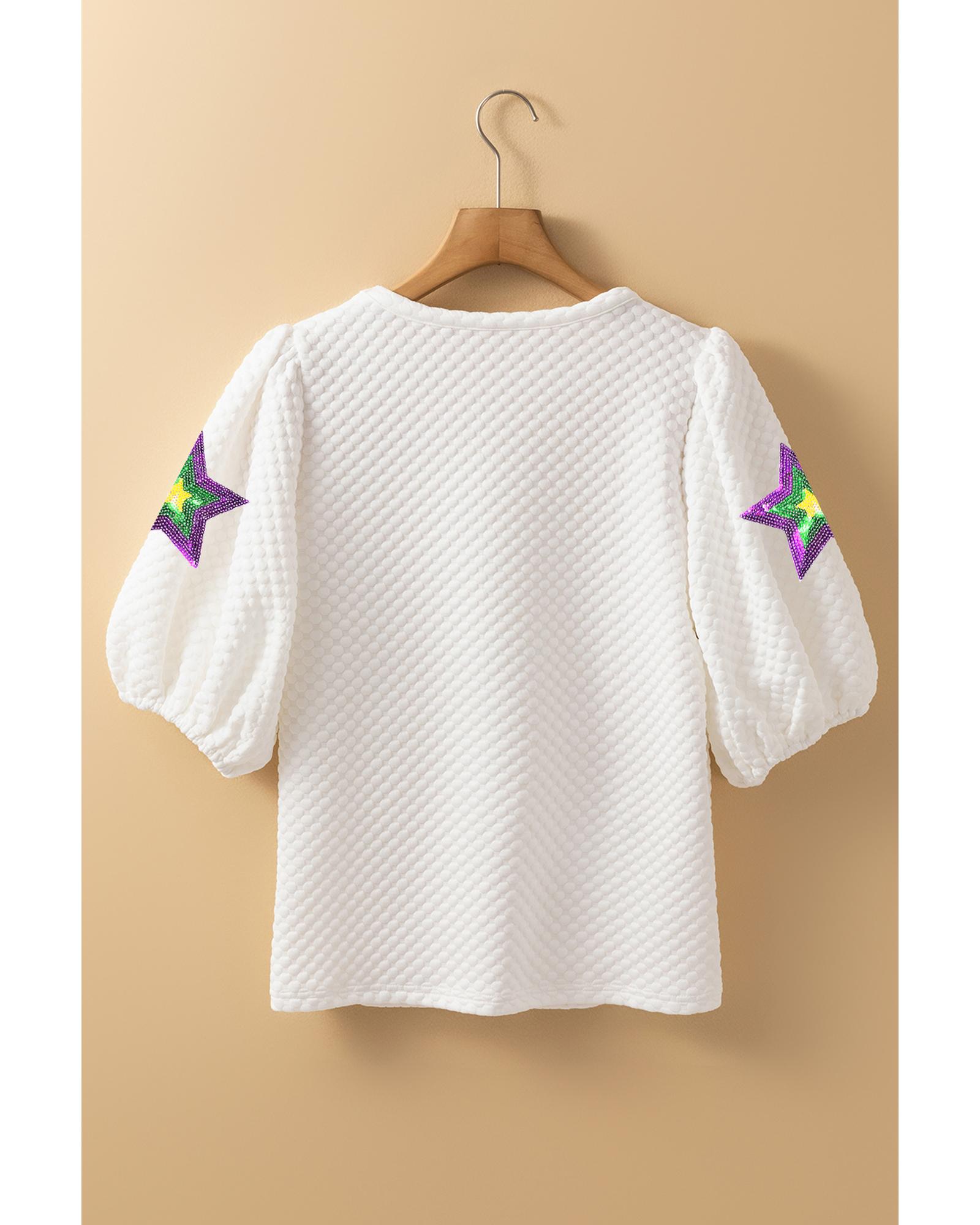 White Textured Sequin Mardi Gras Star Graphic Puff Sleeve Blouse – S
