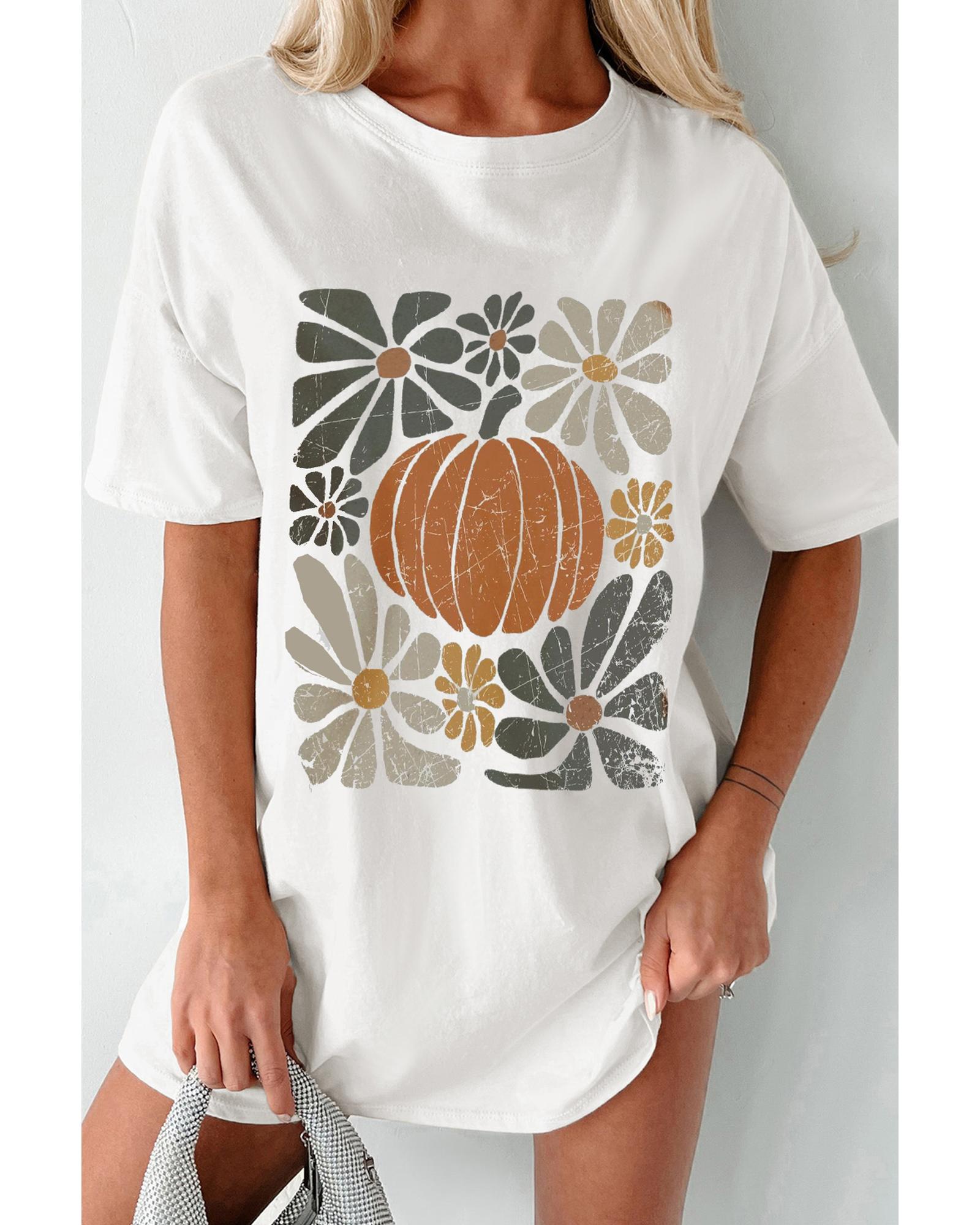 This white Thanksgiving pumpkin print loose crewneck tunic T-shirt offers a comfortable and stylish option for casual wear. Its charming pumpkin and floral design makes it suitable for festive occasions and everyday outings. The classic crew neck and loose fit provide a relaxed and versatile look that pairs well with various outfits.