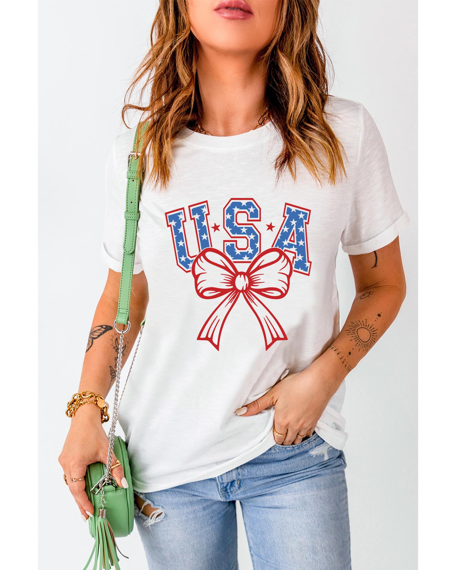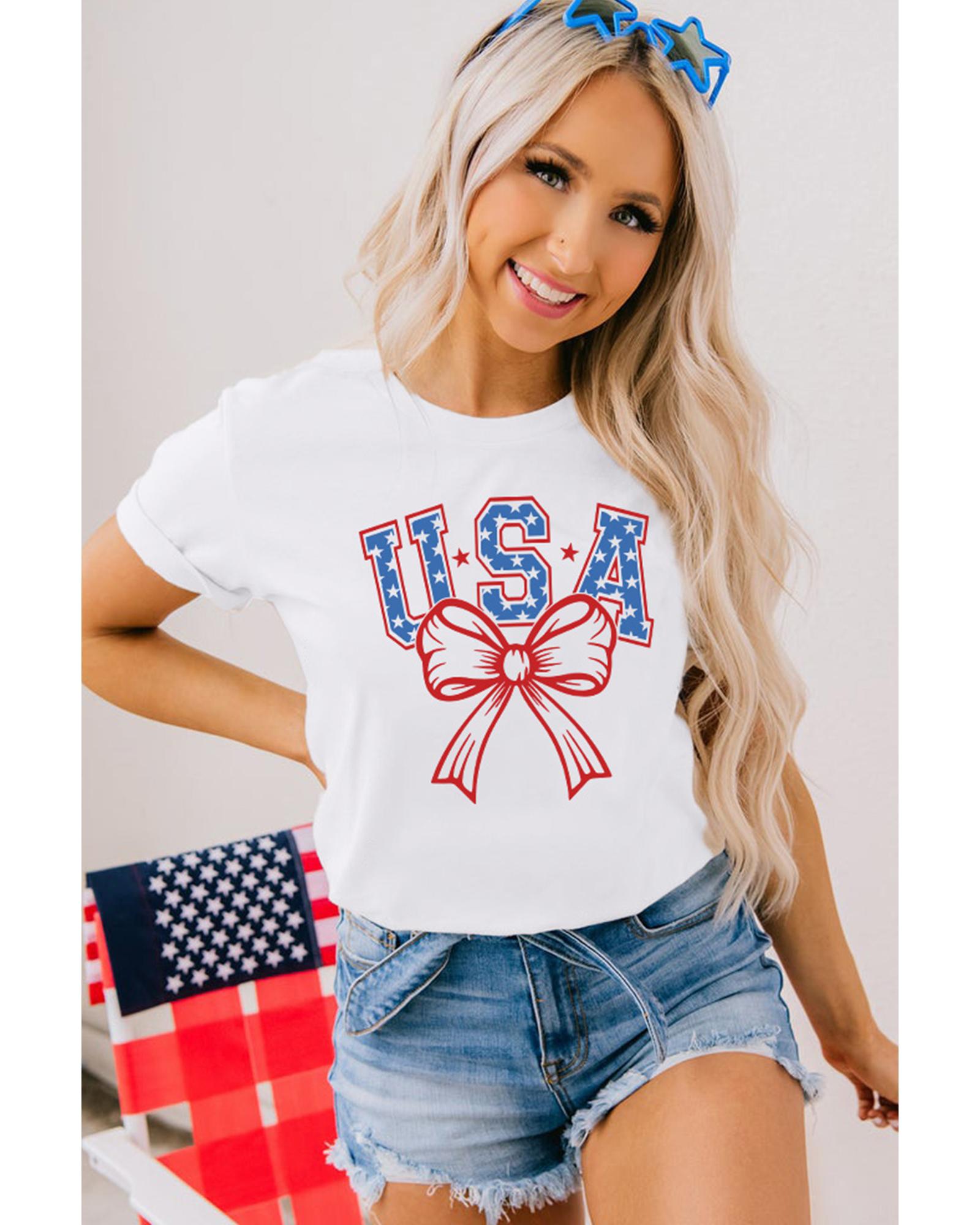 White USA Bow Letter Graphic Short Sleeve Top – XL