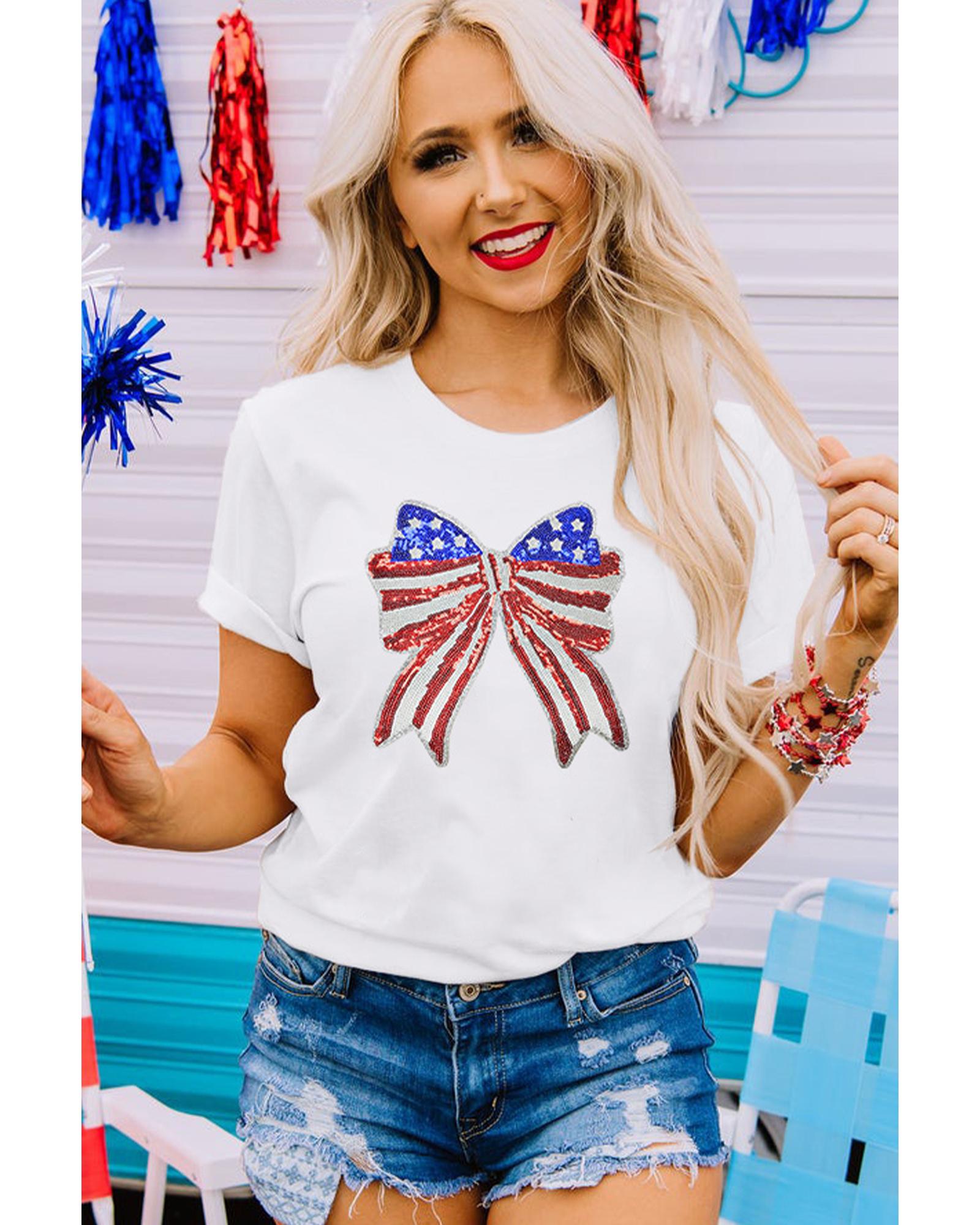 This T-shirt features a charming bow knot design with a USA flag pattern, combining style and comfort. It is made from soft, breathable fabric suitable for everyday wear. The crew neck and short sleeves provide a relaxed, casual look, making it ideal for various occasions. Available in multiple sizes, it offers a true-to-size fit for comfortable wear.