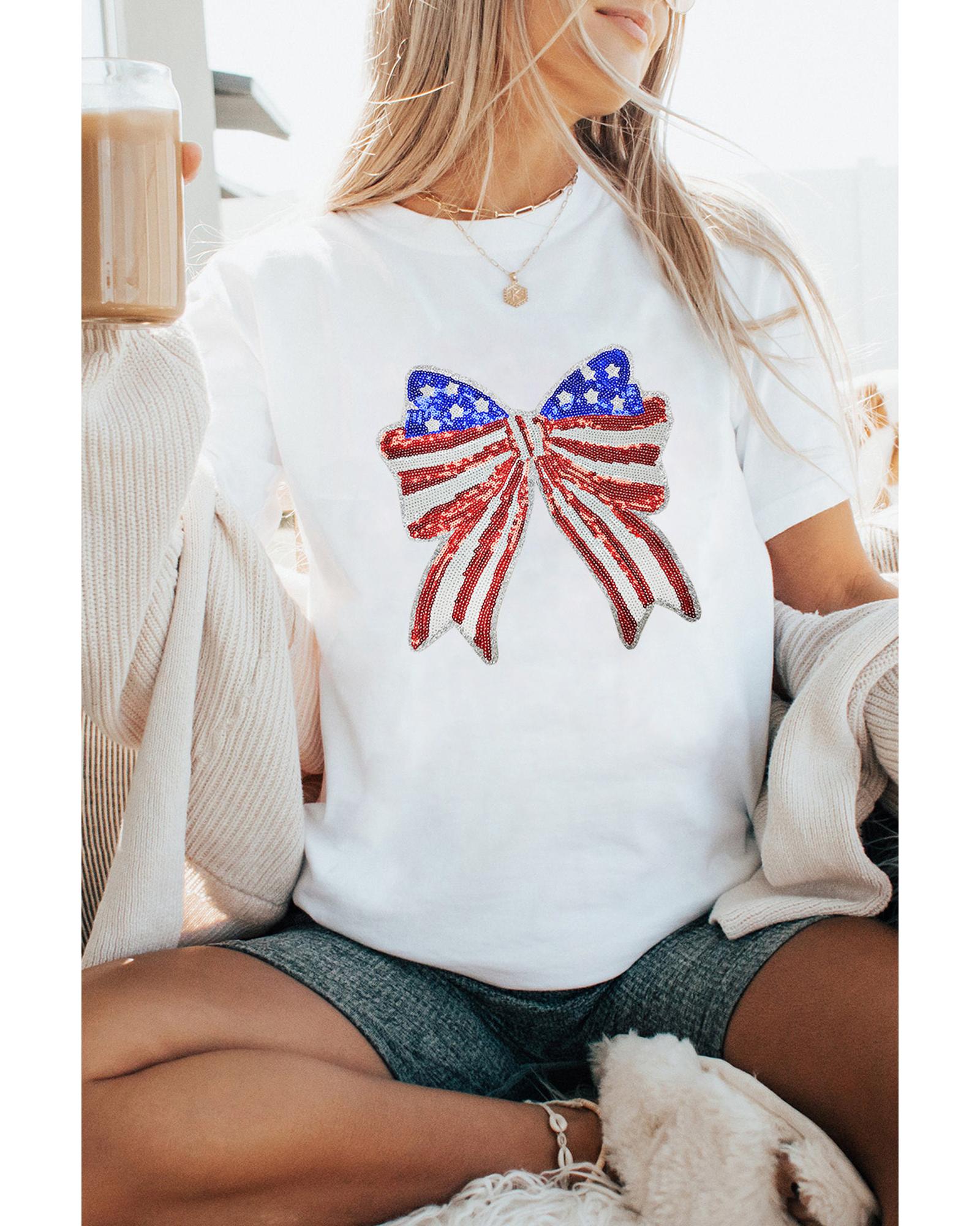 White USA Flag Bow Knot Patched Crew Neck T Shirt – M