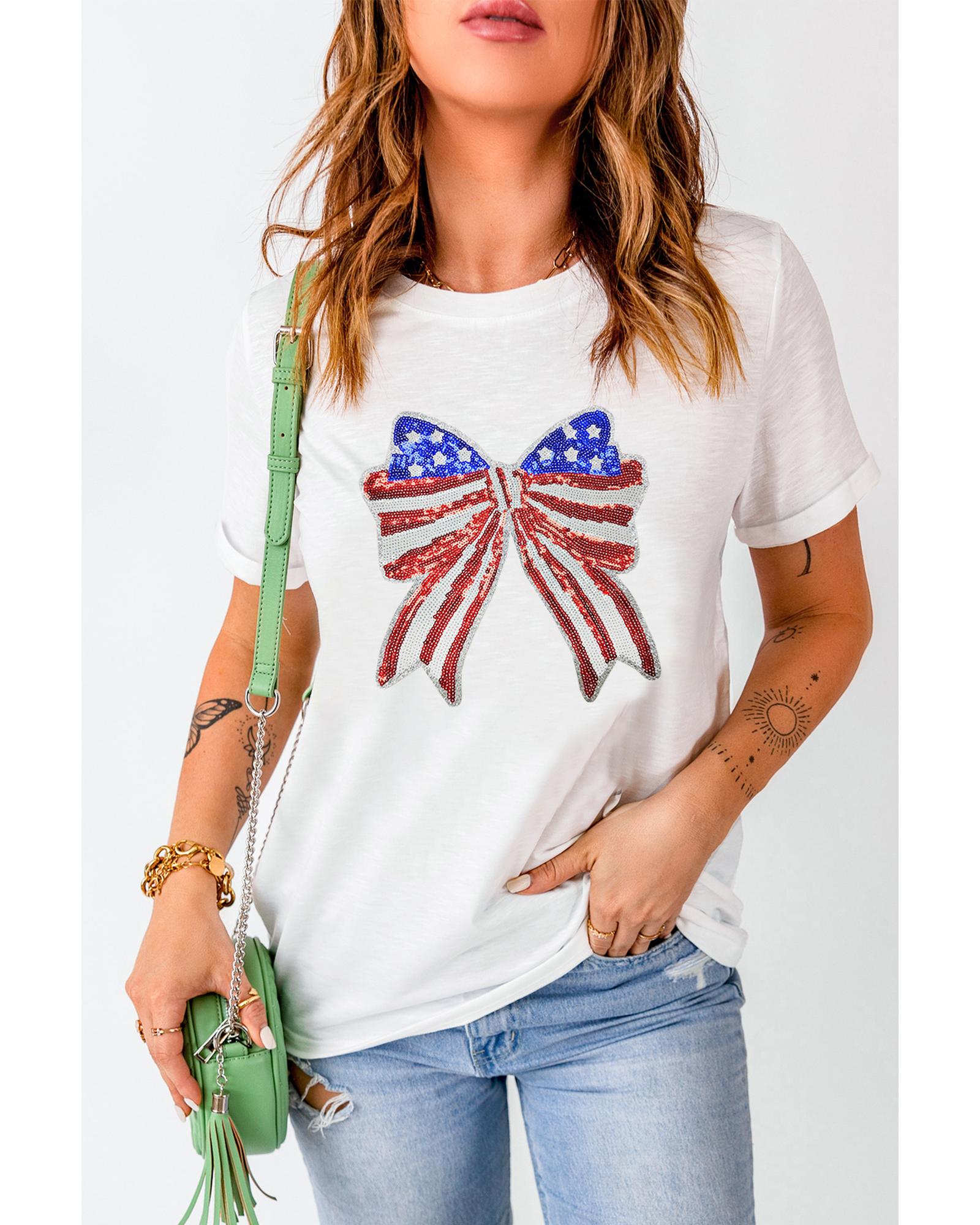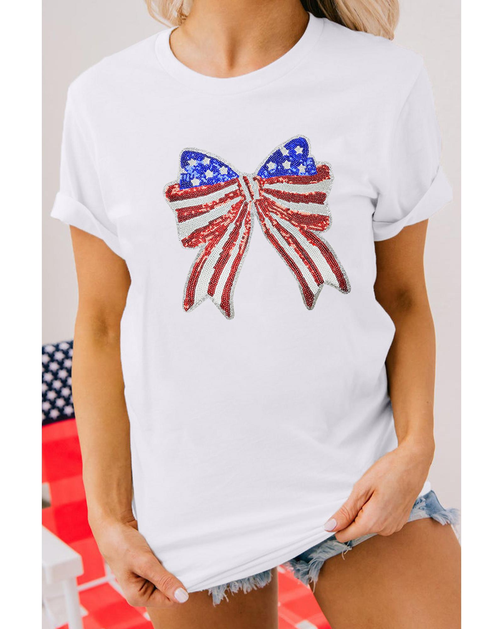 White USA Flag Bow Knot Patched Crew Neck T Shirt – XL
