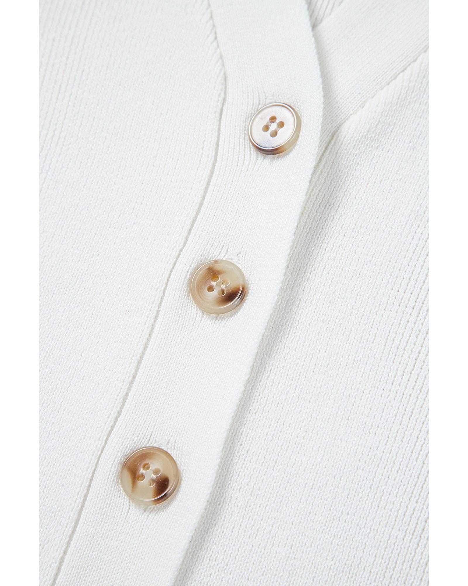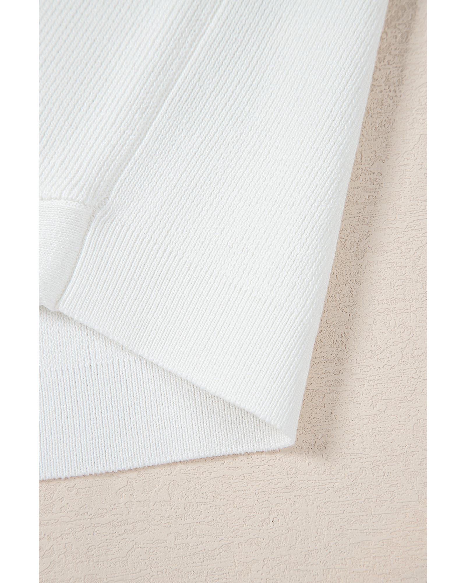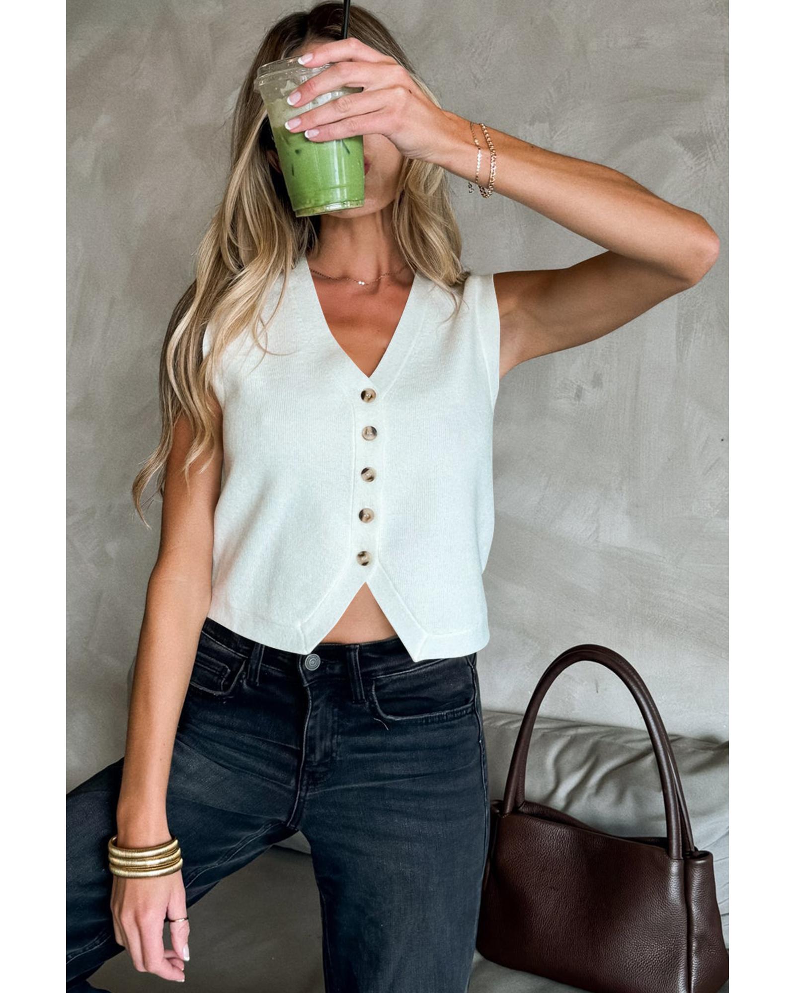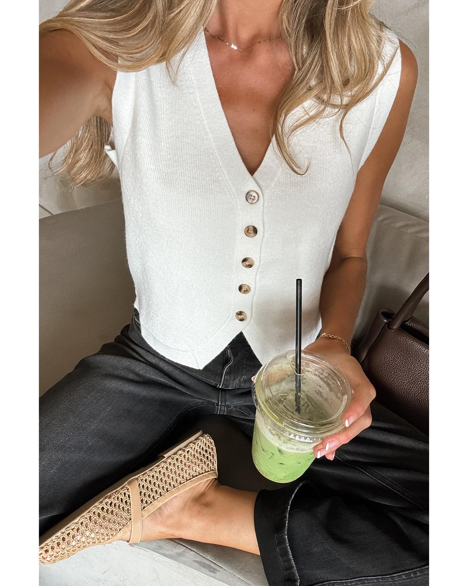 This white V neck buttoned sweater vest offers a classic yet feminine style with a versatile design suitable for various outfits. It features a stylish V neckline and a practical button front closure, making it an ideal piece for layering or wearing alone. Designed with a trendy fitted look, it provides a fashionable appearance that can be easily paired with different clothing items.
