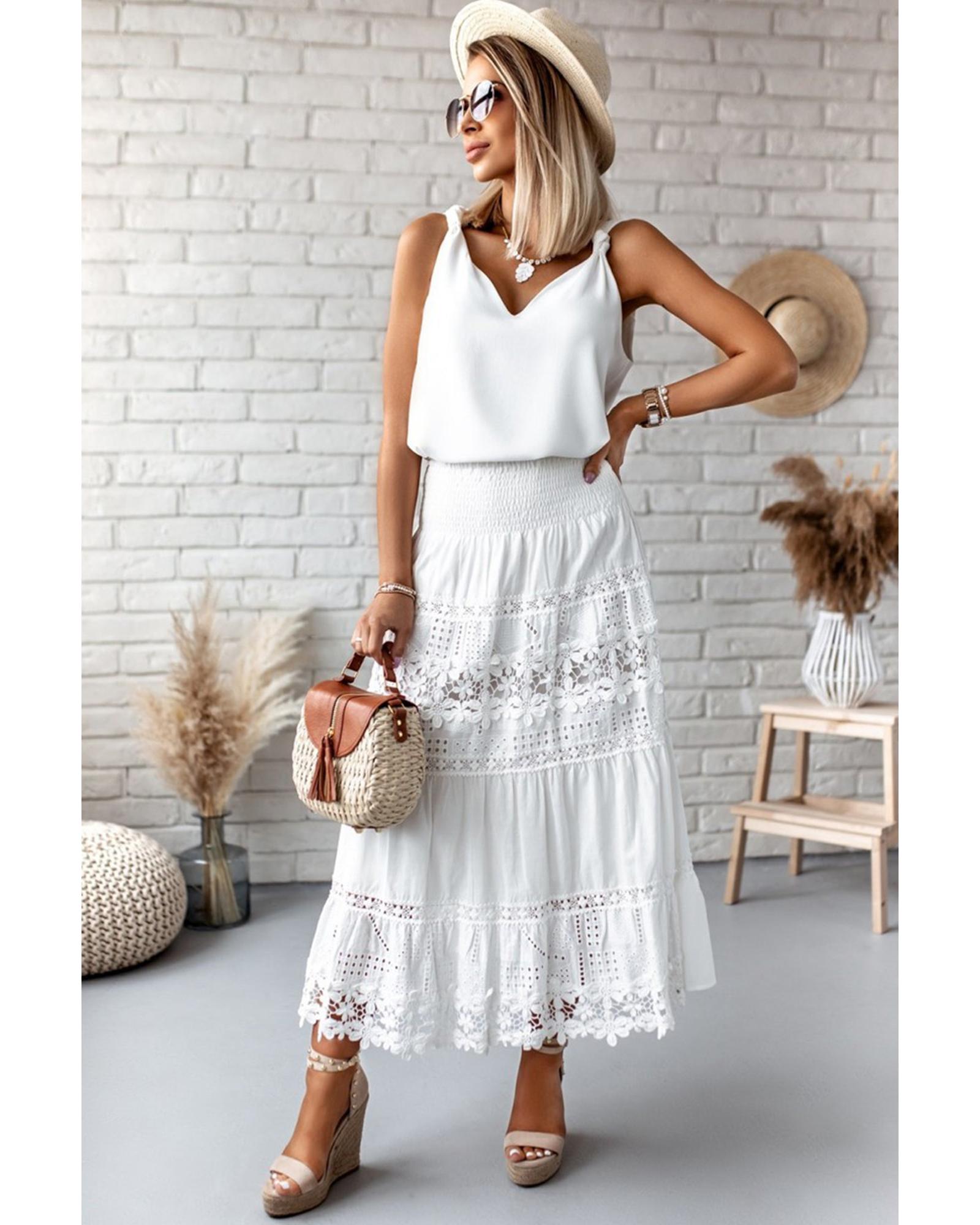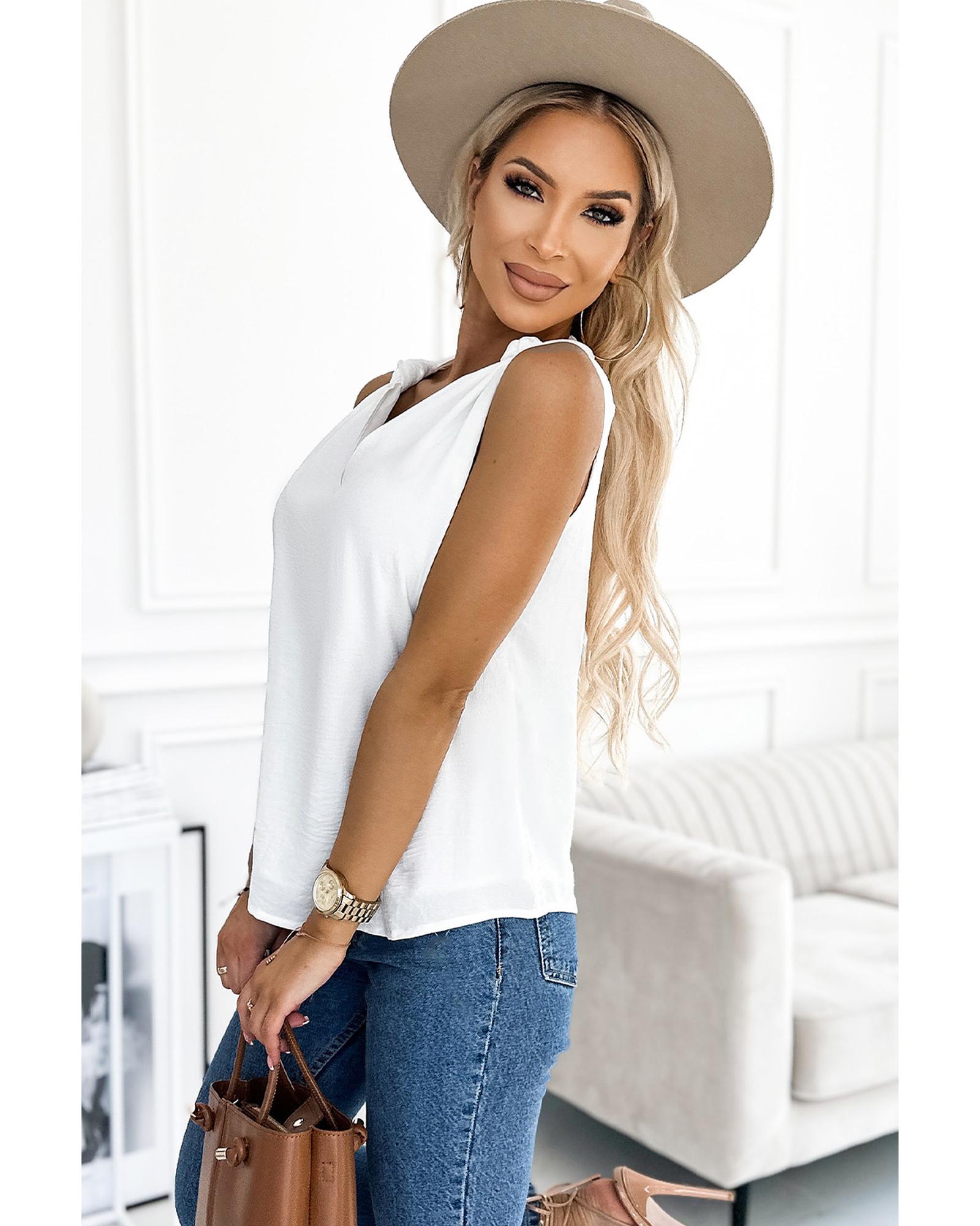 This white V neck knotted shoulder vest offers a stylish and cool summer look with a trendy fitted design. It features a sleeveless cut and a unique knotted shoulder detail, making it a versatile addition to your wardrobe. Crafted from quality materials, it ensures comfort for everyday wear.