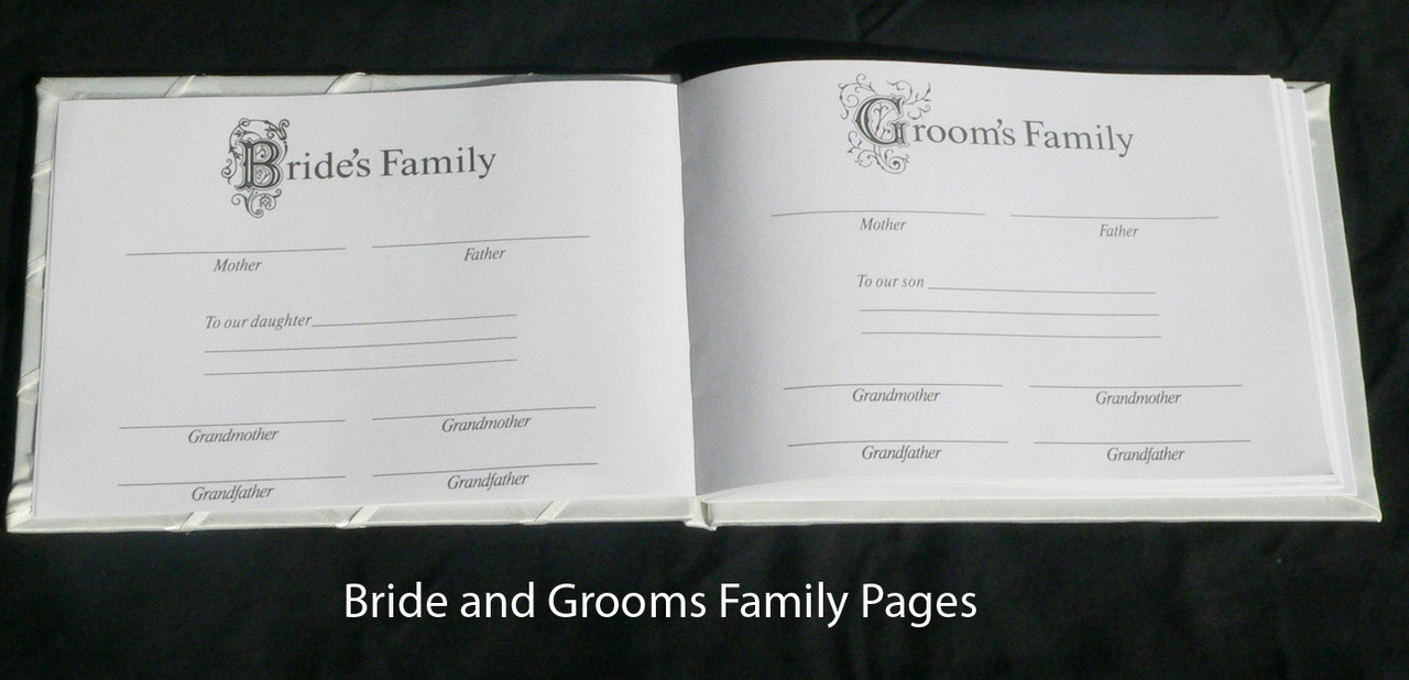 • Pages for special entries: bride and groom, bride’s family, groom’s family, wedding party members