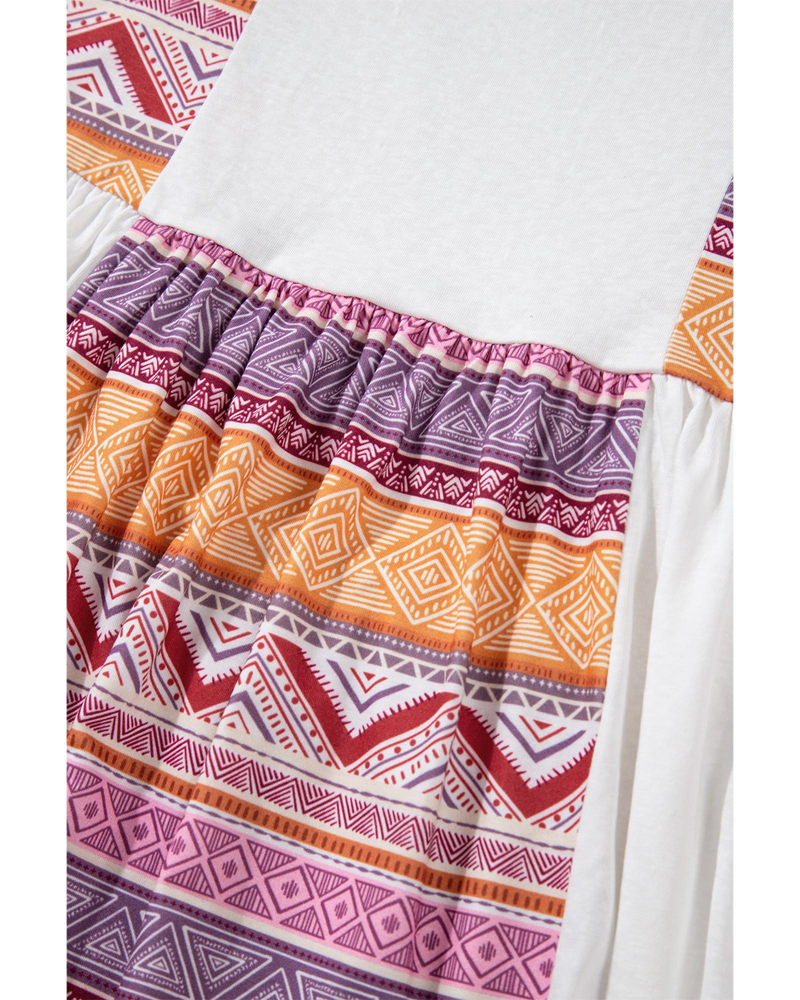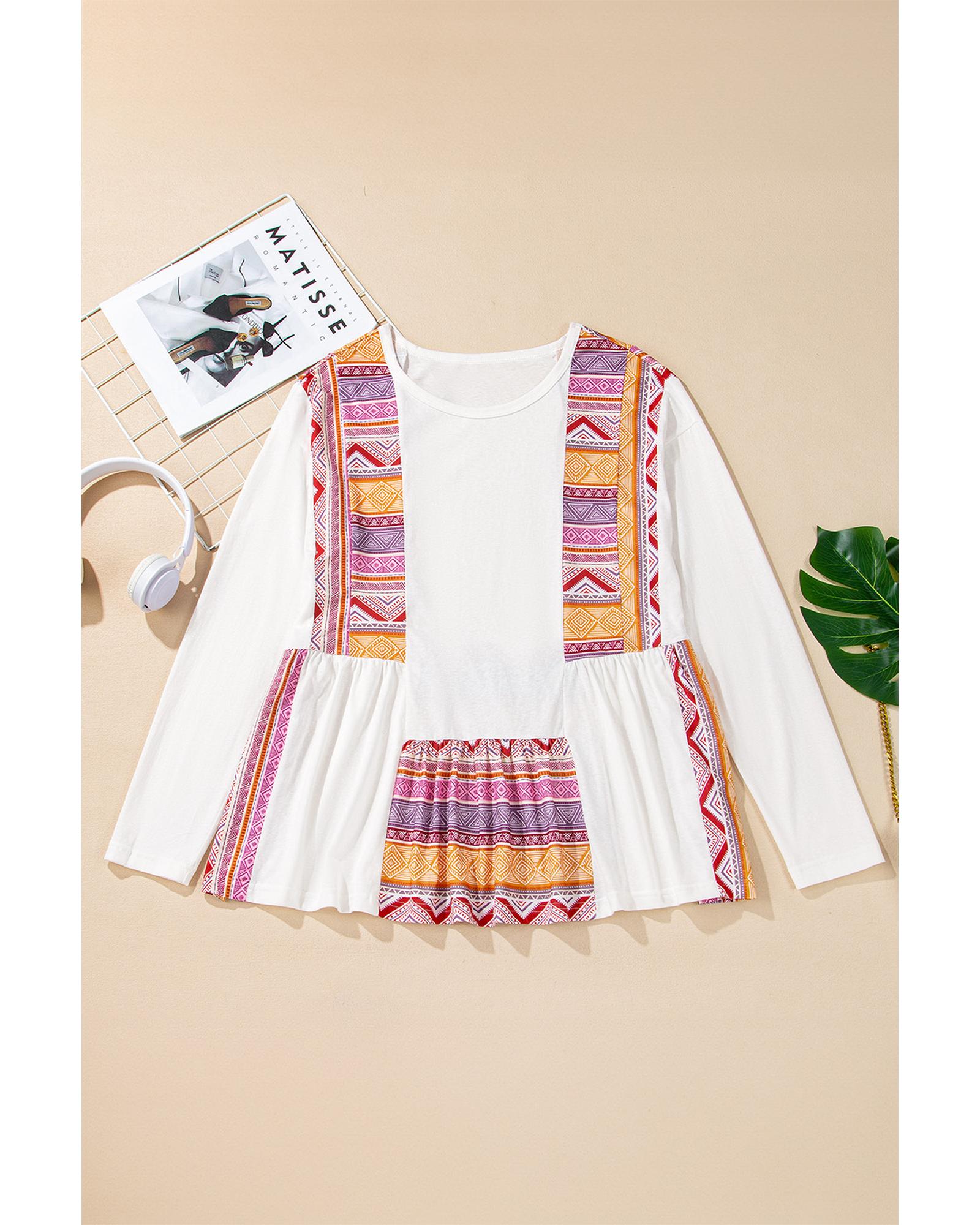 White Western Aztec Print Patchwork Ruffled Tunic Long Sleeve Babydoll Top – L