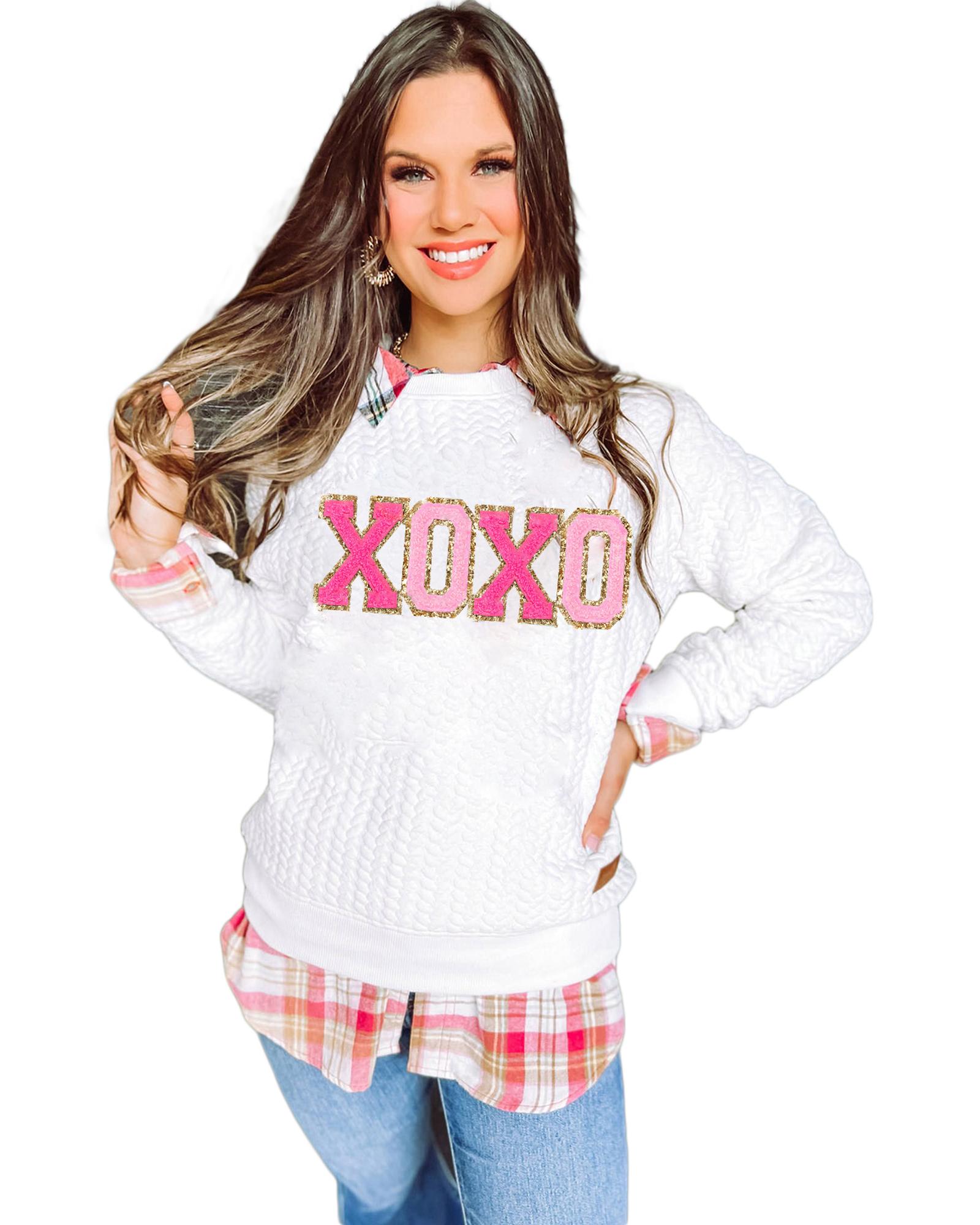 This stylish pullover sweatshirt features a glitter XOXO graphic and a classic cable knit pattern, offering a trendy and comfortable look. Designed with a fitted silhouette, it is suitable for pairing with jeans or leggings for casual wear. The soft material ensures comfort throughout the day.