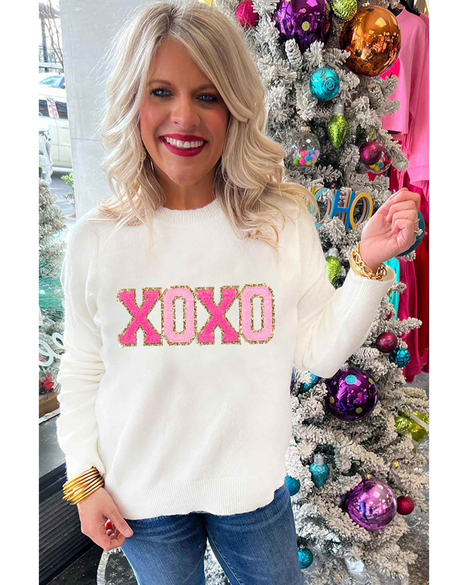 White XOXO Glitter Print Round Neck Casual Sweater – S