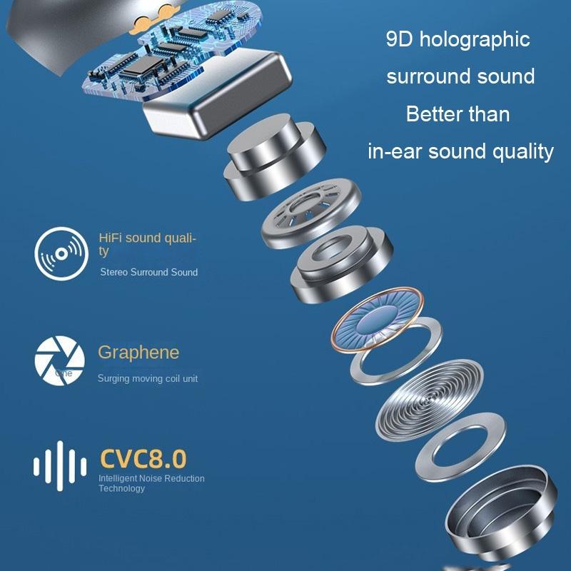 These wireless bone conduction earphones feature noise reduction technology, offering a comfortable and secure fit with an ear buckle design. They provide high-quality audio with 9D holographic surround sound and multi-tone hole design, making them suitable for various activities. The earphones are equipped with advanced Bluetooth 5.3 for stable connectivity, low latency, and efficient power consumption. They are waterproof and sweatproof, ensuring versatile use during different environments. The device supports automatic pairing, has an LED power display, and offers intelligent voice prompts for easy operation. A large-capacity portable charging compartment extends battery life, making these earphones ideal for long-term use.
