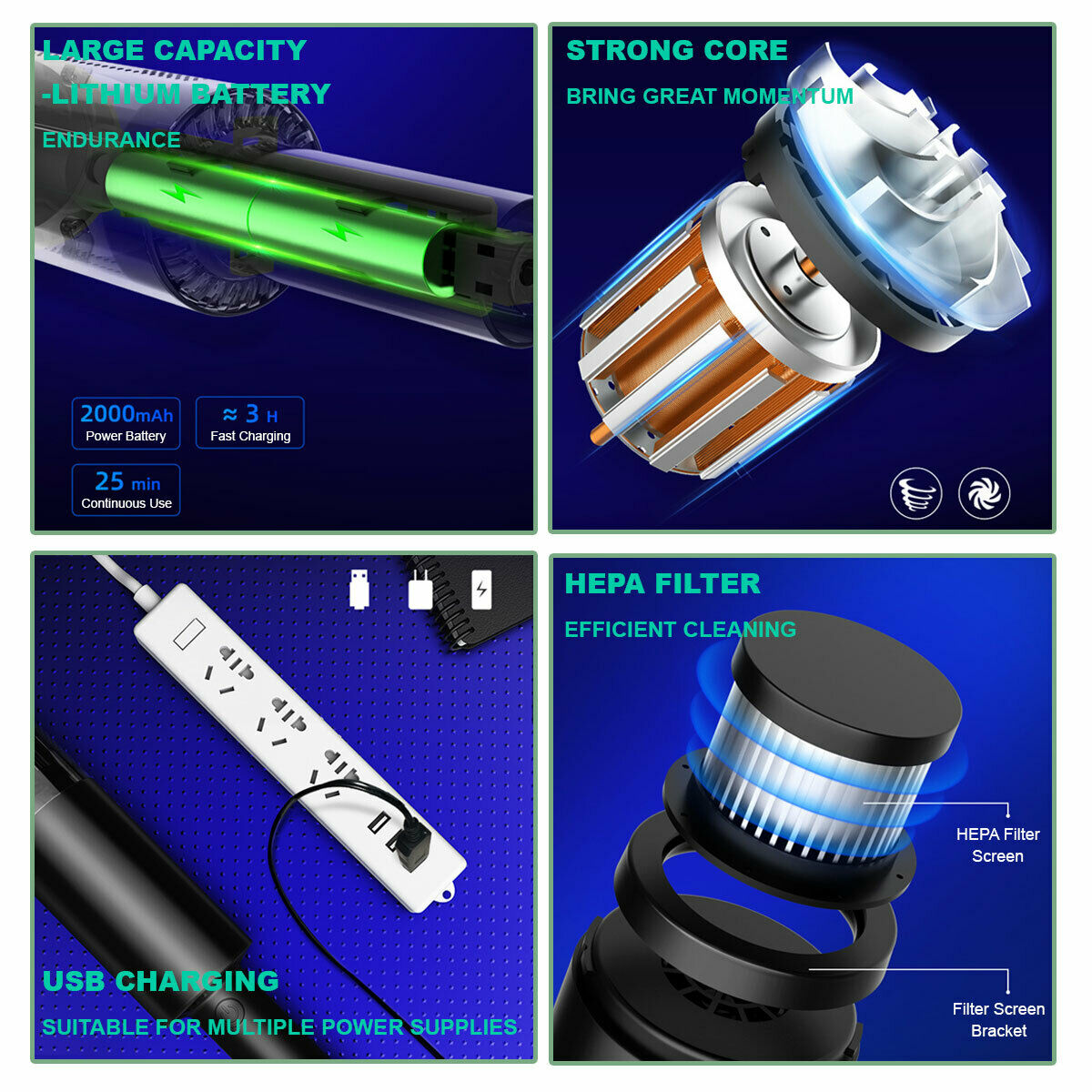 The wireless portable vacuum cleaner offers a powerful 6000Pa suction capability, making it effective for cleaning cars and homes. Its wireless charging feature provides convenient recharging without cords, ensuring hassle-free operation. Compact and lightweight, it is designed for easy handling and storage, suitable for various cleaning tasks.