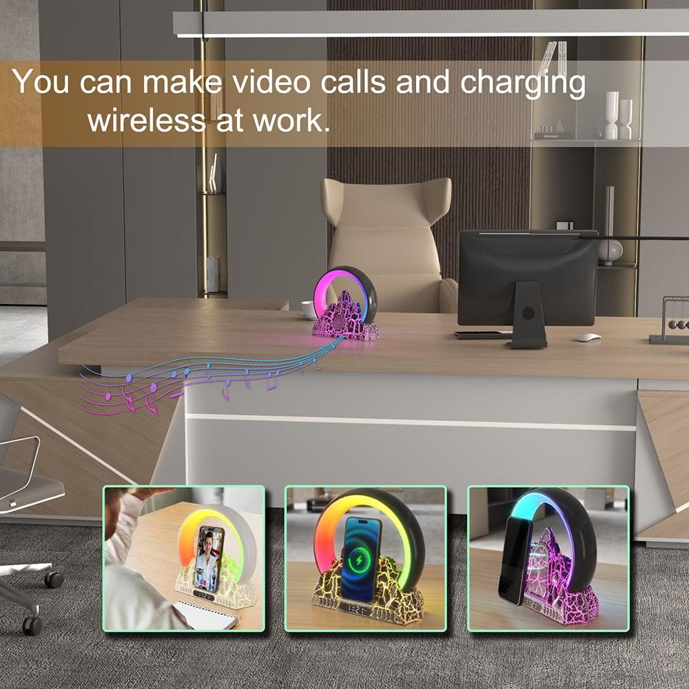 This multifunctional device combines a wireless charger, alarm clock, and Bluetooth speaker in a sleek design. It features vibrant lighting effects inspired by sunrise flames, with multiple color options and dynamic modes. The built-in Bluetooth speaker delivers high-quality sound, and the device includes white noise music options to help with sleep. Easy-to-use controls for the clock, alarm, and radio functions are integrated, along with app control for lighting effects. Additionally, it supports wireless charging and vertical video calls.