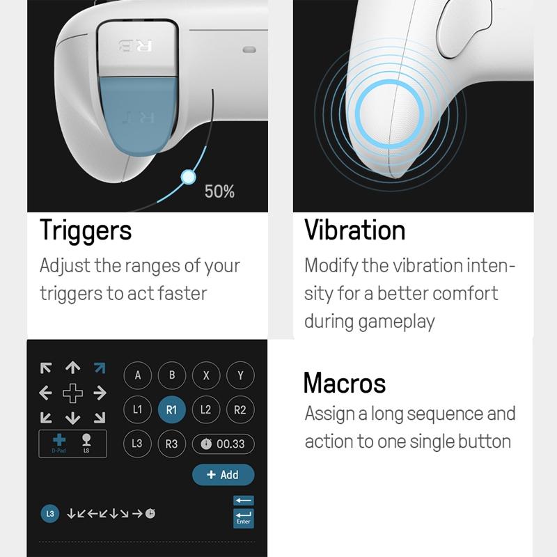 - Design features: Natural grip angle of 13 degrees, full support for freedom of movement, pebble 3D modeling, slightly curved small bevel face triggers, high-precision rocker with sea wave non-slip profile, full-fit contact charging with gold-plated contacts, close signal connection via data cable, dual chip stability for faster decoding, dual centrifugal force vibration, linear elastic triggers, multi-level cross keys