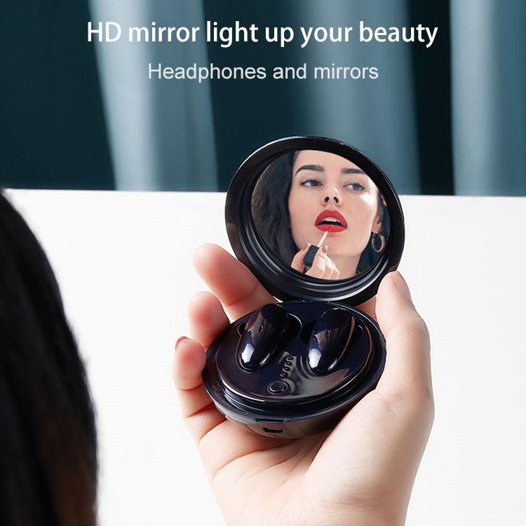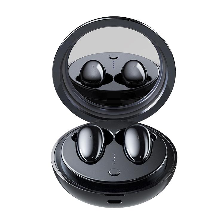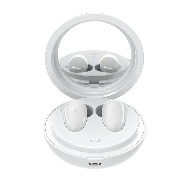 This wireless stereo earphone set includes a charging box, offering high-quality sound and long-lasting battery life. It features touch operation, Bluetooth 5.0 low-power chip, automatic pairing, and a master/slave switch. The design combines headset and mirror functions, making it convenient for makeup application. It provides a transmission distance of at least 10 meters and a frequency response of 20-20KHz, suitable for various listening needs.