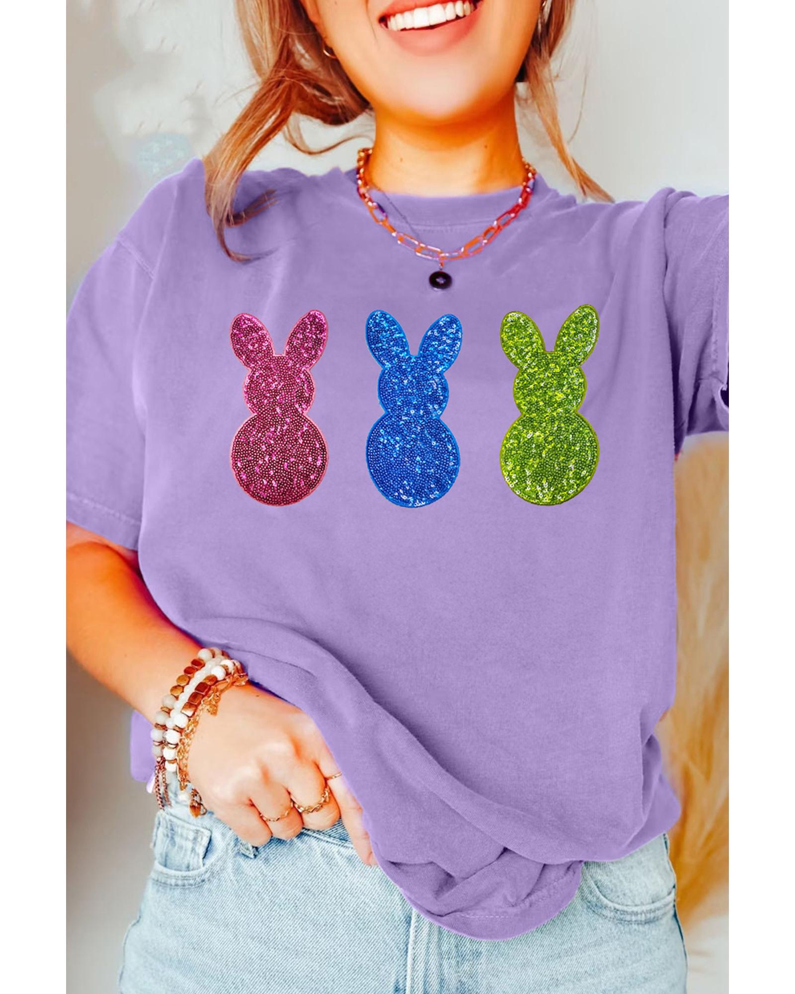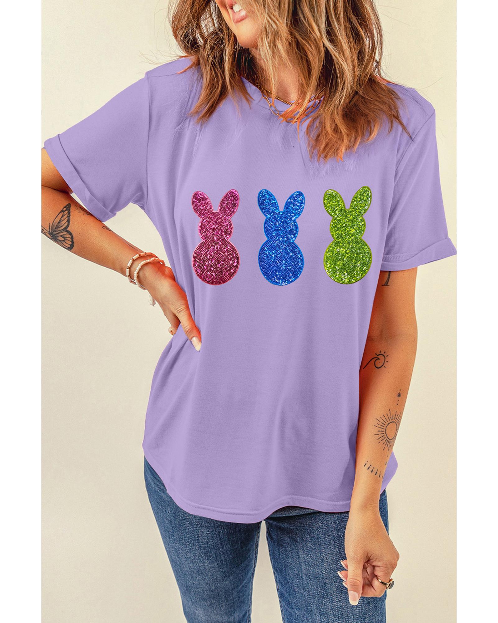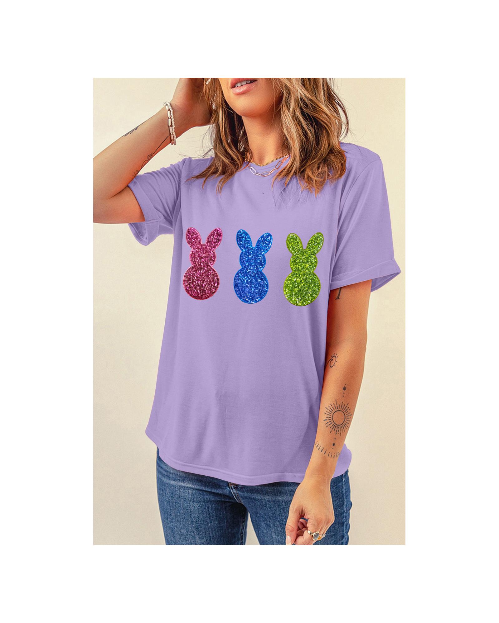 This Easter-themed crewneck T-shirt features playful bunny patterns with a shiny finish, making it a fun and festive addition to your wardrobe. Designed for comfort and casual style, it is suitable for various casual occasions and easy to pair with jeans or denim shorts.